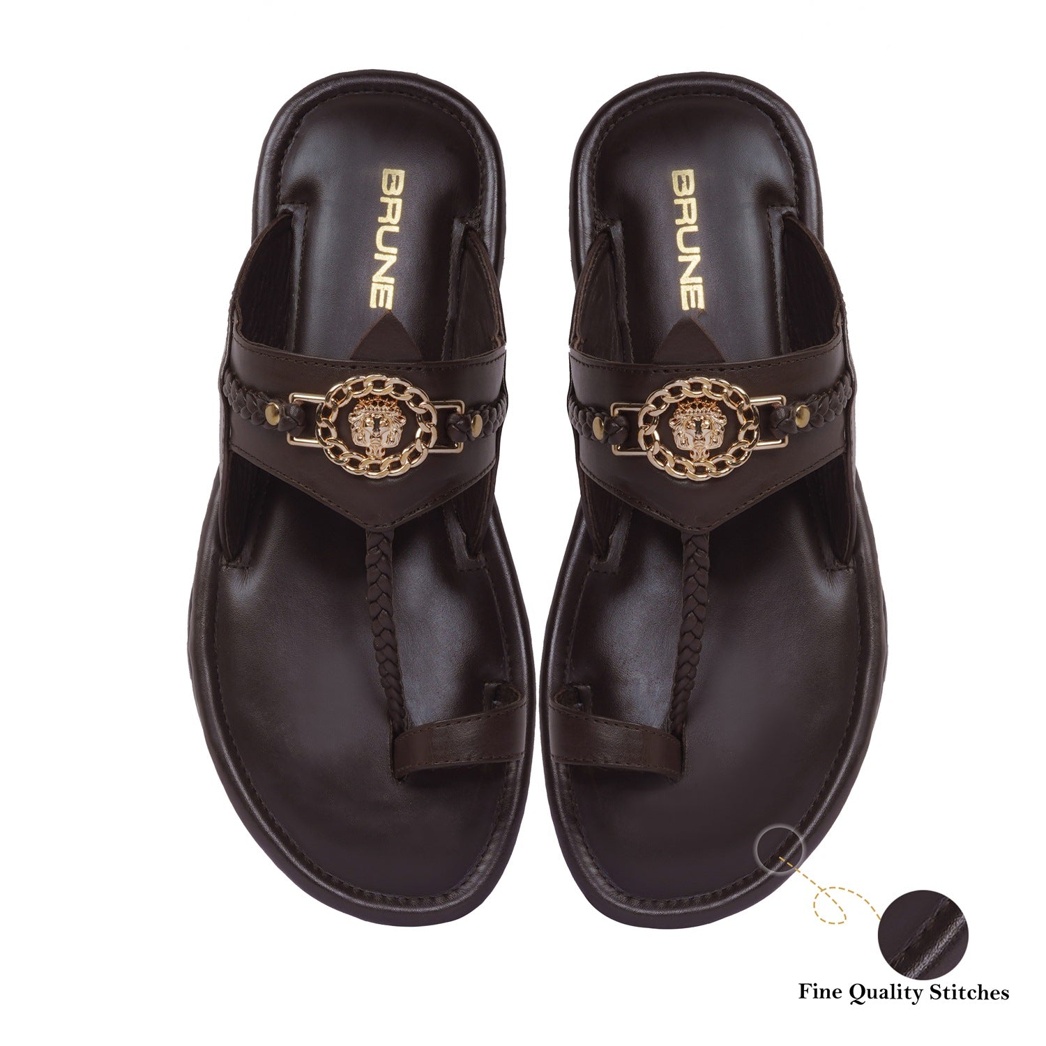 Experience the rich tradition of Kolhapuri craftsmanship with our Dark Brown Slipper. Made from premium quality genuine leather and handcrafted with intricate details, this slipper is the perfect addition to your traditional footwear collection. Its T-Bar weaved style strap and gold finish metal lion buckle with chain embellishment add a touch of elegance. Designed for utmost comfort with a super soft anti-skid rubber sole, this slipper is perfect for any occasion. From ethnic to traditional dresses, this slipper is the perfect choice for men who value both style and comfort.