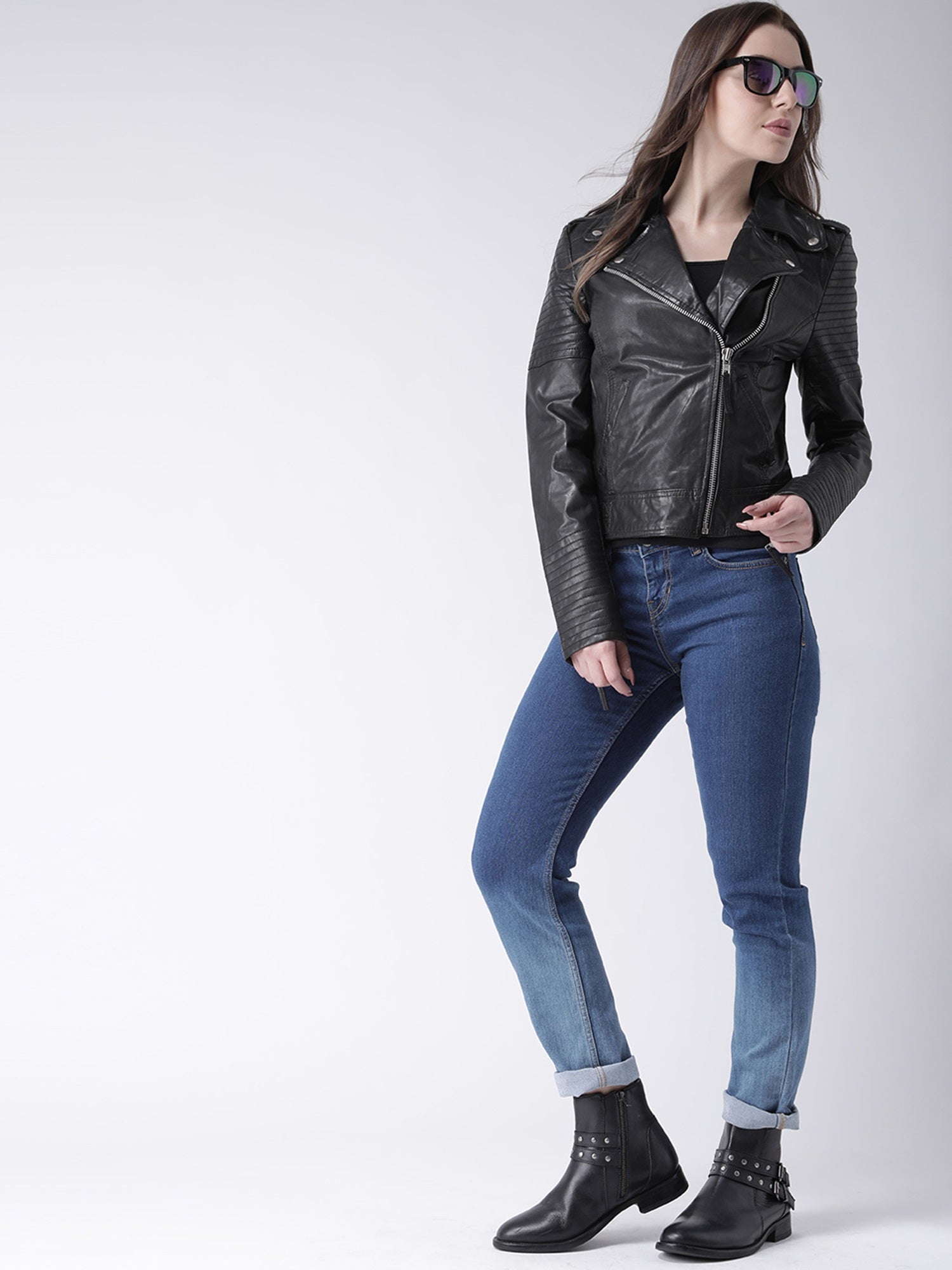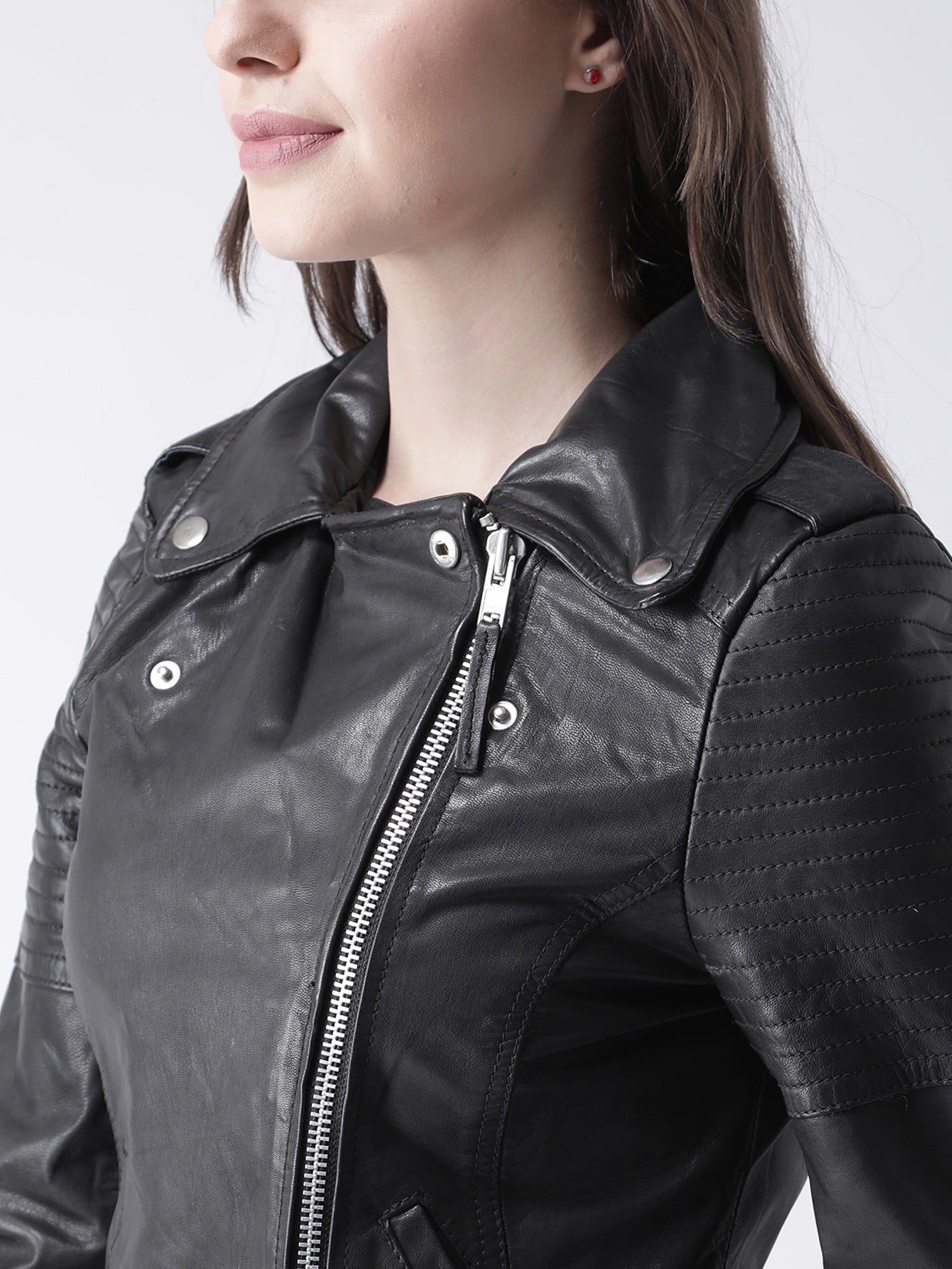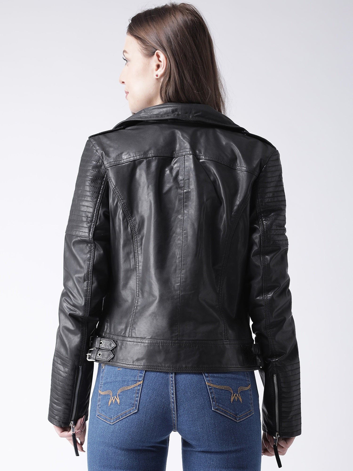 The Black Color Classic Leather Biker Jacket for Women by Brune & Bareskin gives a timeless edge to any outfit. Inspired by the aesthetic of the rock music scene, the asymmetrical zip fastening, side buckle straps and pattern on shoulder of this jacket transforms your look to help you steal the spotlight wherever you go. This iconic color is the must have in your leather collection. Sure to go with everything. Get your jacket in this luxurious color today.