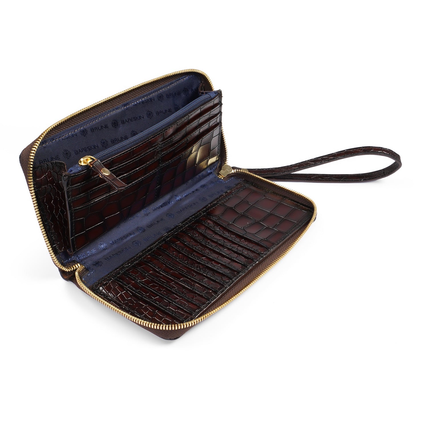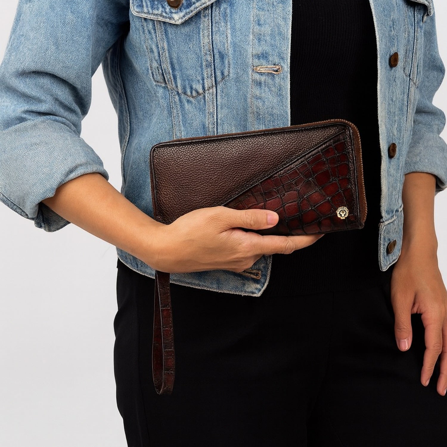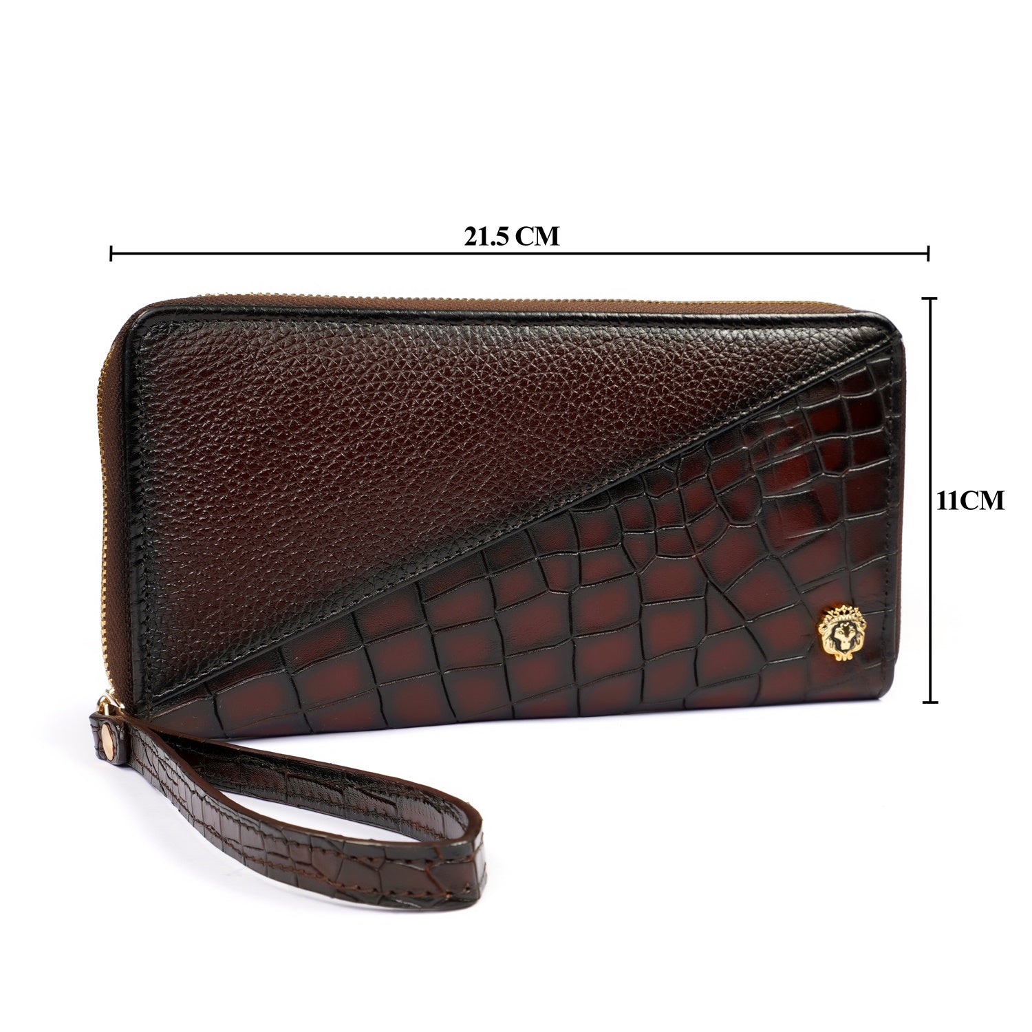 This Ladies Clutch/Wallet is the perfect luxury accessory for any fashionista. Crafted from dark brown center stitched silhouette deep cut and textured leather, and featuring Brune & Bareskin's iconic patina finish, it is the epitome of high-end fashion. Plus, its durable leather construction ensures it will last! Look for the signature mini metal lion on the front. The zipper closure ensures the security of your belongings, offering both convenience and peace of mind. Inside, you'll find a thoughtfully designed interior that caters to your organizational needs. The multi compartments provide ample space for your essentials, including a dedicated zipper pocket for those items that require extra safeguarding. Unveiling its versatility, the clutch/wallet boasts multiple card slots, allowing you to keep your cards neatly organized and easily accessible. Meanwhile, the long pocket designed for cash is a seamless fusion of practicality and elegance, accommodating your financial essentials with flair.