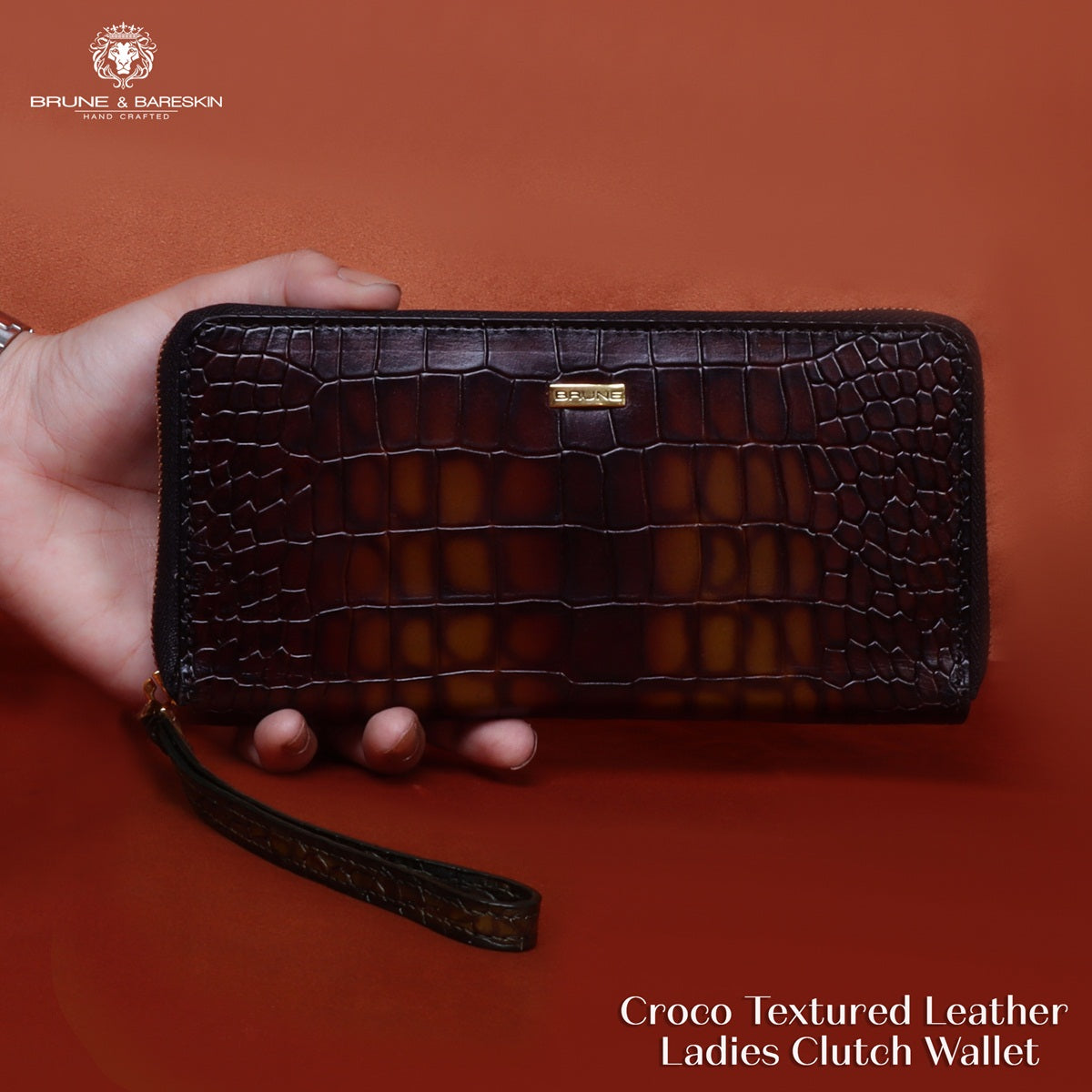 Elevate your style with the exquisite ladies clutch/wallet brought to you by the renowned artisans at Brune & Bareskin. Crafted with precision and passion, this accessory showcases a mesmerizing Smokey tan croco-textured leather that exudes an air of sophistication and luxury. Handmade with unwavering attention to detail, this clutch/wallet is a testament to the skilled craftsmanship that Brune & Bareskin is celebrated for. The intricate artistry invested into every aspect of its creation results in a piece that stands as both a fashion statement and a functional companion. The smokey tan croco texture lends a distinctive character to the accessory, creating an arresting visual and tactile experience. The texture draws you in, inviting you to run your fingers across its surface and appreciate the finesse that goes into its crafting. What truly sets this clutch/wallet apart is the delicate hand coloring that adorns it. Each shade and hue is thoughtfully applied by skilled hands, resulting in a unique and captivating appearance that resonates with individuality and charm. The zipper closure ensures the security of your belongings, offering both convenience and peace of mind. Inside, you'll find a thoughtfully designed interior that caters to your organizational needs. The multi compartments provide ample space for your essentials, including a dedicated zipper pocket for those items that require extra safeguarding. Unveiling its versatility, the clutch/wallet boasts multiple card slots, allowing you to keep your cards neatly organized and easily accessible. Meanwhile, the long pocket designed for cash is a seamless fusion of practicality and elegance, accommodating your financial essentials with flair. In summary, the ladies' clutch/wallet with smokey tan croco-textured leather by Brune & Bareskin is a true masterpiece of artistry and functionality. From its handcrafted origins to the captivating hand coloring, every element of this accessory speaks to a commitment to excellence. With its multi compartments, zipper pocket, multi card slots, and dedicated cash pocket, it is more than an accessory; it's an indispensable companion that mirrors your refined taste and discerning style.