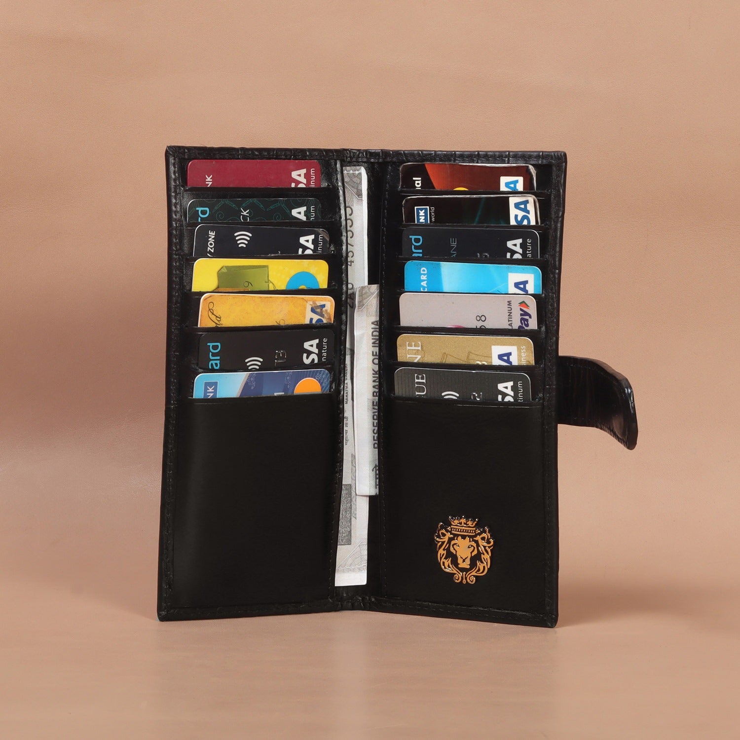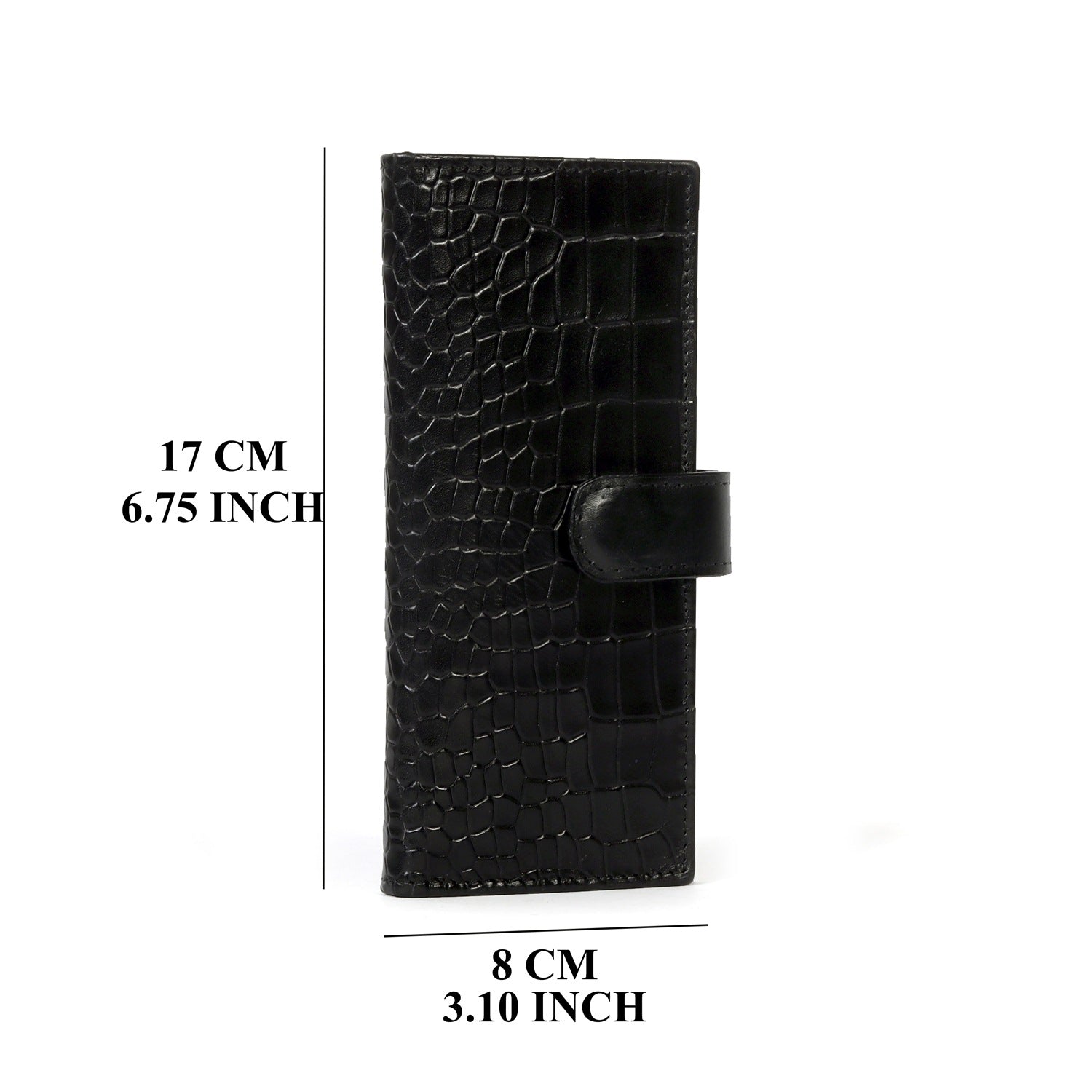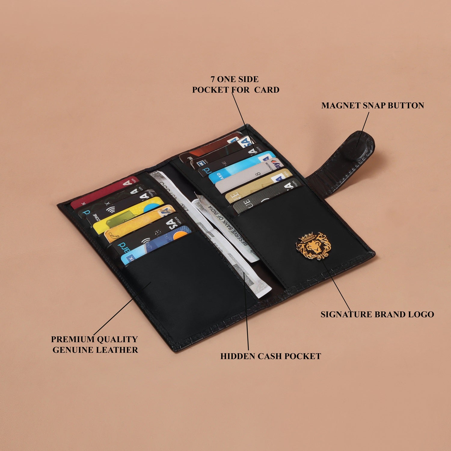 Meet your new favorite accessory - the BRUNE & BARESKIN Ladies Long Wallet. Hand crafted with deep cut croco textured leather, this bi-fold wallet boasts a sleek black color and a signature metal lion logo. Featuring 16 pockets and a smooth magnetic strap, it's the perfect buy for the modern generation. Stay organized and stylish with this must-have wallet.
