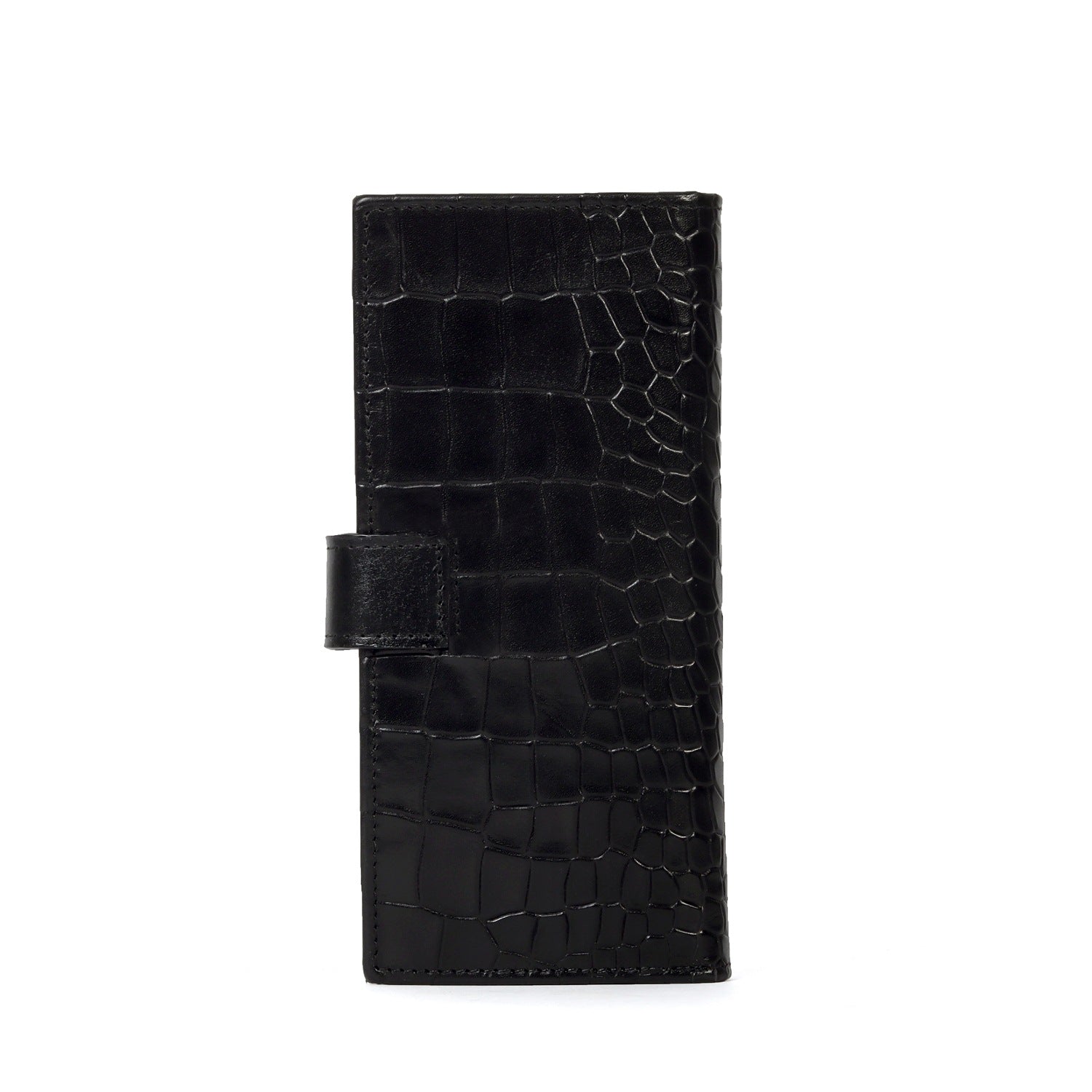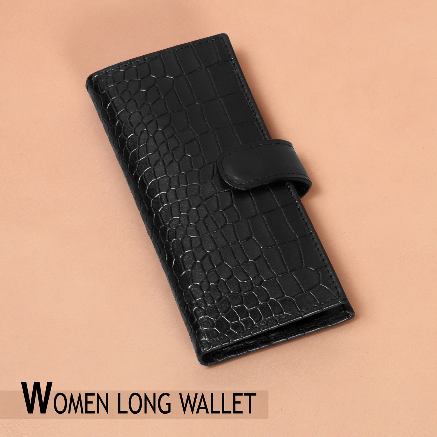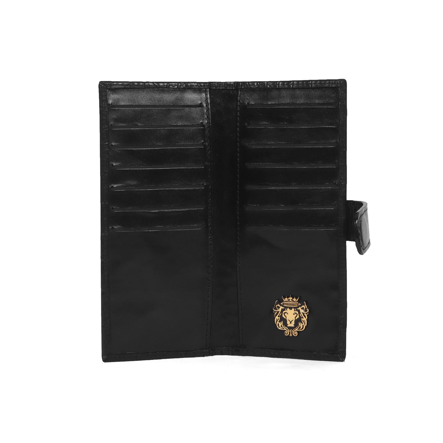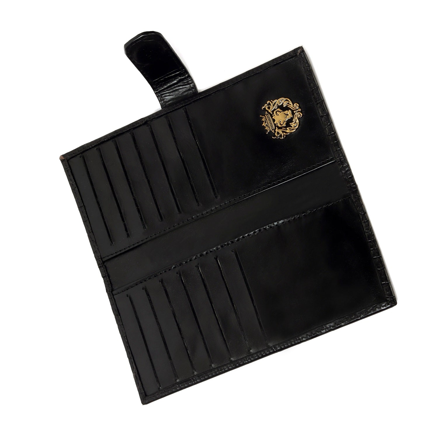 Meet your new favorite accessory - the BRUNE & BARESKIN Ladies Long Wallet. Hand crafted with deep cut croco textured leather, this bi-fold wallet boasts a sleek black color and a signature metal lion logo. Featuring 16 pockets and a smooth magnetic strap, it's the perfect buy for the modern generation. Stay organized and stylish with this must-have wallet.