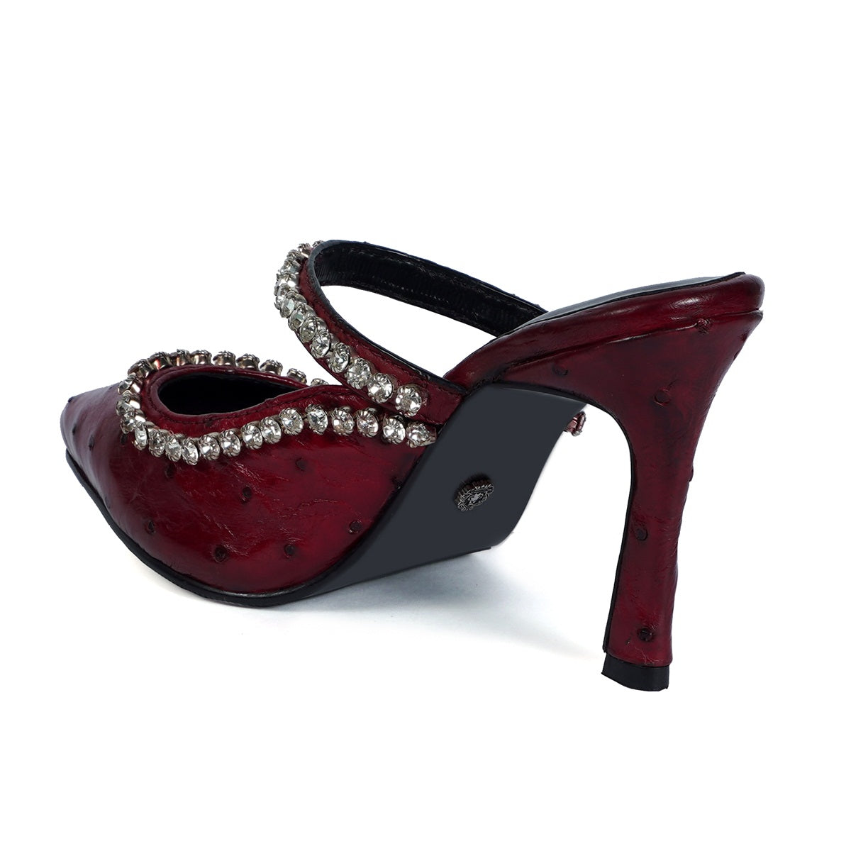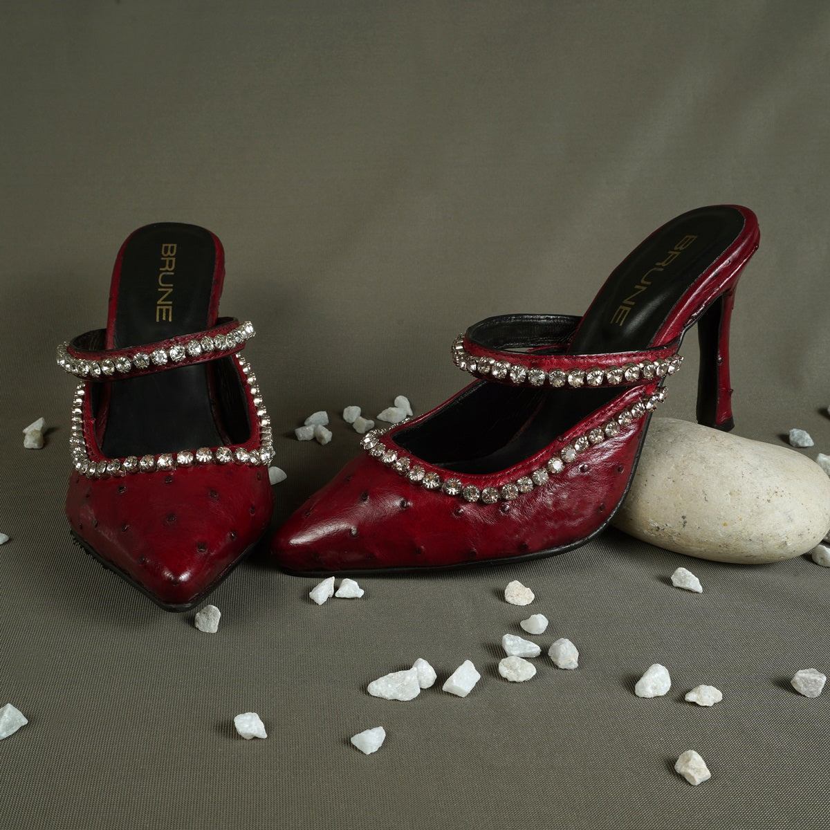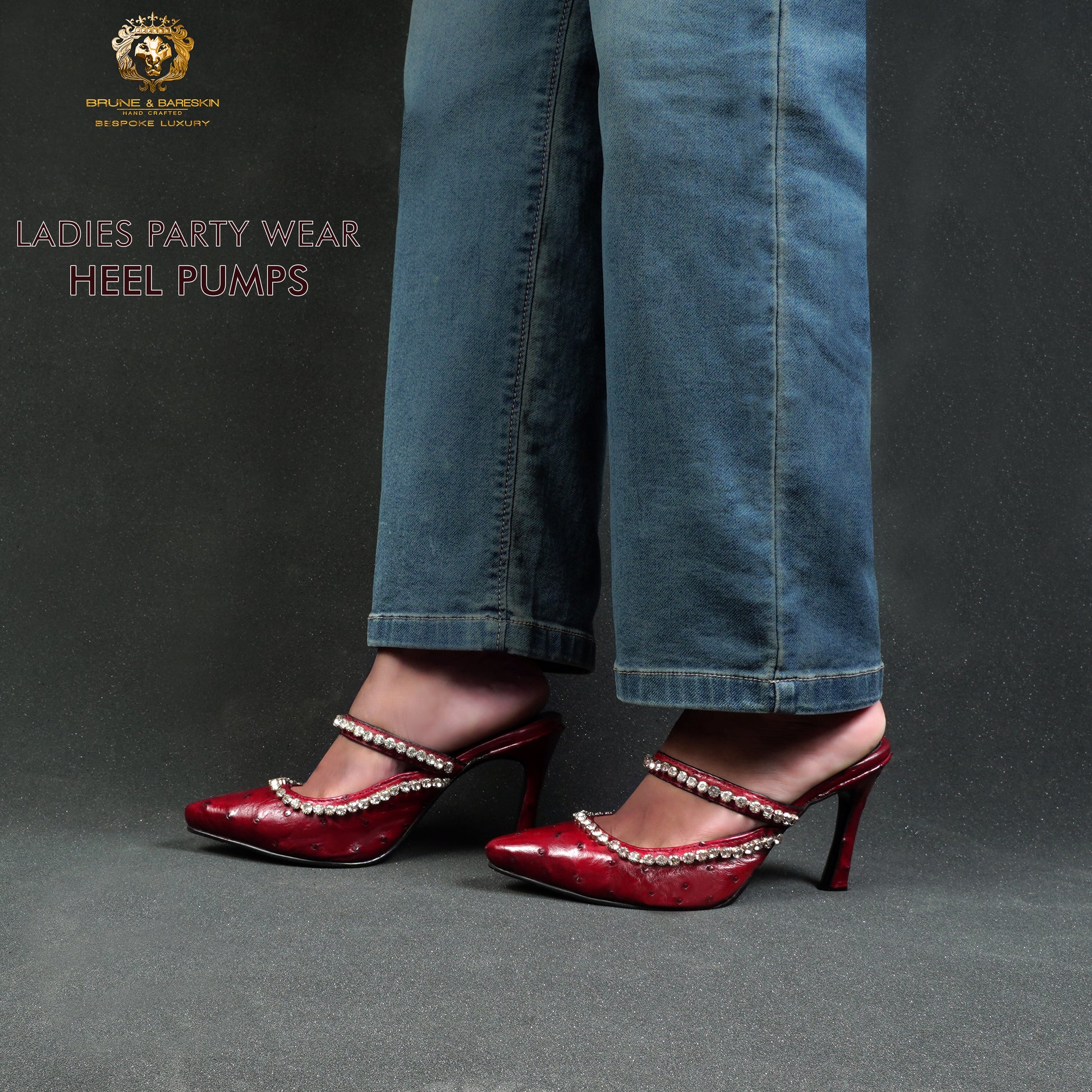 These Ladies Party wear Stiletto Heel Pumps in Exotic Wine Real Ostrich Leather are the perfect choice for adding a touch of class and elegance to any special occasion. Put a fashionable foot forward with this trendy pair of exotic ostrich leather heel pumps from Brune & Bareskin. Heel pumps from brune & bareskin featuring a pointed toe, a slim 90mm heel, an counter attach ankle strap and a branded insole. A pair of wine real ostrich leather Heel Pumps ,has regular ankle and open back embellished upper with western - embellished. For those special moments, why not treat your lady in life to these exquisite designer shoes?