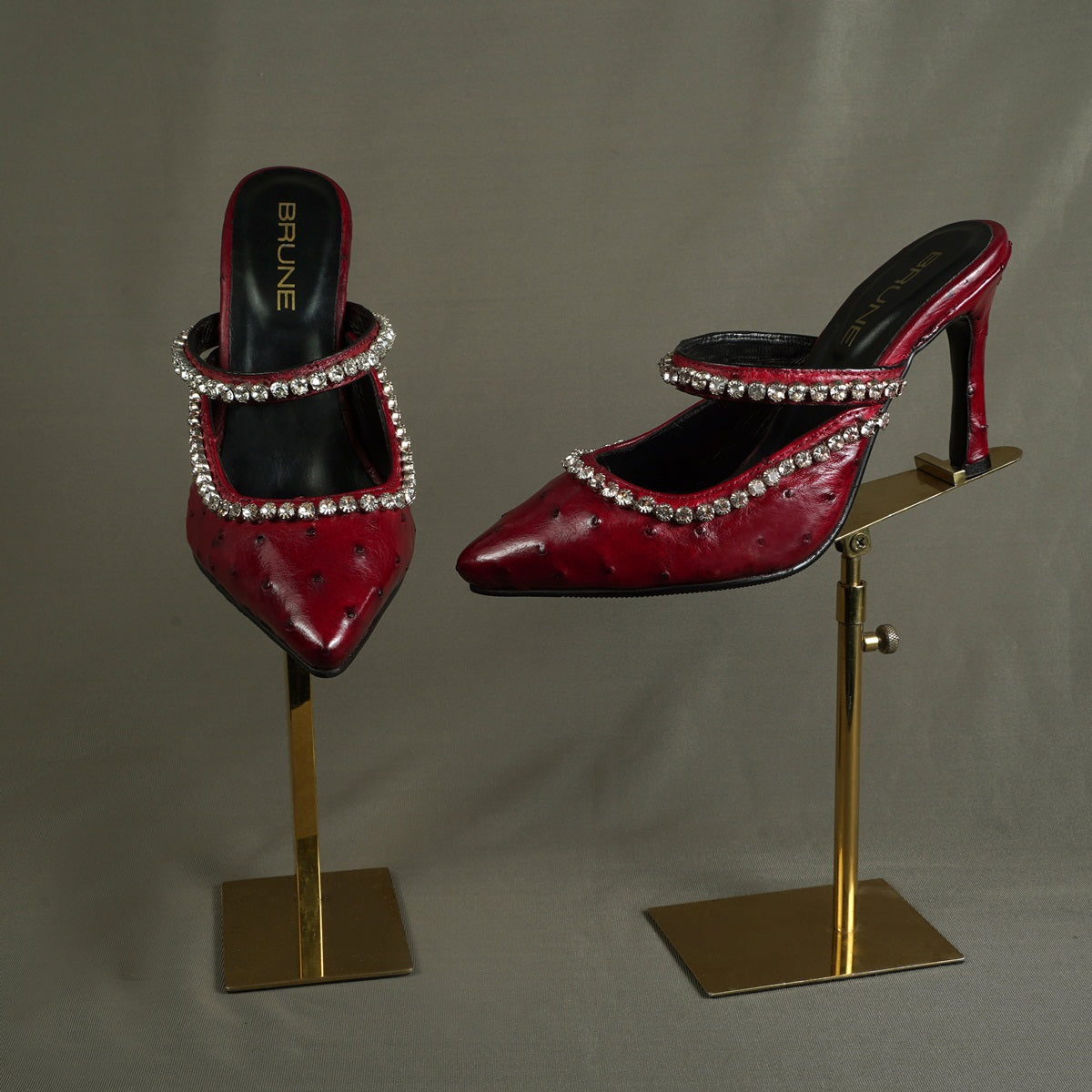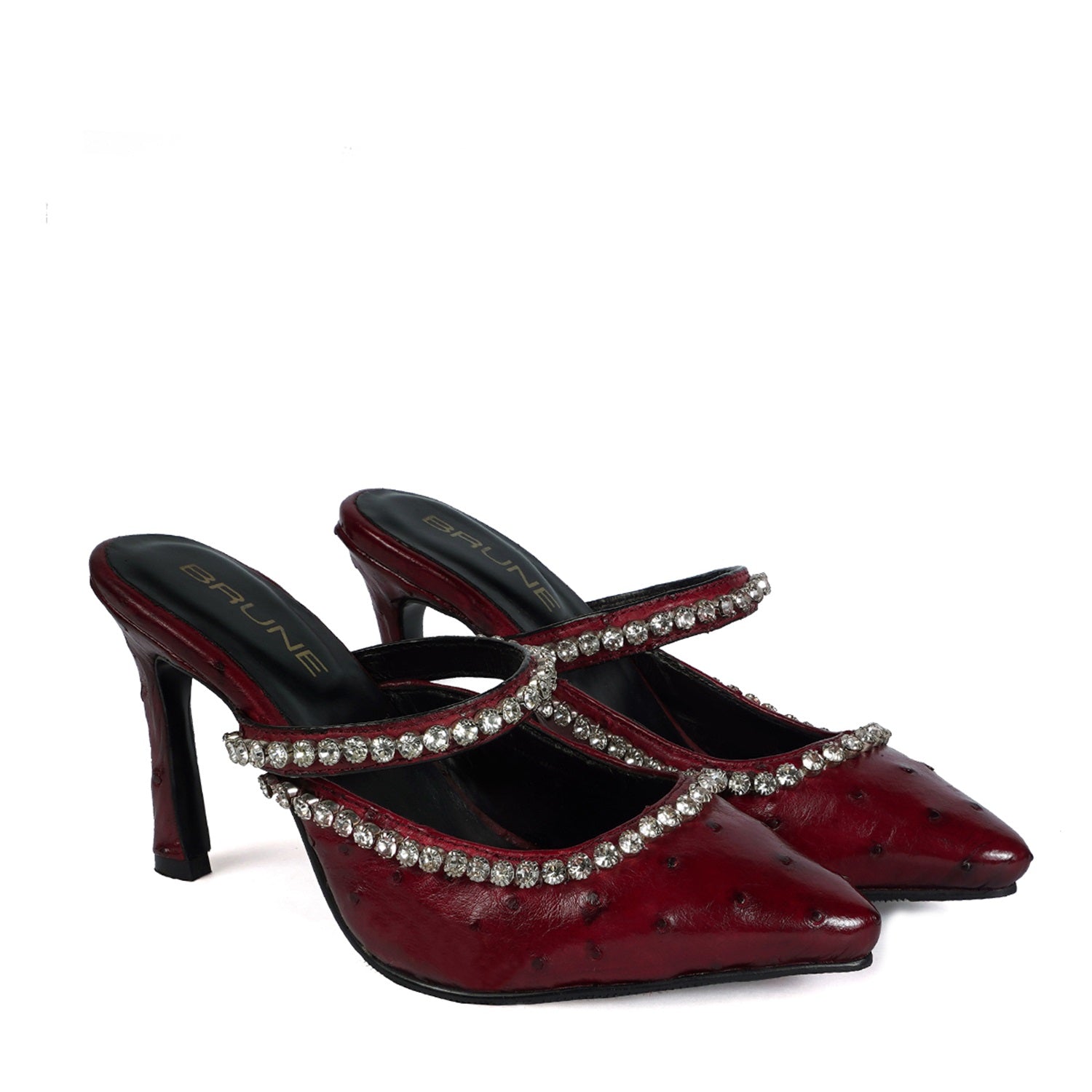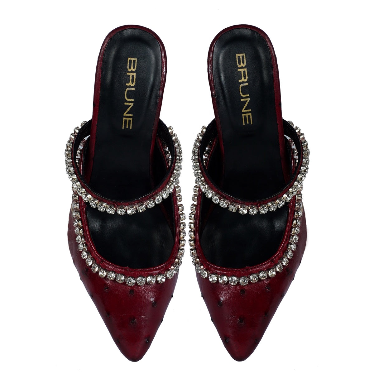 These Ladies Party wear Stiletto Heel Pumps in Exotic Wine Real Ostrich Leather are the perfect choice for adding a touch of class and elegance to any special occasion. Put a fashionable foot forward with this trendy pair of exotic ostrich leather heel pumps from Brune & Bareskin. Heel pumps from brune & bareskin featuring a pointed toe, a slim 90mm heel, an counter attach ankle strap and a branded insole. A pair of wine real ostrich leather Heel Pumps ,has regular ankle and open back embellished upper with western - embellished. For those special moments, why not treat your lady in life to these exquisite designer shoes?