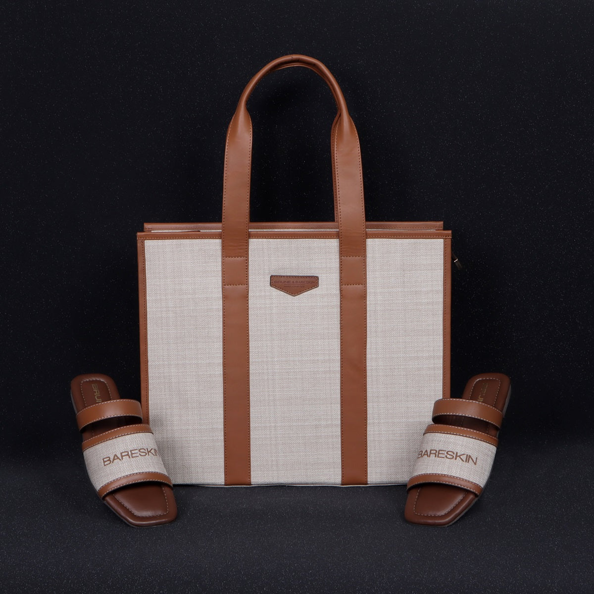 Delight the special lady in your life with a sophisticated Ladies Shopping Combo Pack from Brune & Bareskin. Crafted from tan genuine leather and beige canvas, this luxurious set, which includes a handbag and comfortable slippers, is sure to make a memorable impression. The perfect gift for any woman, this combo features stylish leather trims for a fashionable touch.