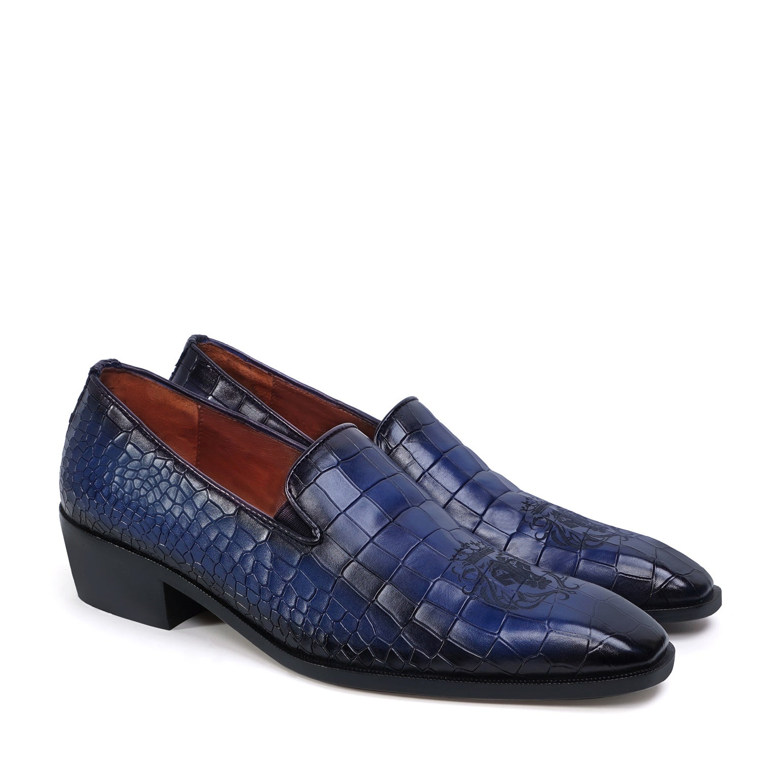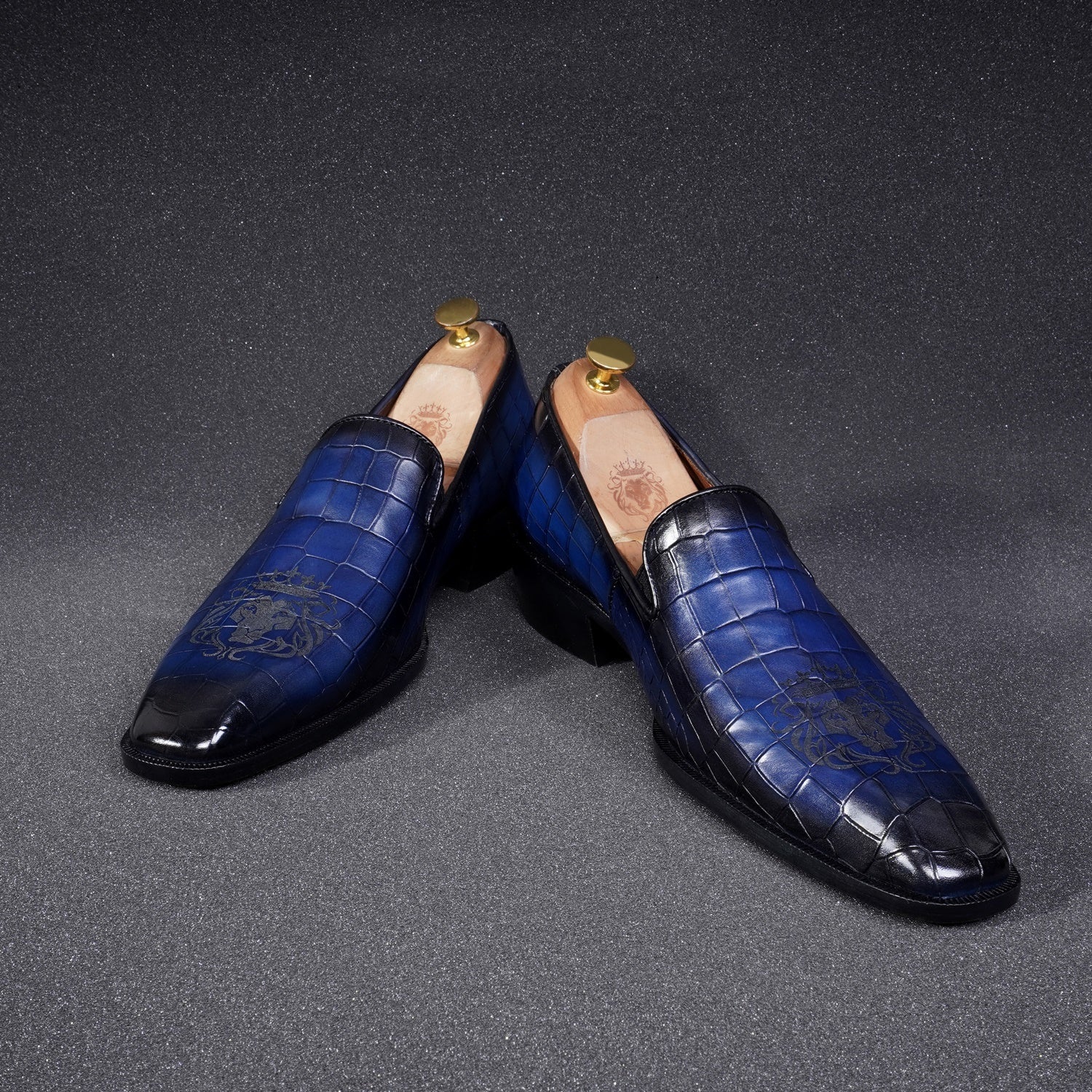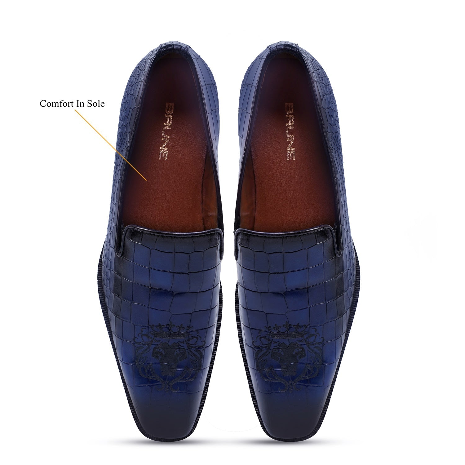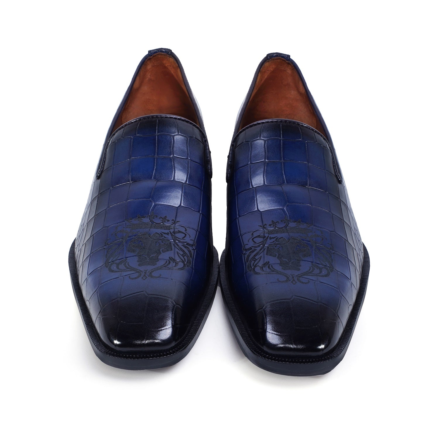Elevate your formal look with our Laser Engraved Burnished Blue Loafer in Deep Cut Croco Textured Leather by BRUNE & BARESKIN. Handcrafted with premium quality leather, this men's loafer features a squared apron toe and a contrasting laser engraved lion logo for a touch of sophistication. The extra padded insole and anti skid sole provide both comfort and style for any occasion.