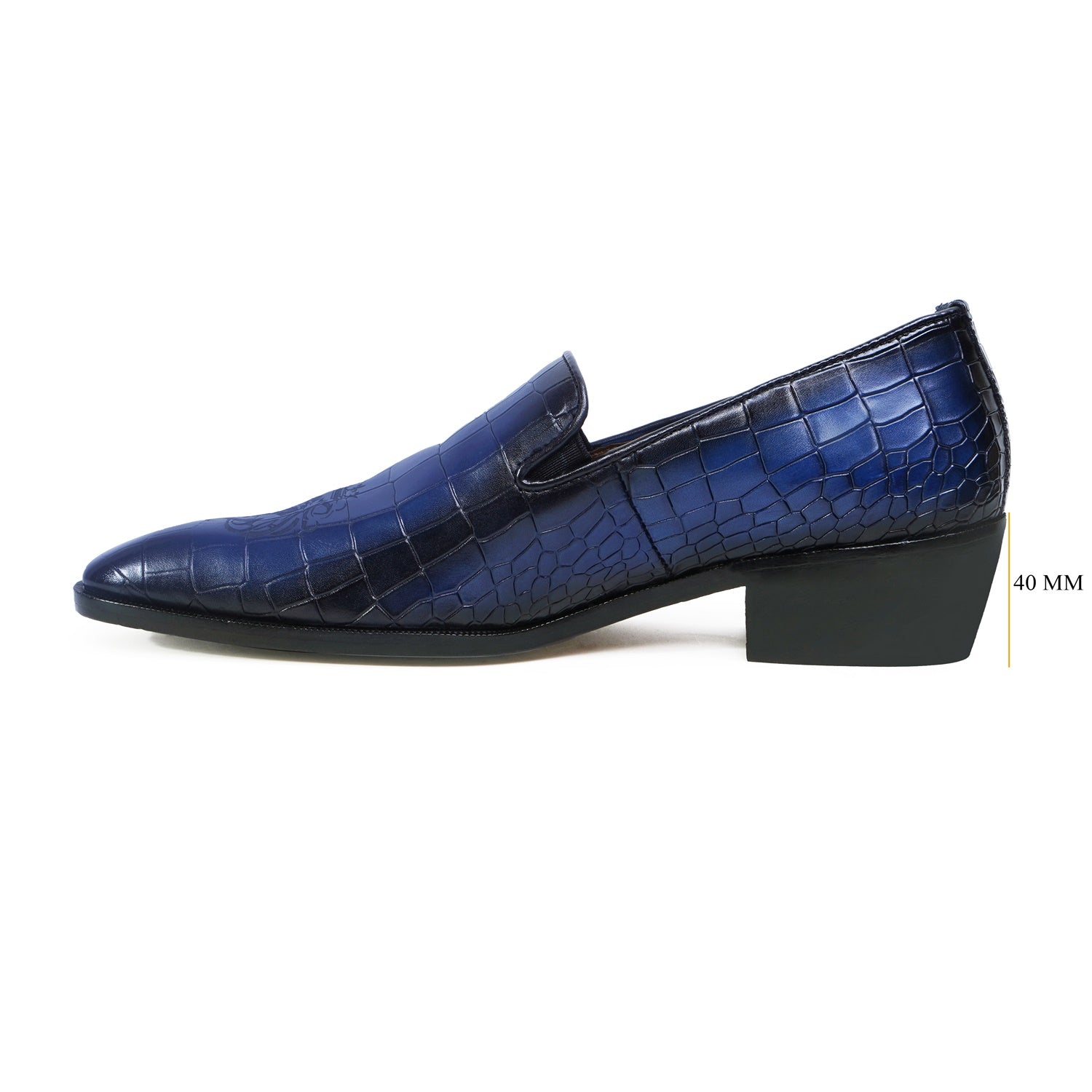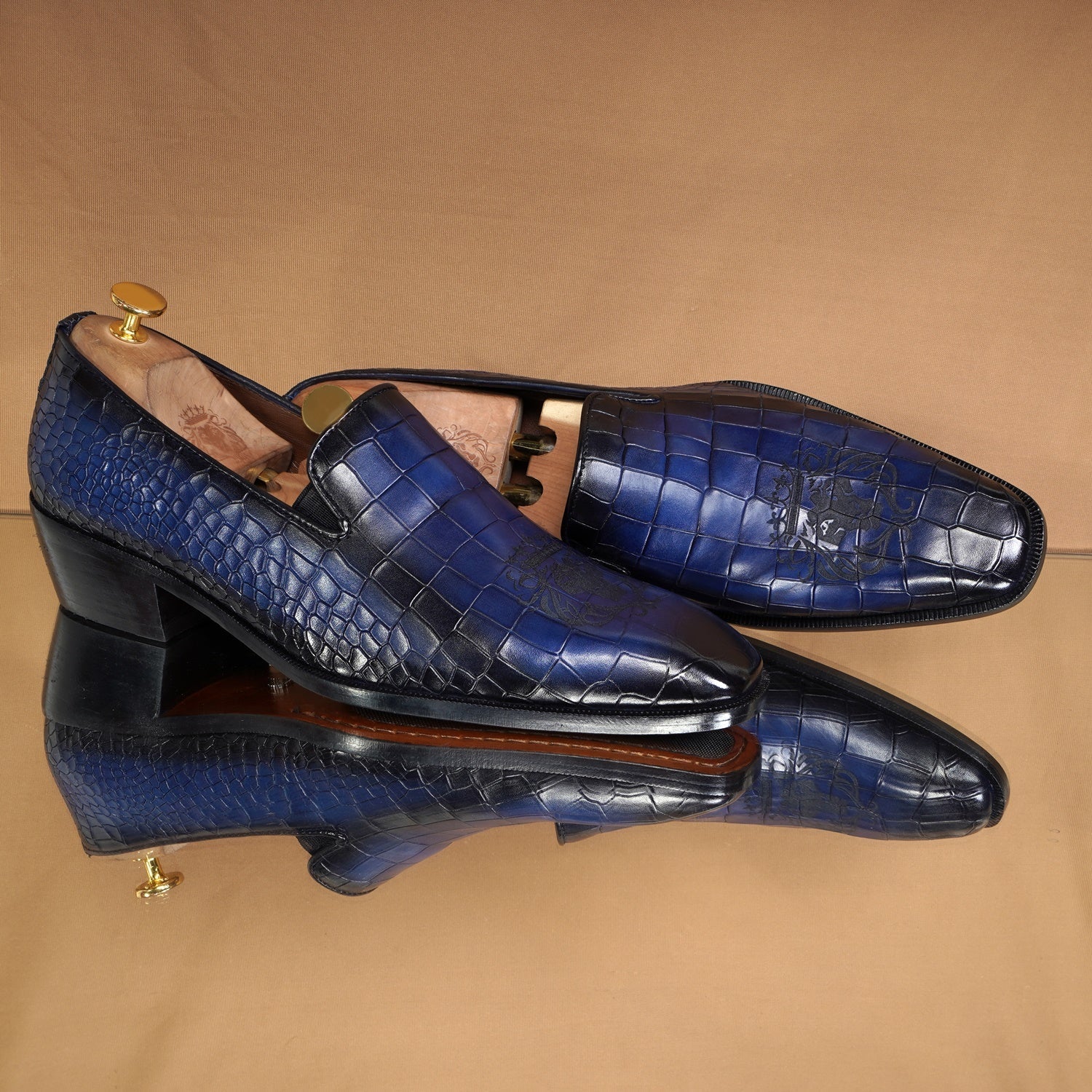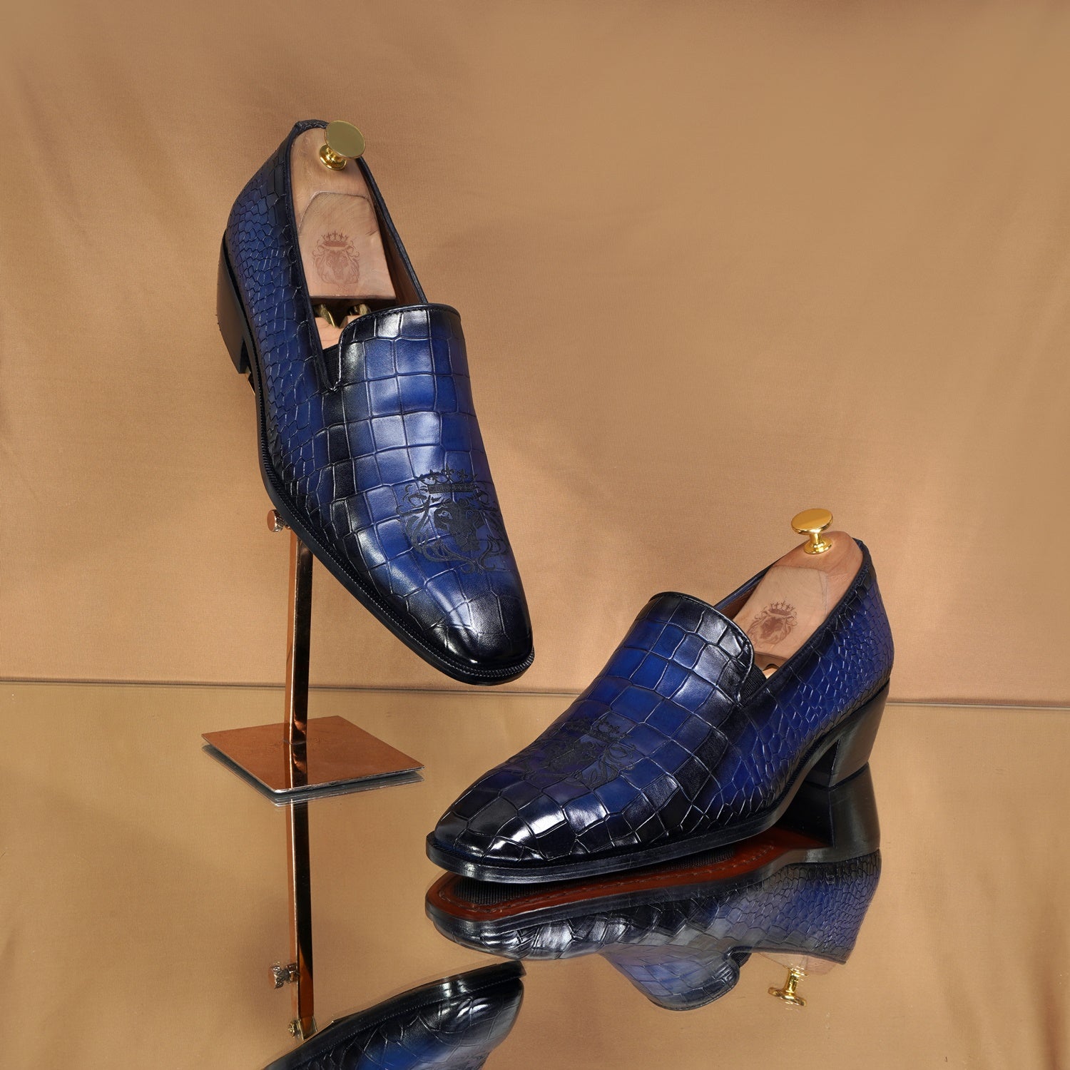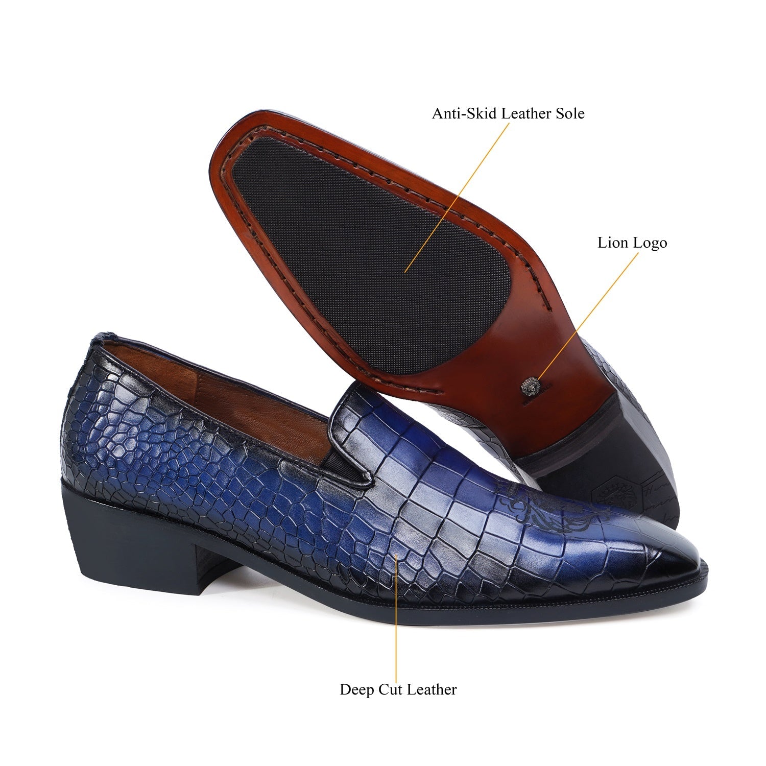 Elevate your formal look with our Laser Engraved Burnished Blue Loafer in Deep Cut Croco Textured Leather by BRUNE & BARESKIN. Handcrafted with premium quality leather, this men's loafer features a squared apron toe and a contrasting laser engraved lion logo for a touch of sophistication. The extra padded insole and anti skid sole provide both comfort and style for any occasion.