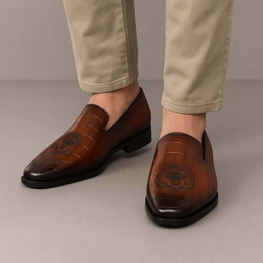 Elevate your formal look with our Laser Engraved Burnished Tan Loafer in Deep Cut Croco Textured Leather by BRUNE & BARESKIN. Handcrafted with premium quality leather, this men's loafer features a squared apron toe and a contrasting laser engraved lion logo for a touch of sophistication. The extra padded insole and anti skid sole provide both comfort and style for any occasion.