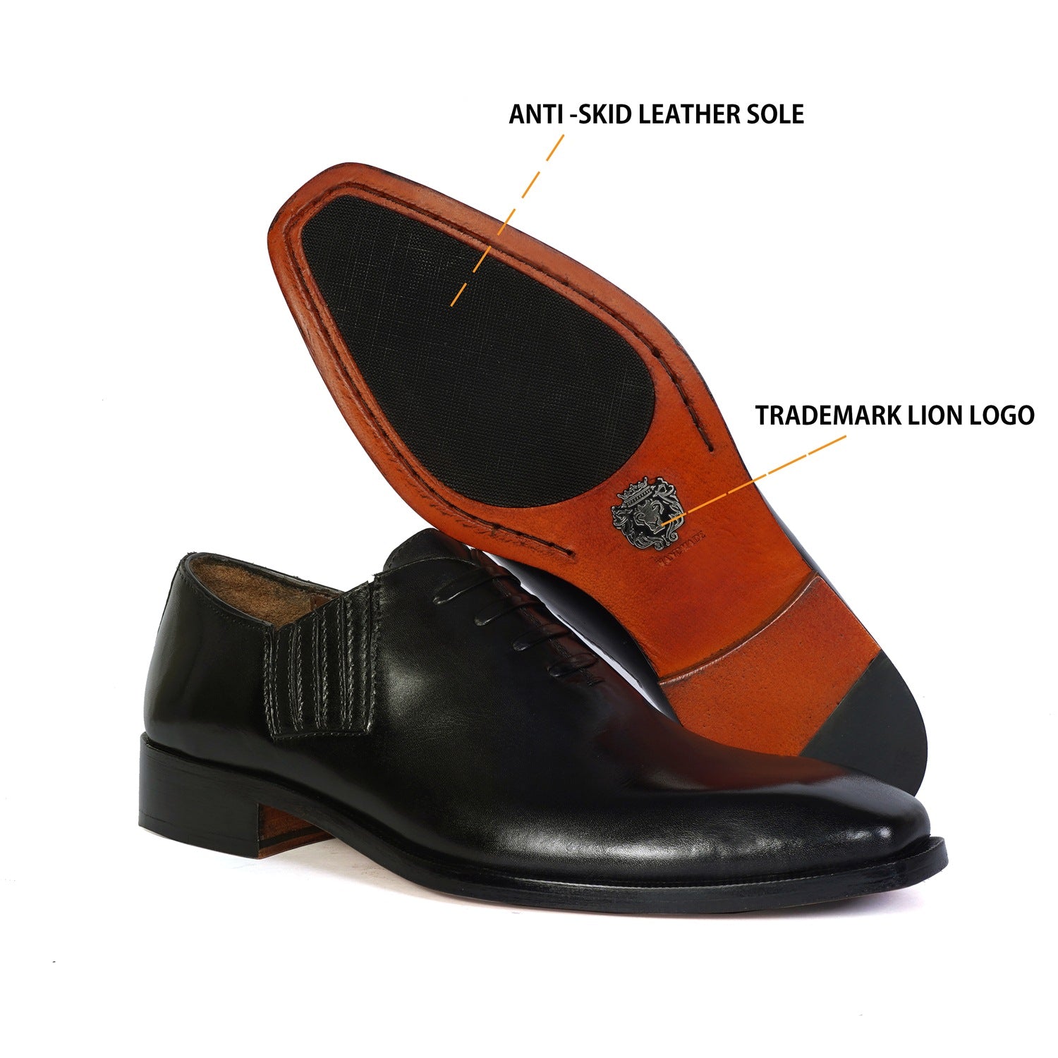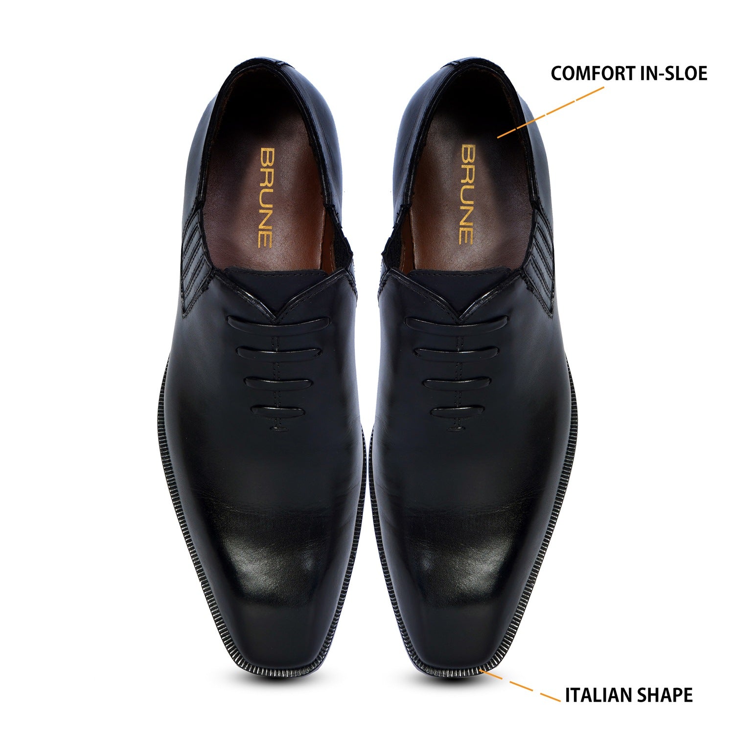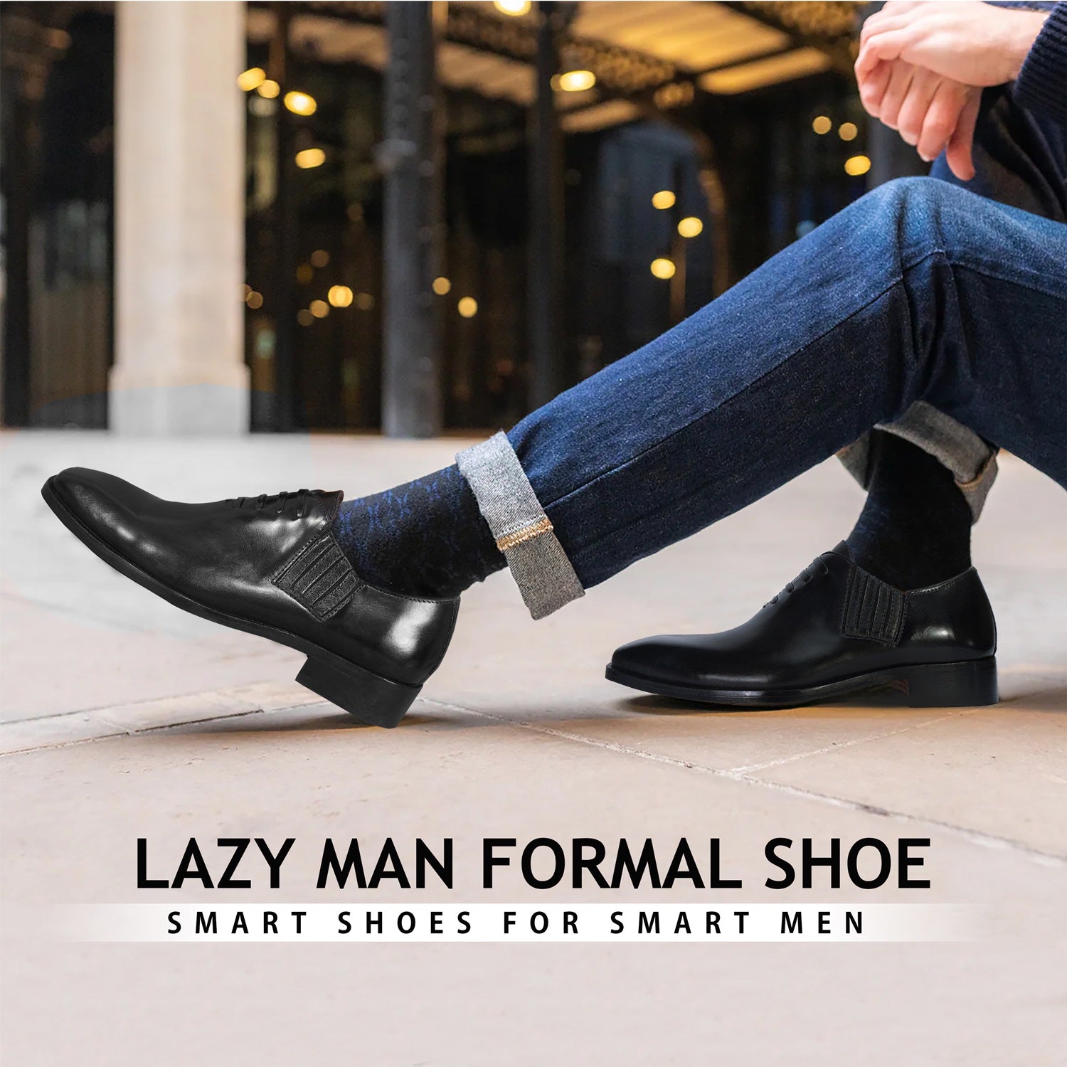 Introducing the Lazy Men Formal Shoes, crafted with expert precision and premium quality genuine black leather. With a sleek Italian toe design and fixed lace-up closure, these formal shoes offer a sharp and professional look. Featuring anti-skid leather heeled soles and inner and outer side elastic for the perfect fit, they are perfect for office or special occasions. Experience the luxury of Brune & Bareskin. Order now.
