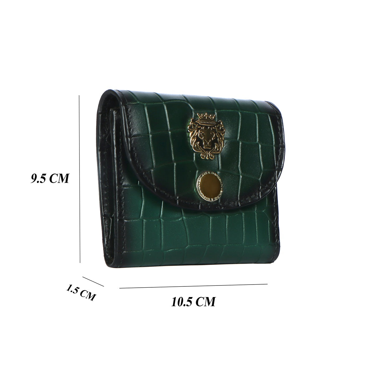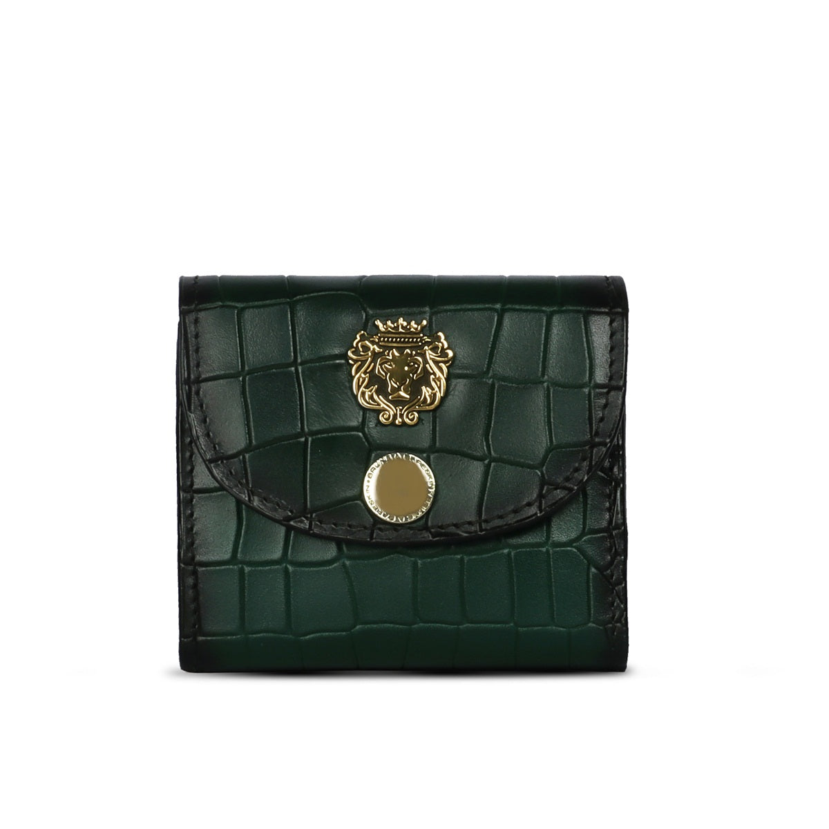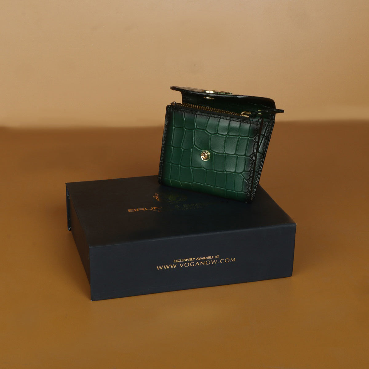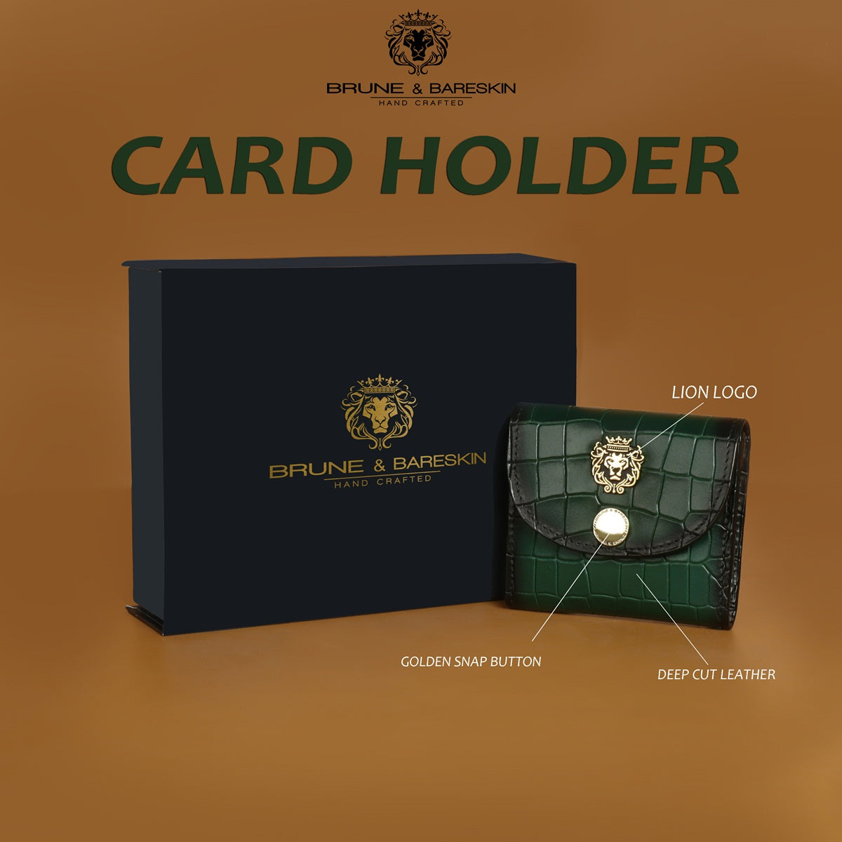 Boasting a green hue, this unisex Brune & Bareskin card holder features a flap-over design crafted with croco textured leather. The metal lion brand logo adorns it while a leather business card holder, zipper coin pocket, and card slot offer secure storage. Patina Finish on this card holder enhances the style further. You can get your name initials embossed on it with our bespoke services.