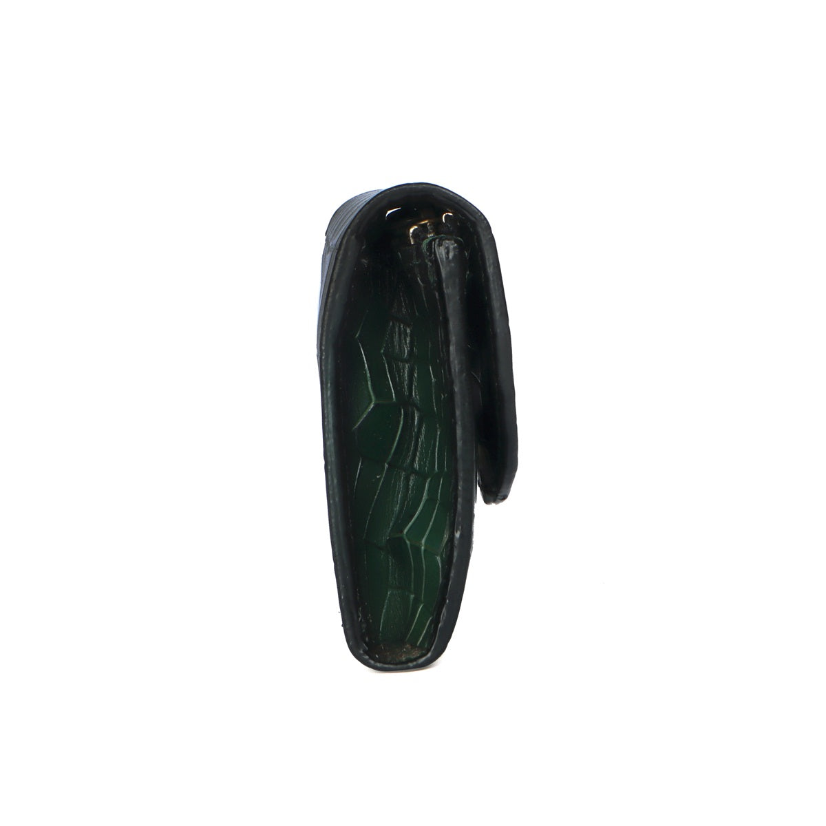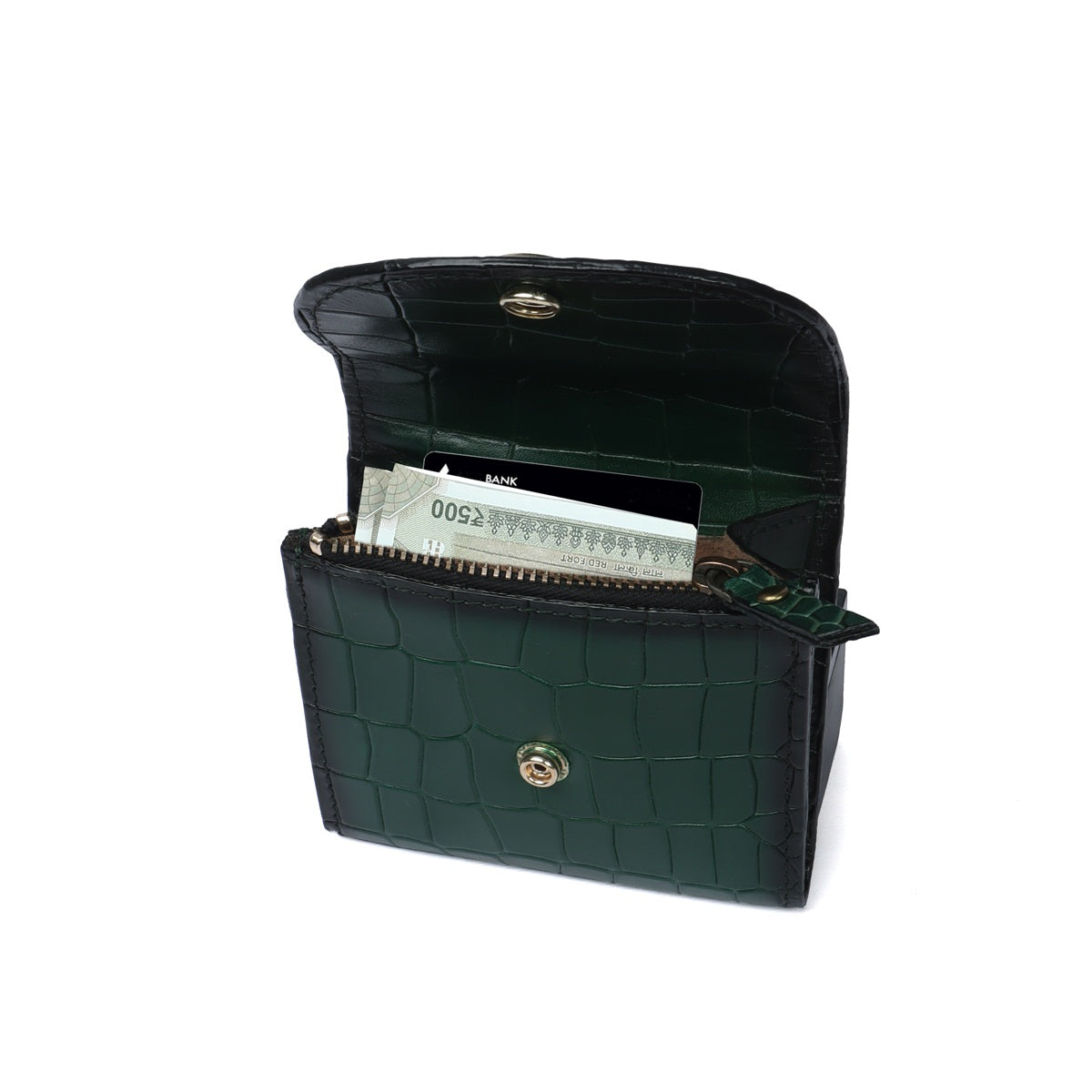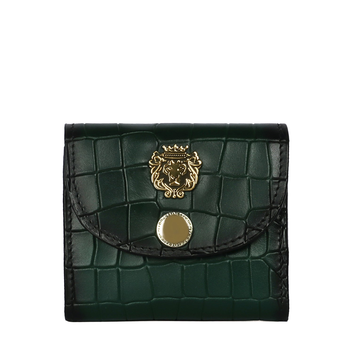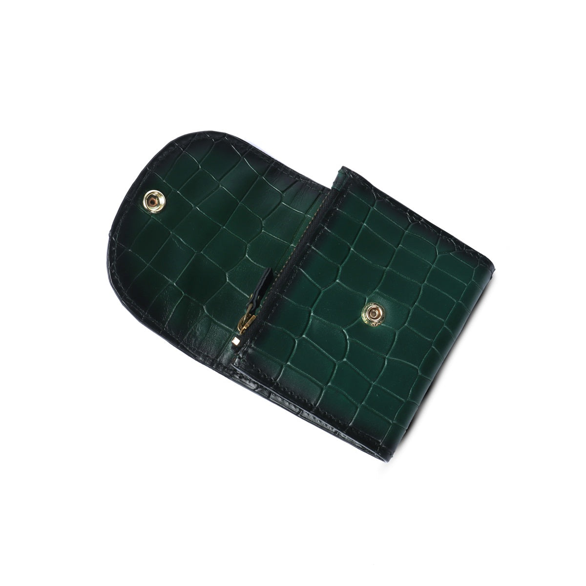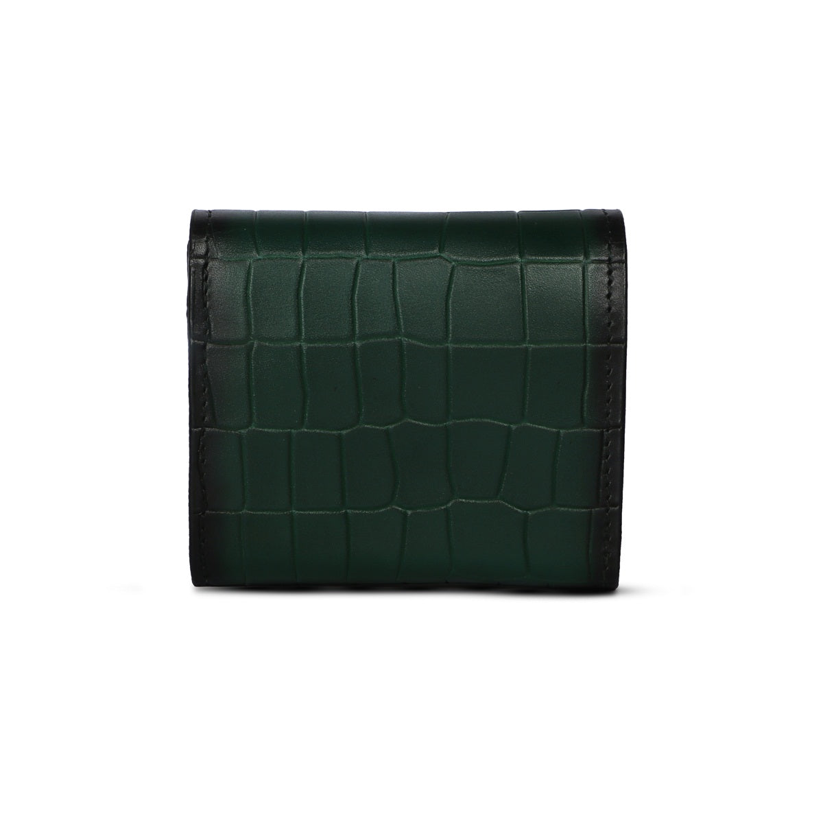 Boasting a green hue, this unisex Brune & Bareskin card holder features a flap-over design crafted with croco textured leather. The metal lion brand logo adorns it while a leather business card holder, zipper coin pocket, and card slot offer secure storage. Patina Finish on this card holder enhances the style further. You can get your name initials embossed on it with our bespoke services.