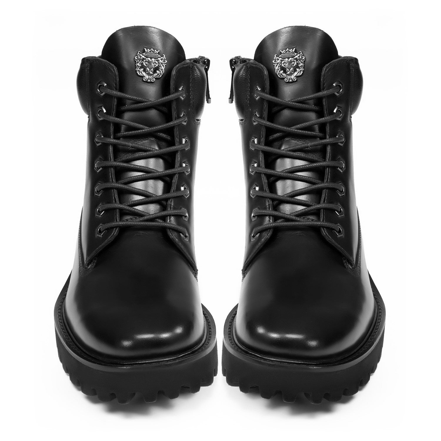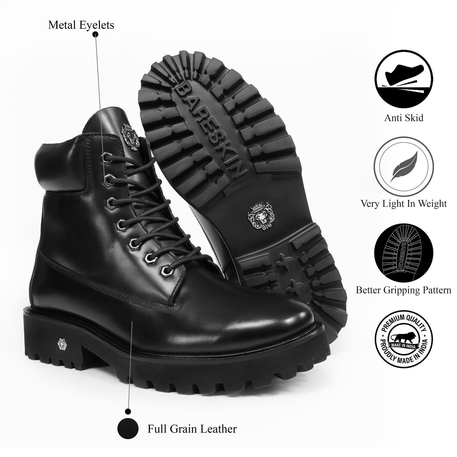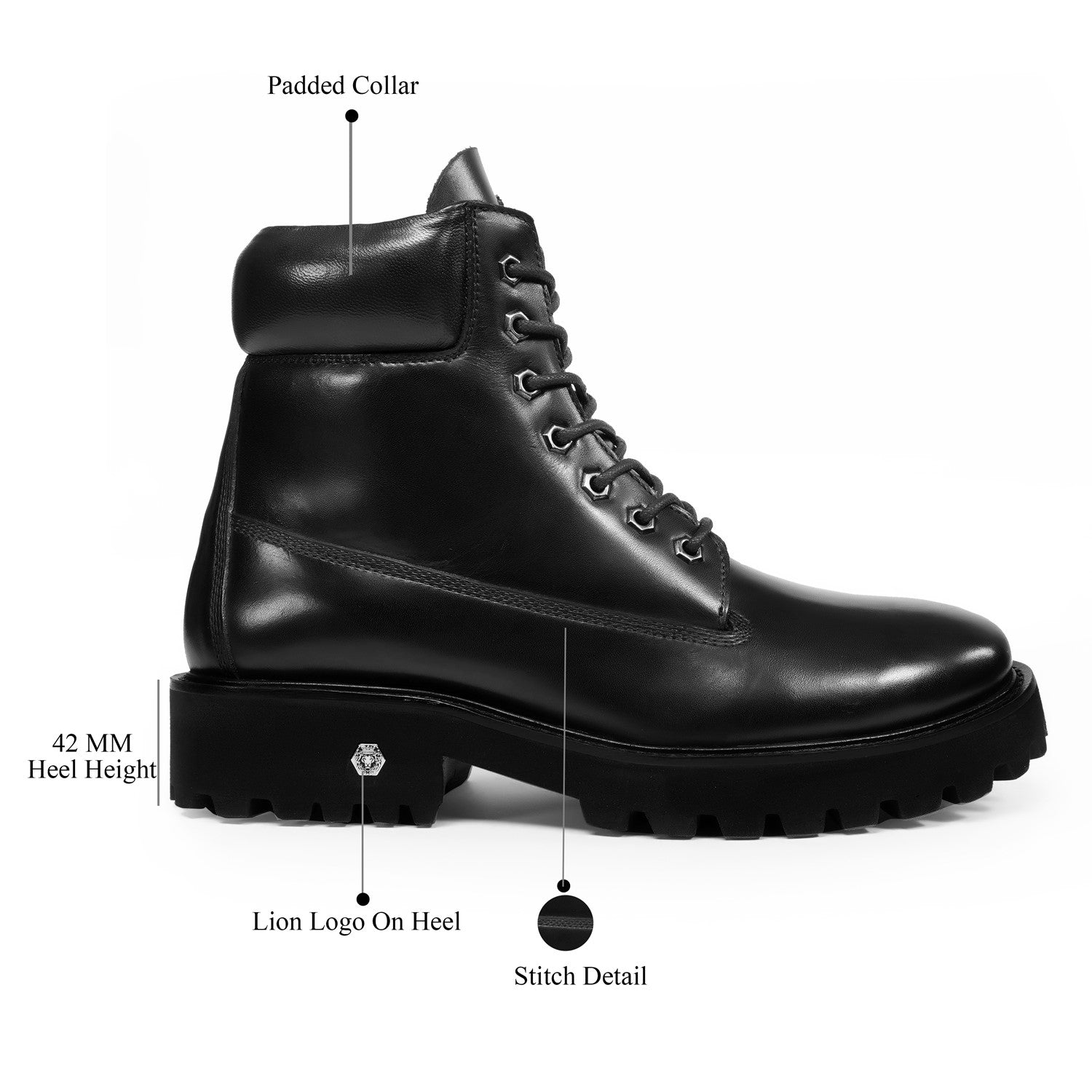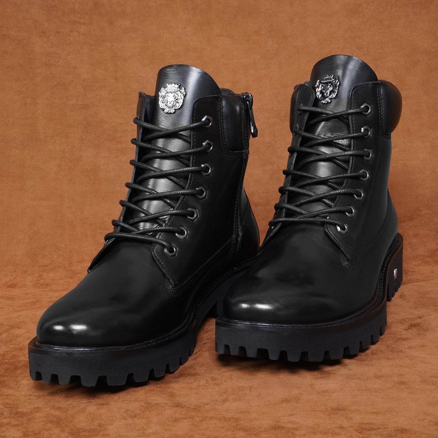 Lace-up closure makes it very convenient to adjust the boots according to your feet. The classic Signature Metal Lion Logo design make these boots an instant favorite of all chunky boot lovers. The ultra-lightweight sole makes it ideal footwear for all-day-long wear-ability and the thick high lightweight sole complements the comprehensive look. White rubberized sole enhances the grip on different terrains. This is the perfect gem for boot lovers from the style bucket of Brune & Bareskin.