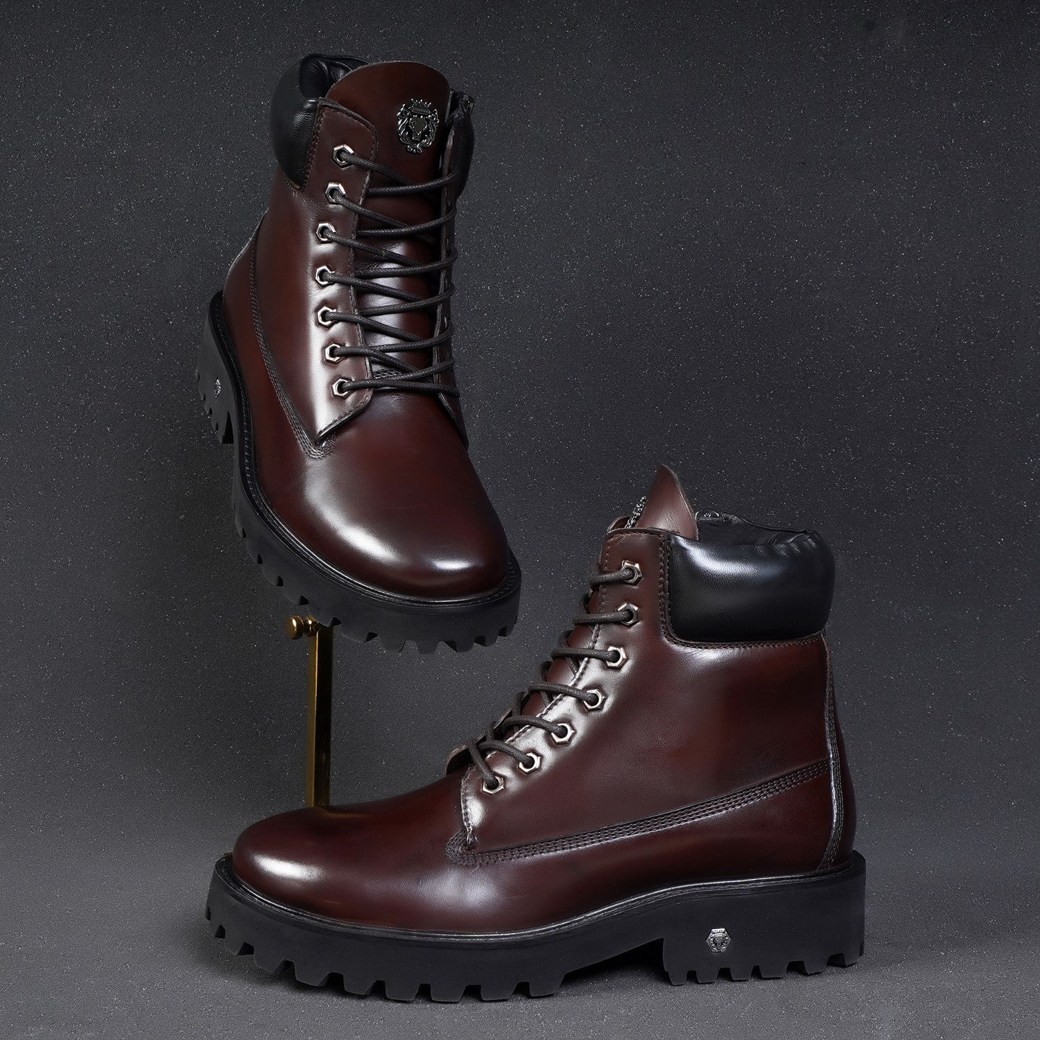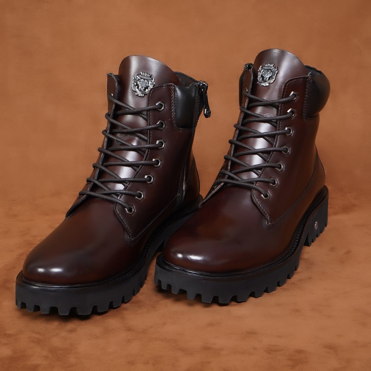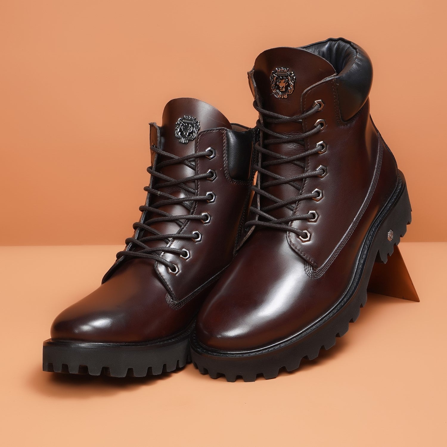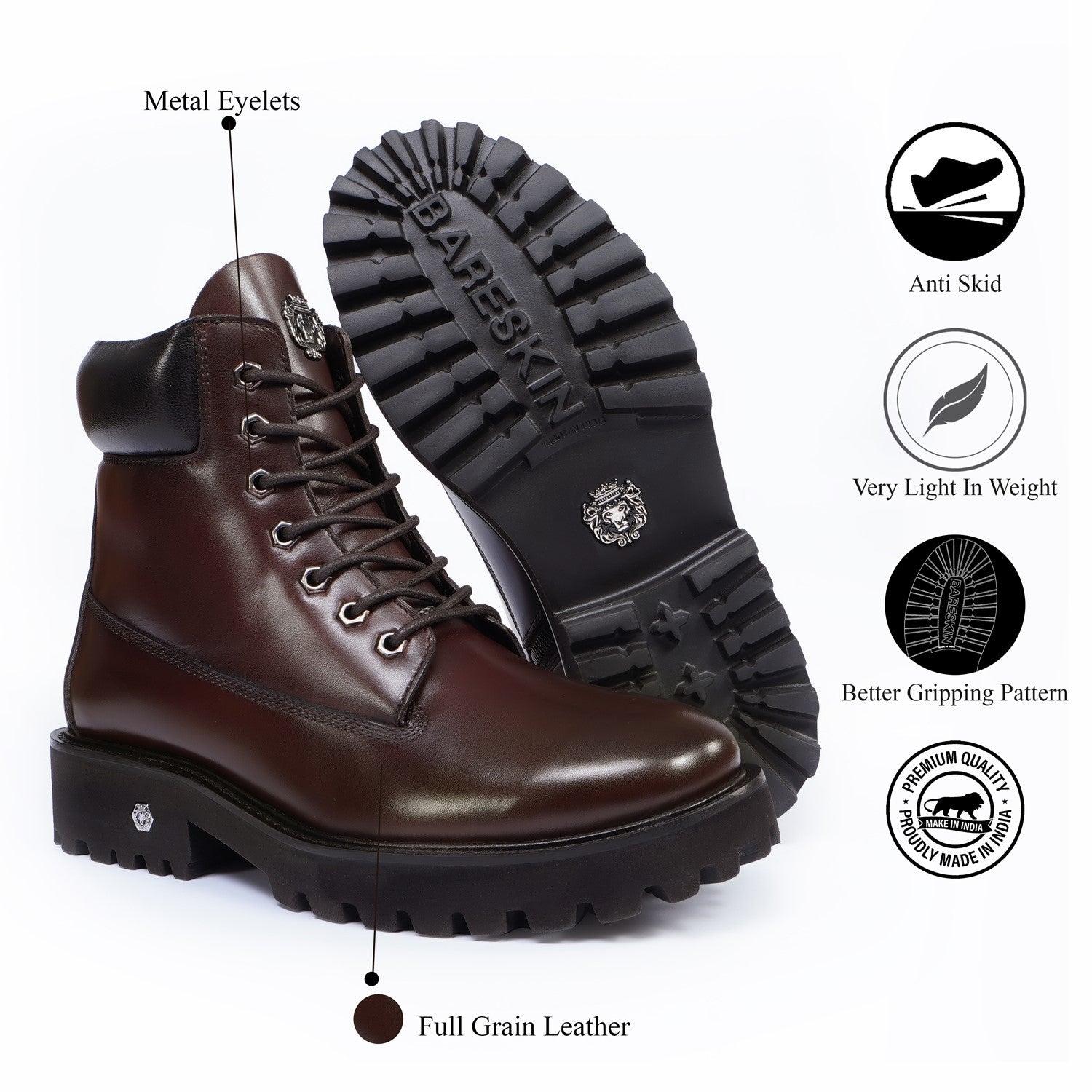 Lace-up closure makes it very convenient to adjust the boots according to your feet. The classic Signature Metal Lion Logo design make these boots an instant favorite of all chunky boot lovers. The ultra-lightweight sole makes it ideal footwear for all-day-long wear-ability and the thick high lightweight sole complements the comprehensive look. White rubberized sole enhances the grip on different terrains. This is the perfect gem for boot lovers from the style bucket of Brune & Bareskin.