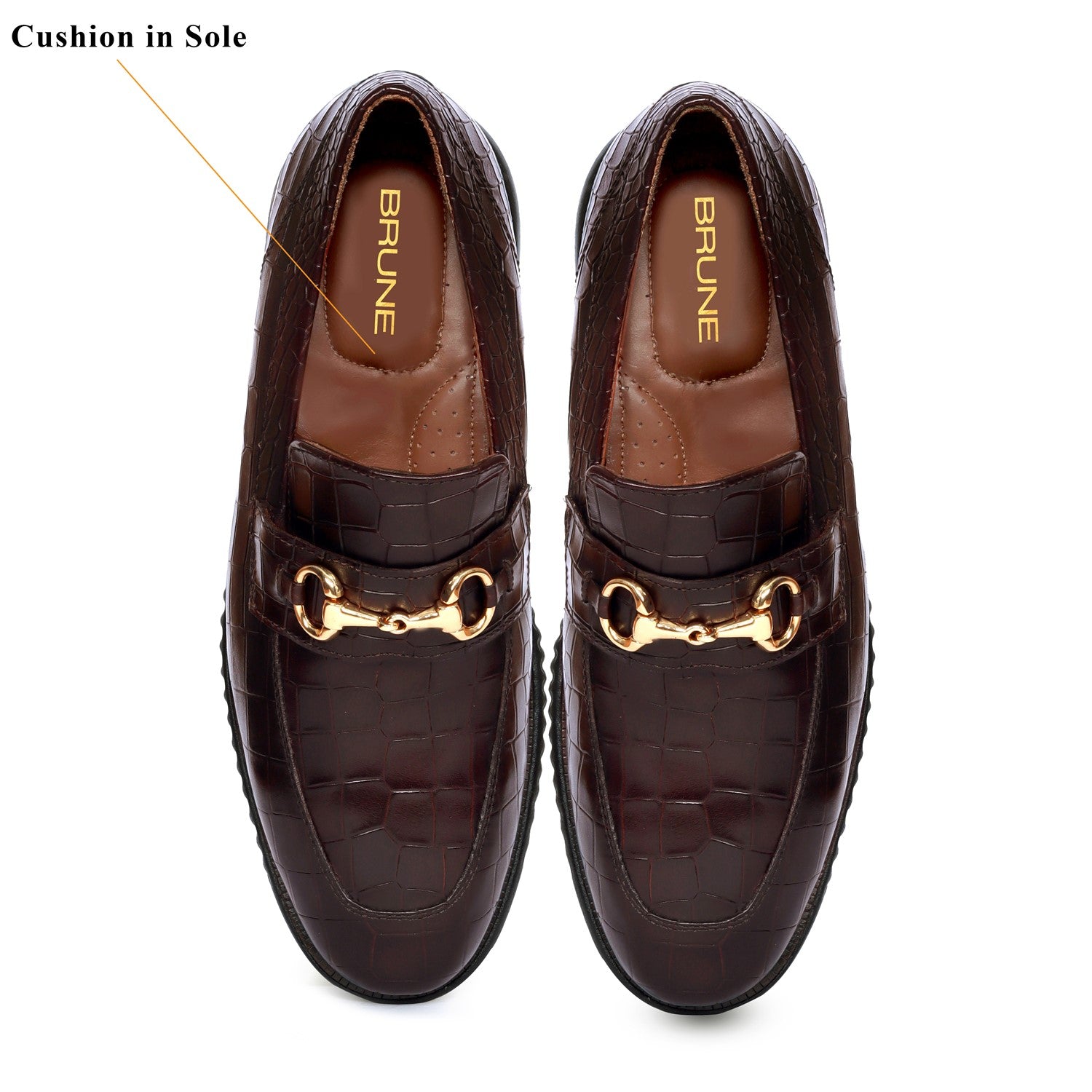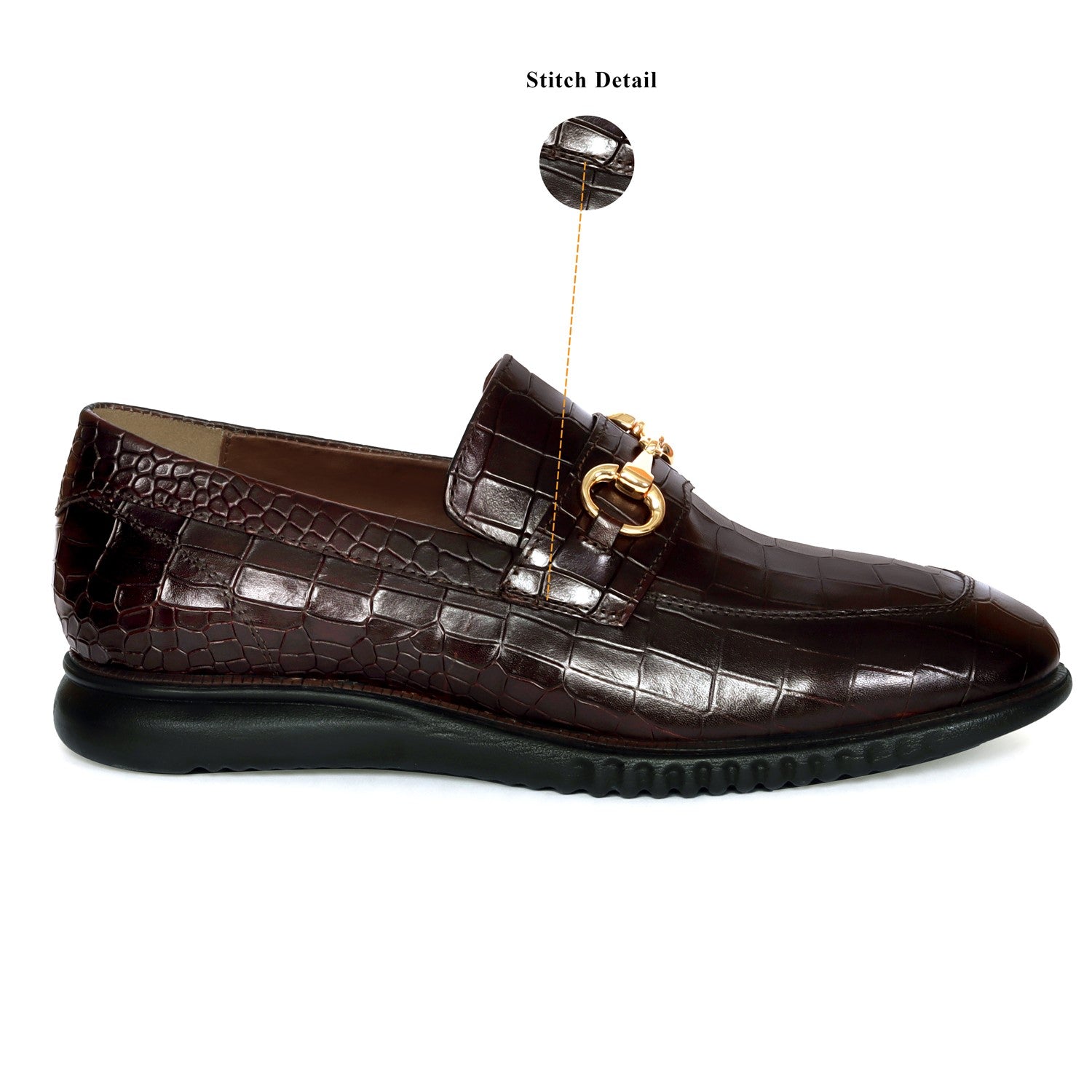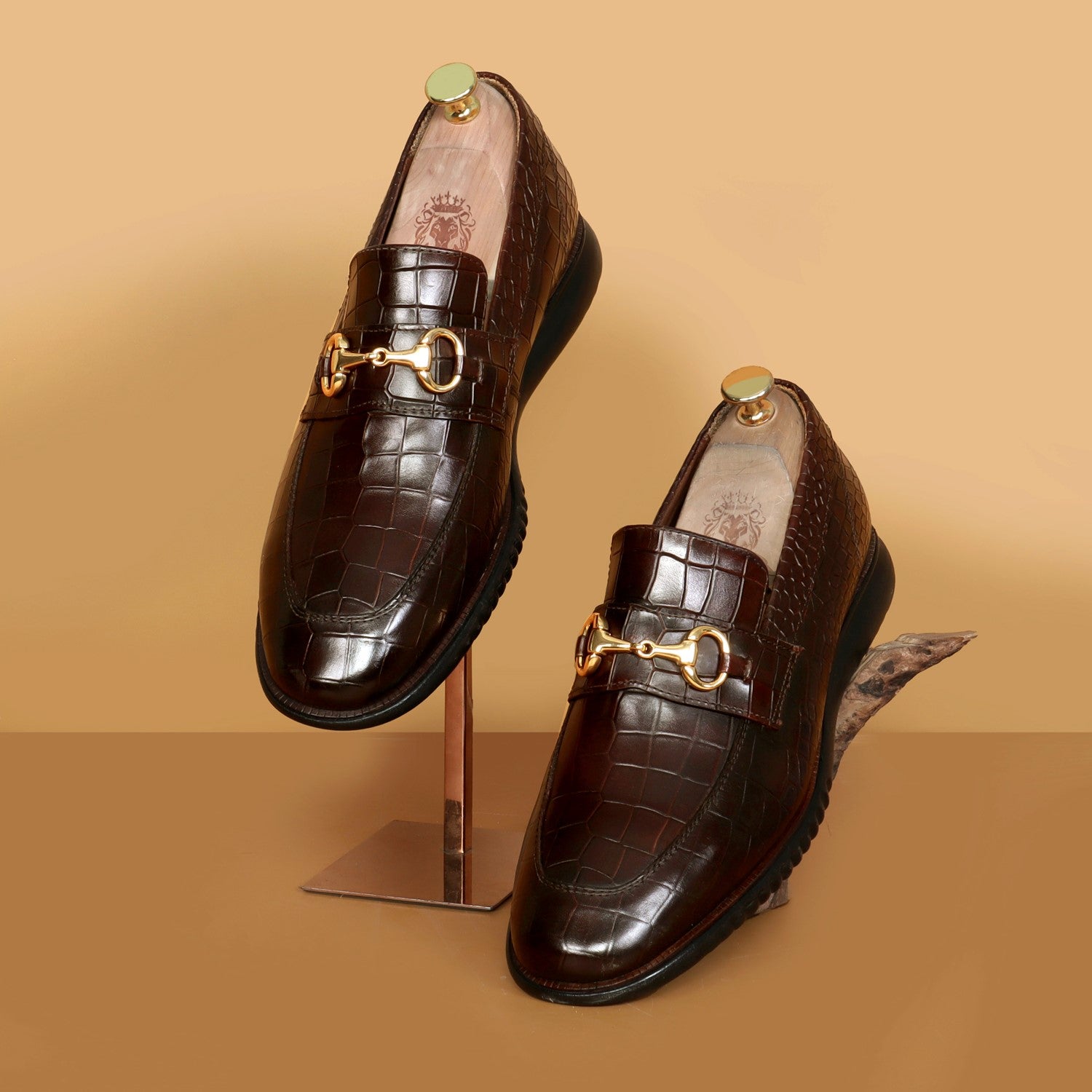 For the office or your day-to-day look, this dark brown loafer offers a stylish upgrade to your wardrobe. This classic men's shoe is made from luxurious croco-textured leather and features an eye-catching golden horse-bit buckle on vamp. This loafer is an elegant choice for any occasion. The light-weight rubber sole ensures superior comfort and ease of movement. So why not experience the luxury for yourself?