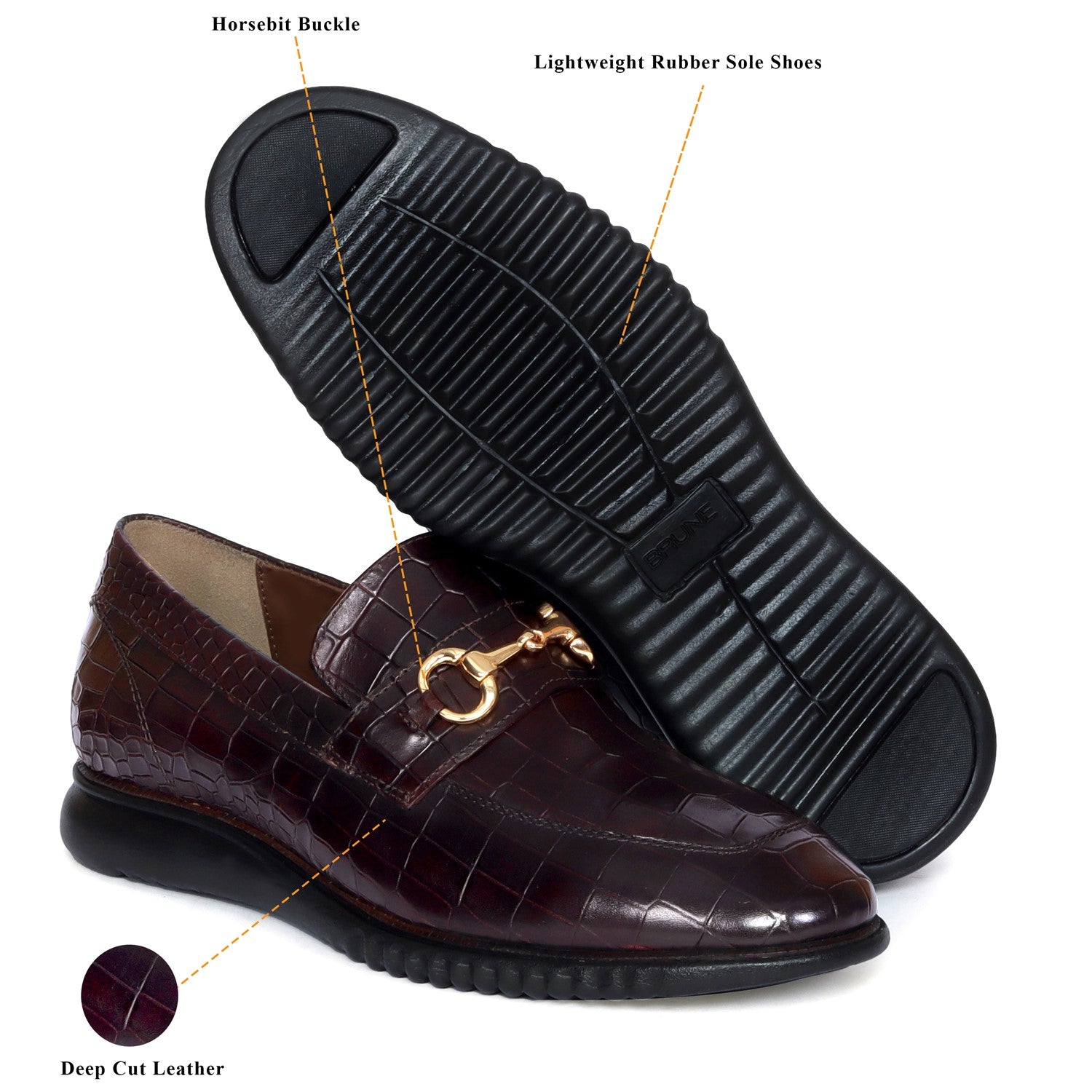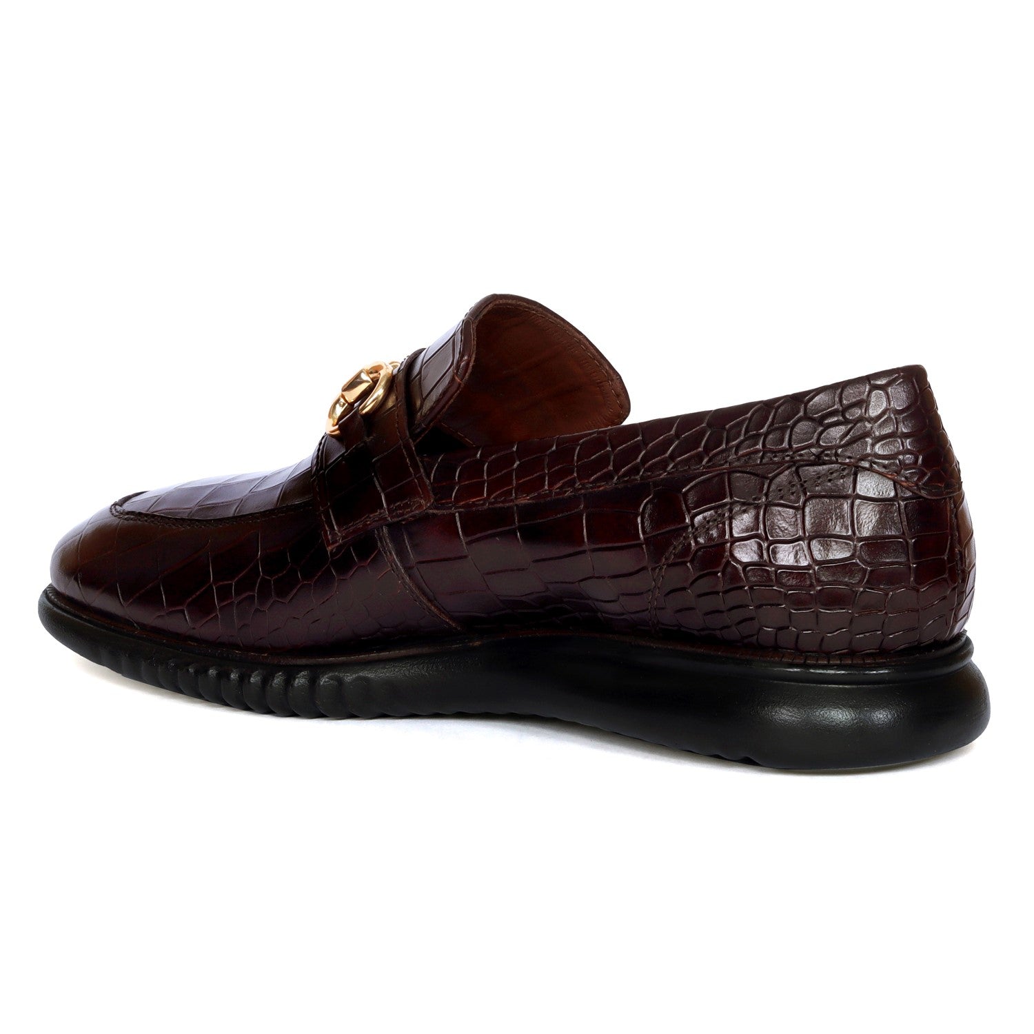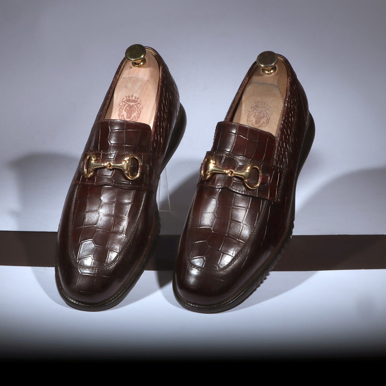 For the office or your day-to-day look, this dark brown loafer offers a stylish upgrade to your wardrobe. This classic men's shoe is made from luxurious croco-textured leather and features an eye-catching golden horse-bit buckle on vamp. This loafer is an elegant choice for any occasion. The light-weight rubber sole ensures superior comfort and ease of movement. So why not experience the luxury for yourself?