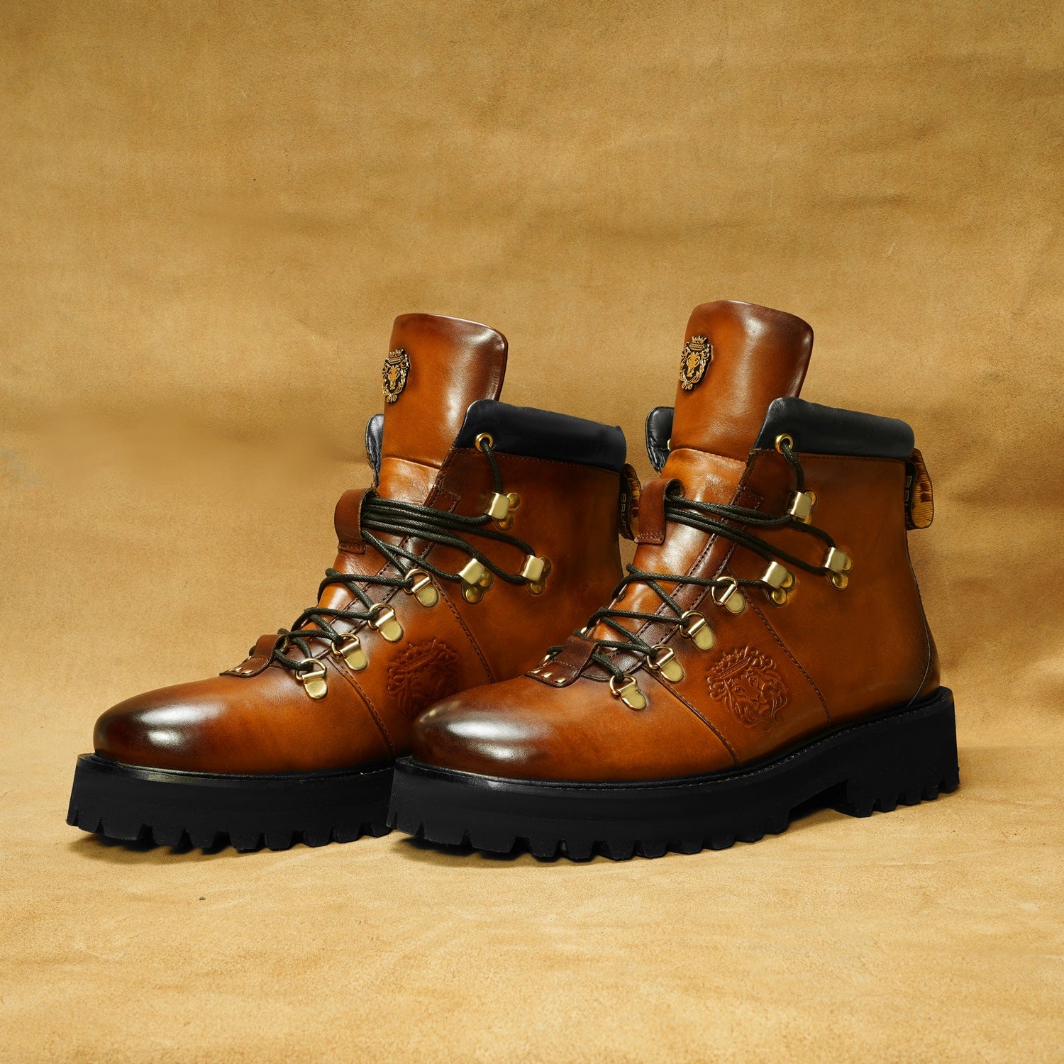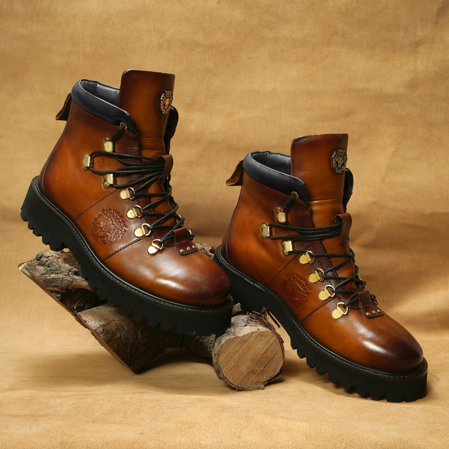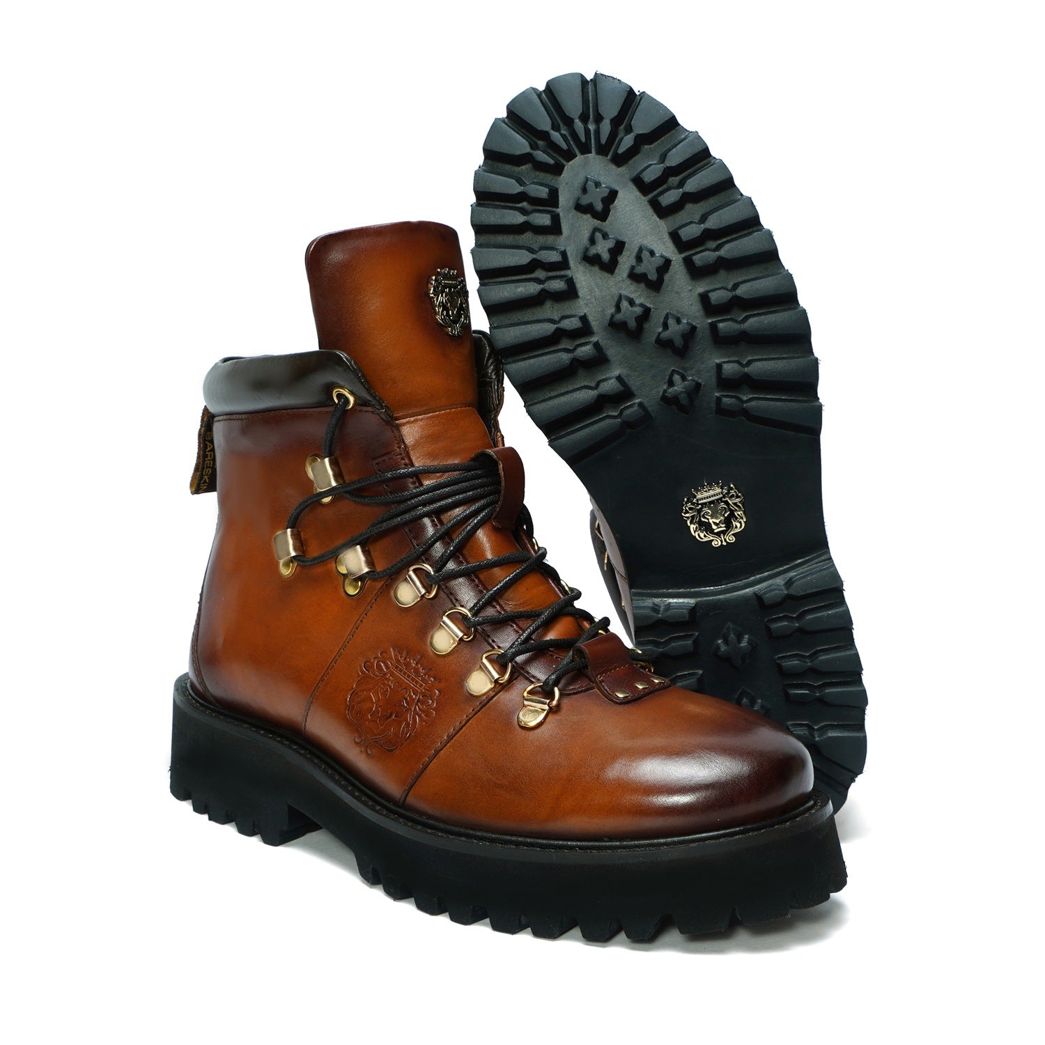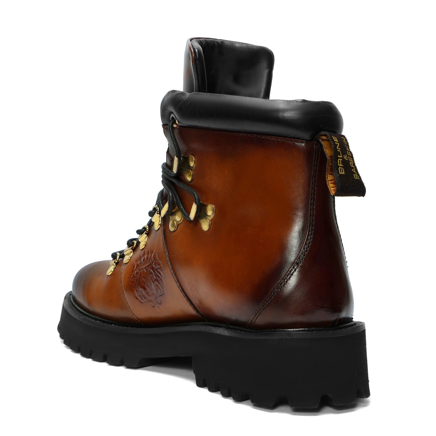 Elevate your style with Brune & Bareskin's ankle boots. Made from genuine tan leather, these boots are light in weight and perfect for hiking or everyday wear. The rubber sole provides comfort and stability, while the patina finish and burnish effect add a touch of sophisticated luxury. Designed with a combat shoe structure and metal shoe eyelet, these handcrafted boots feature an embossed lion logo and padded collar for a refined, yet rugged look. Plus, the new design allows for faster lace tying. Available in a timeless tan color, these ankle boots are a must-have for any fashion-forward individual.