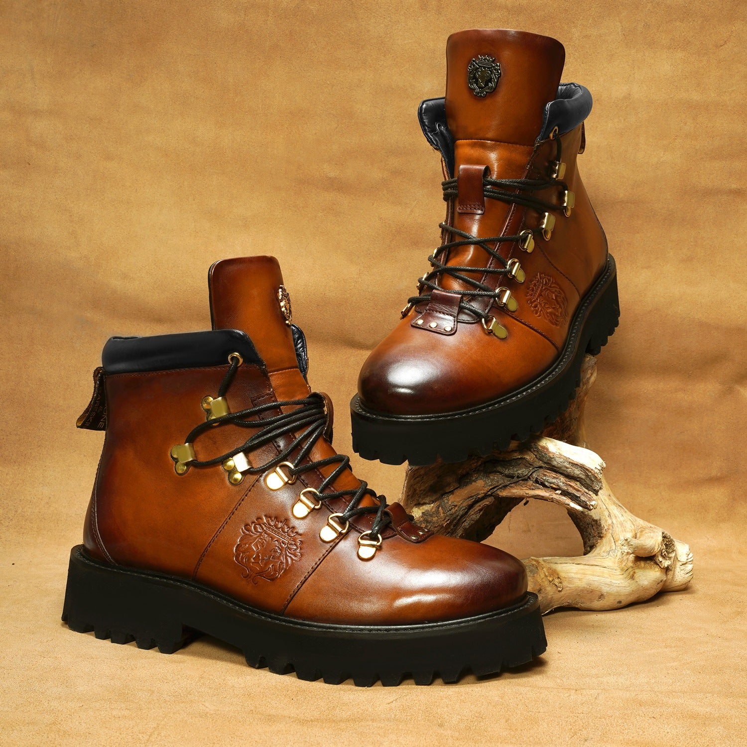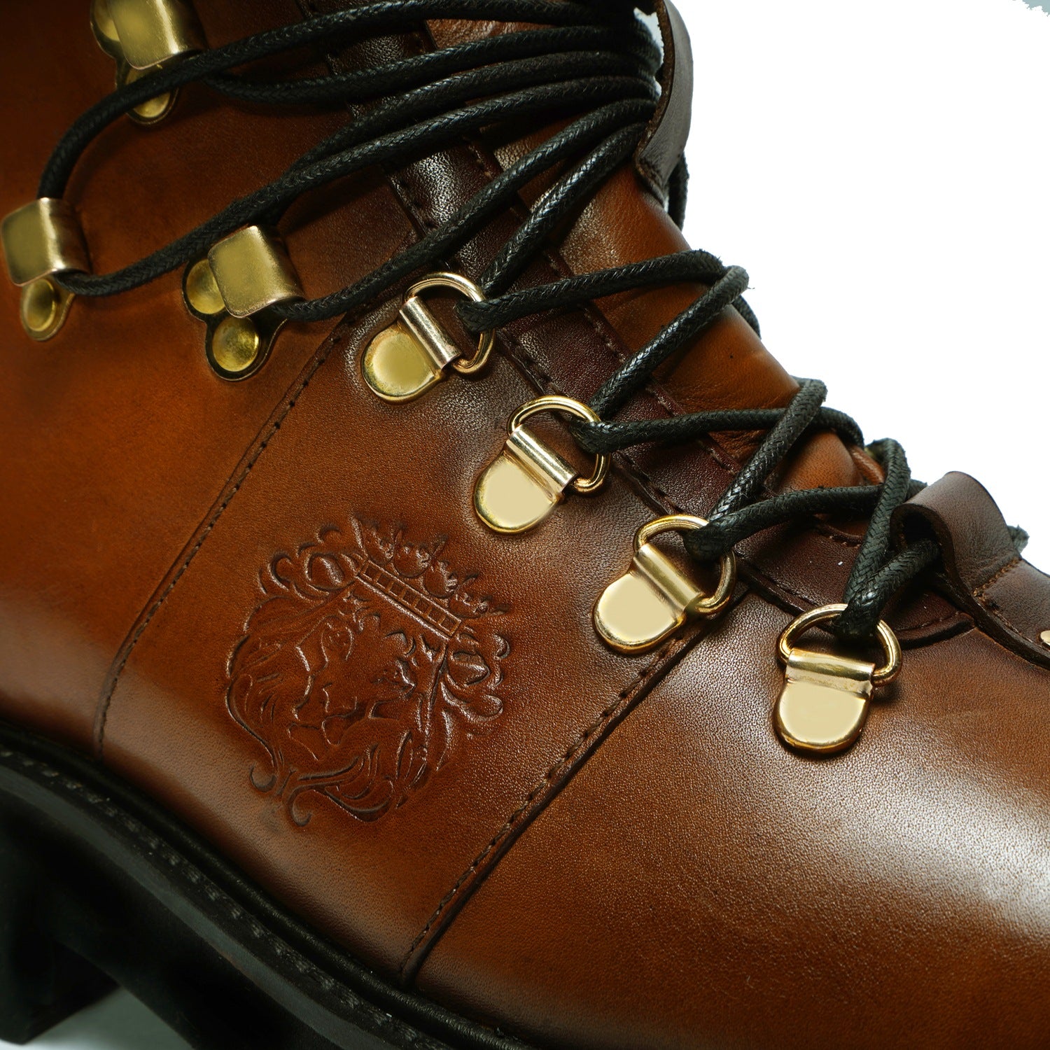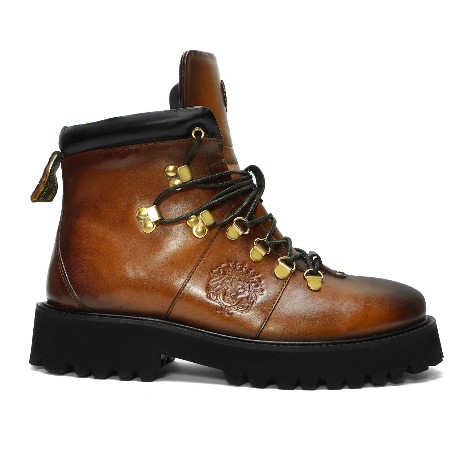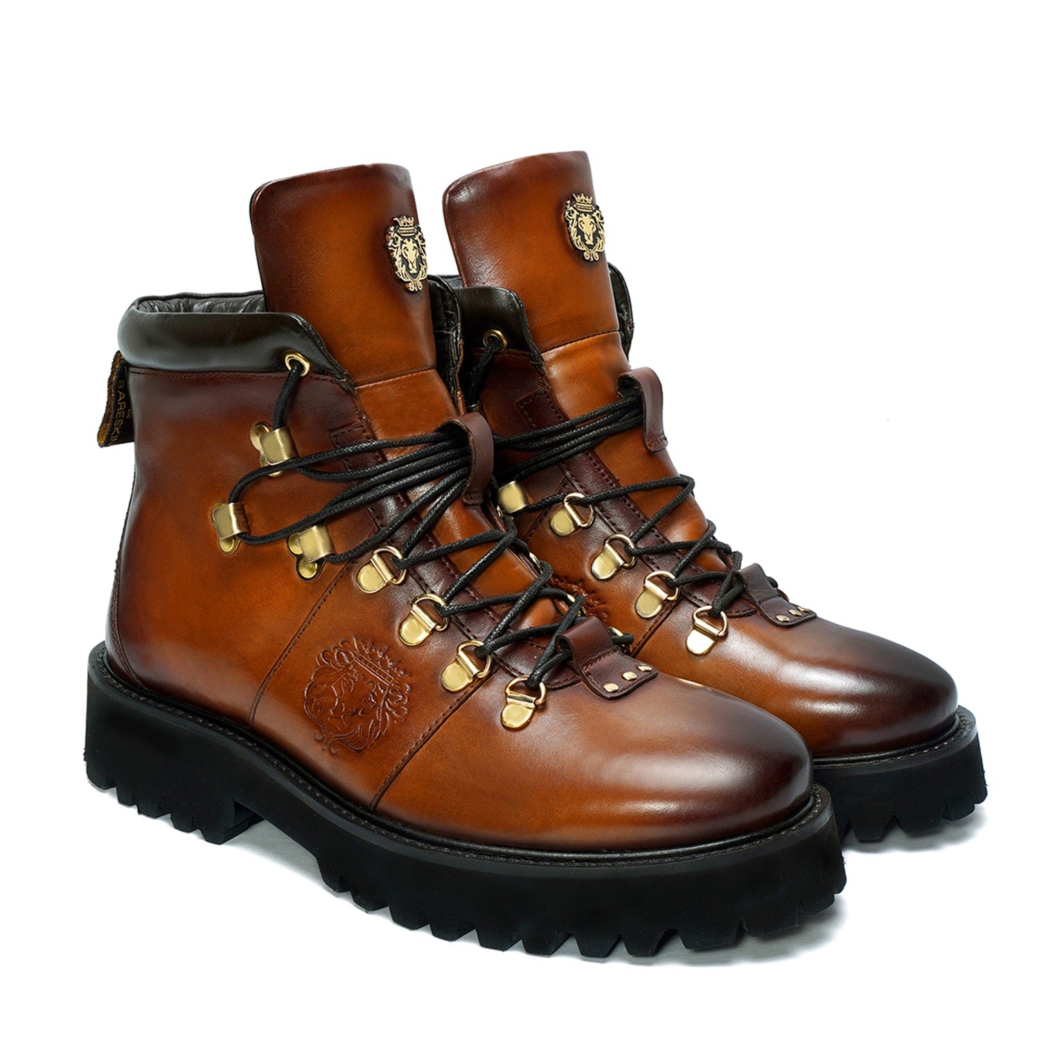 Elevate your style with Brune & Bareskin's ankle boots. Made from genuine tan leather, these boots are light in weight and perfect for hiking or everyday wear. The rubber sole provides comfort and stability, while the patina finish and burnish effect add a touch of sophisticated luxury. Designed with a combat shoe structure and metal shoe eyelet, these handcrafted boots feature an embossed lion logo and padded collar for a refined, yet rugged look. Plus, the new design allows for faster lace tying. Available in a timeless tan color, these ankle boots are a must-have for any fashion-forward individual.