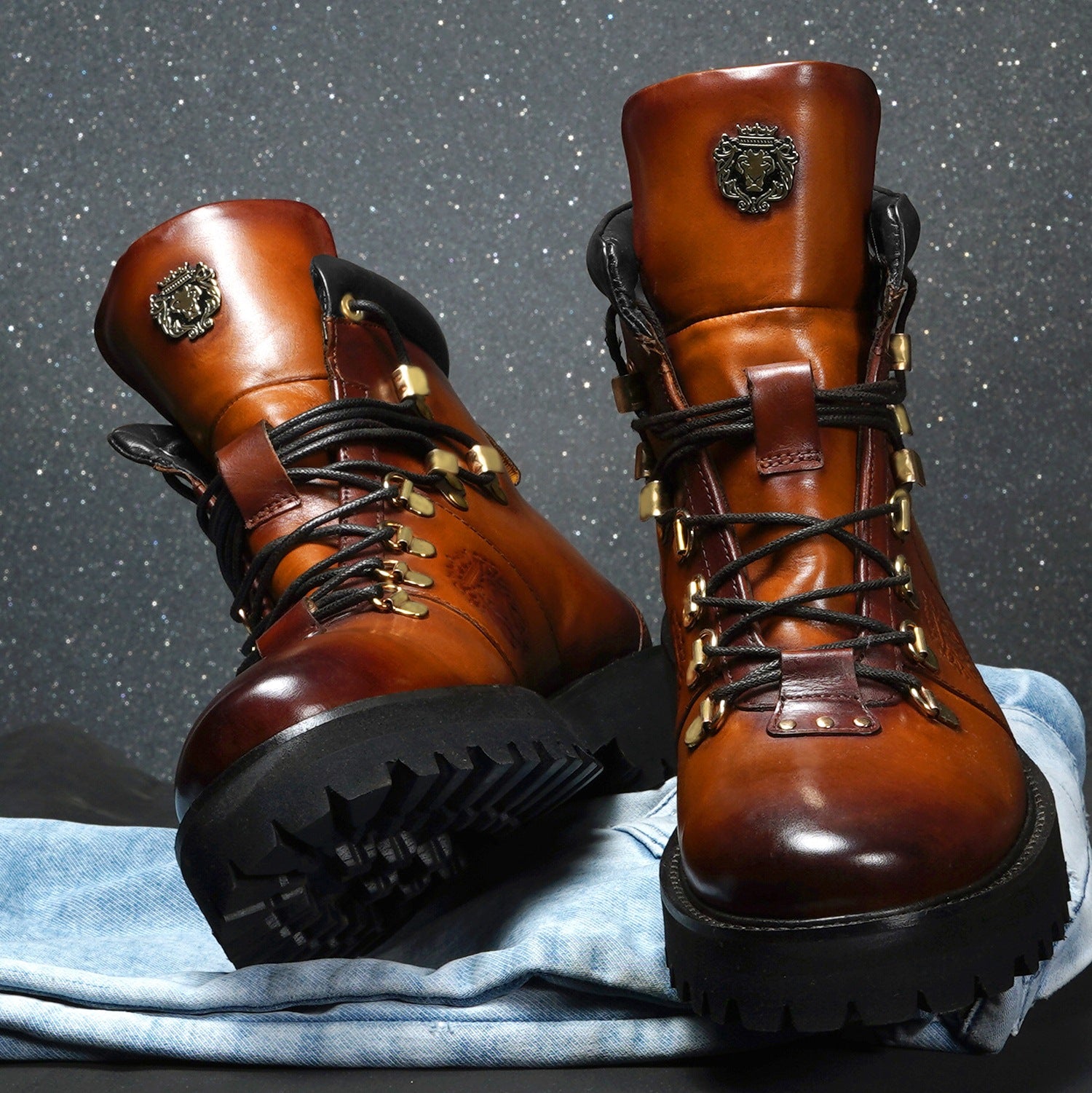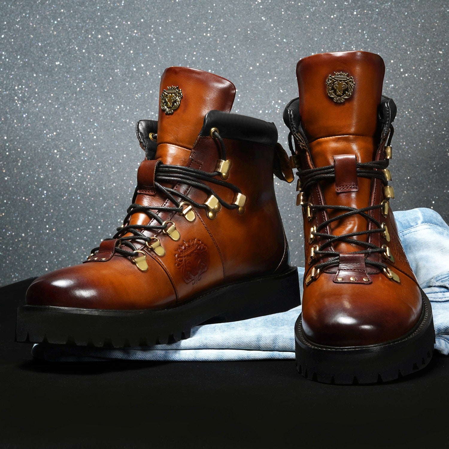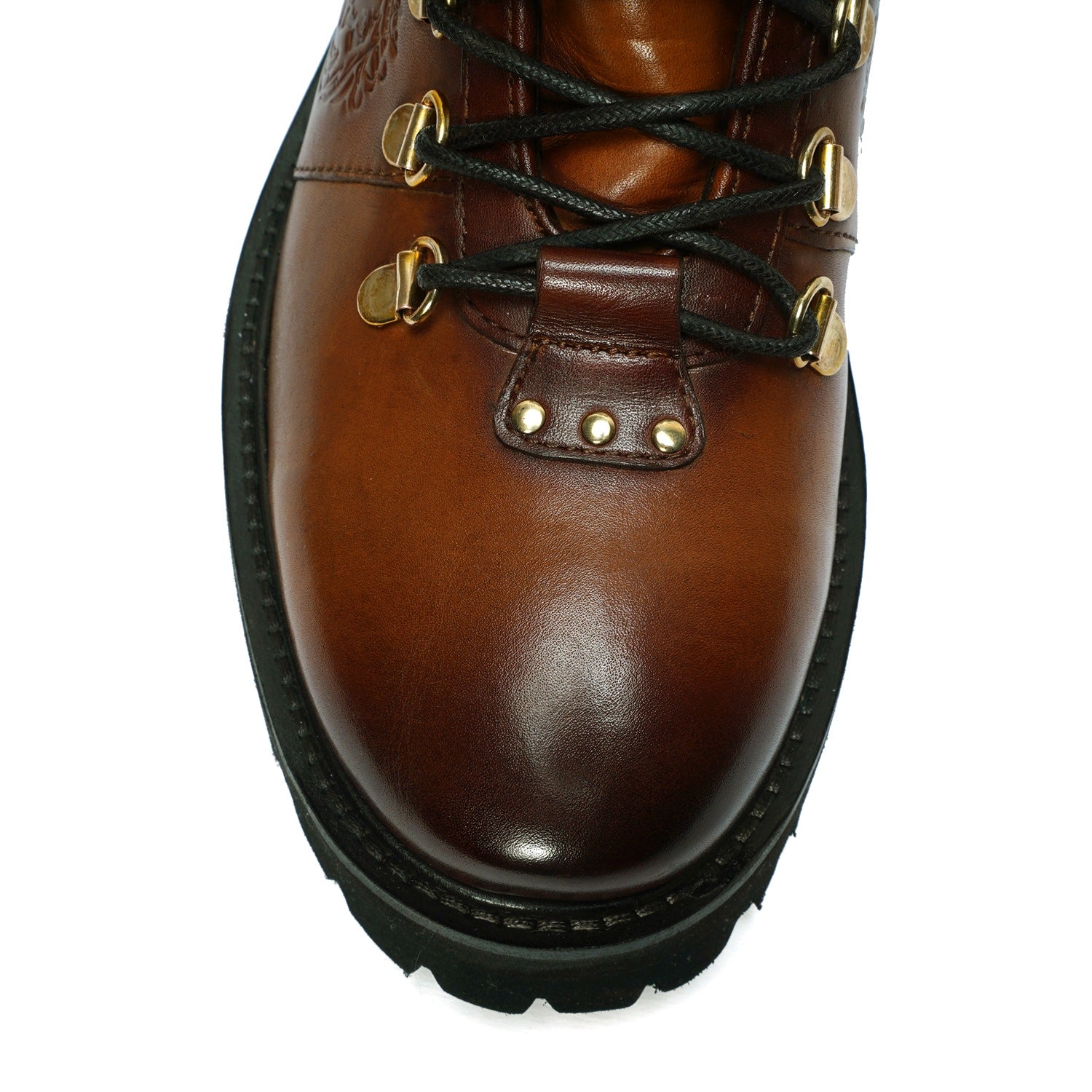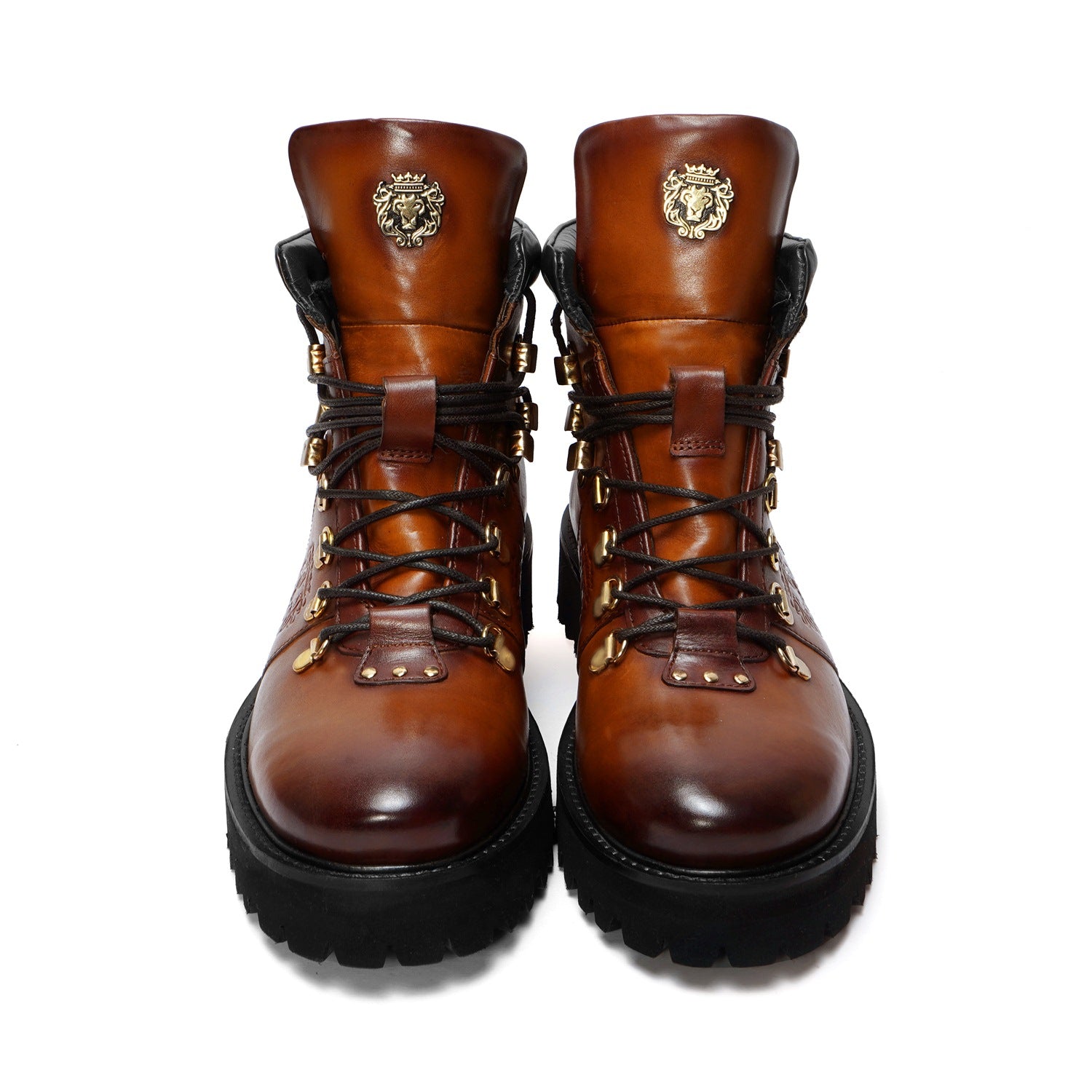 Elevate your style with Brune & Bareskin's ankle boots. Made from genuine tan leather, these boots are light in weight and perfect for hiking or everyday wear. The rubber sole provides comfort and stability, while the patina finish and burnish effect add a touch of sophisticated luxury. Designed with a combat shoe structure and metal shoe eyelet, these handcrafted boots feature an embossed lion logo and padded collar for a refined, yet rugged look. Plus, the new design allows for faster lace tying. Available in a timeless tan color, these ankle boots are a must-have for any fashion-forward individual.