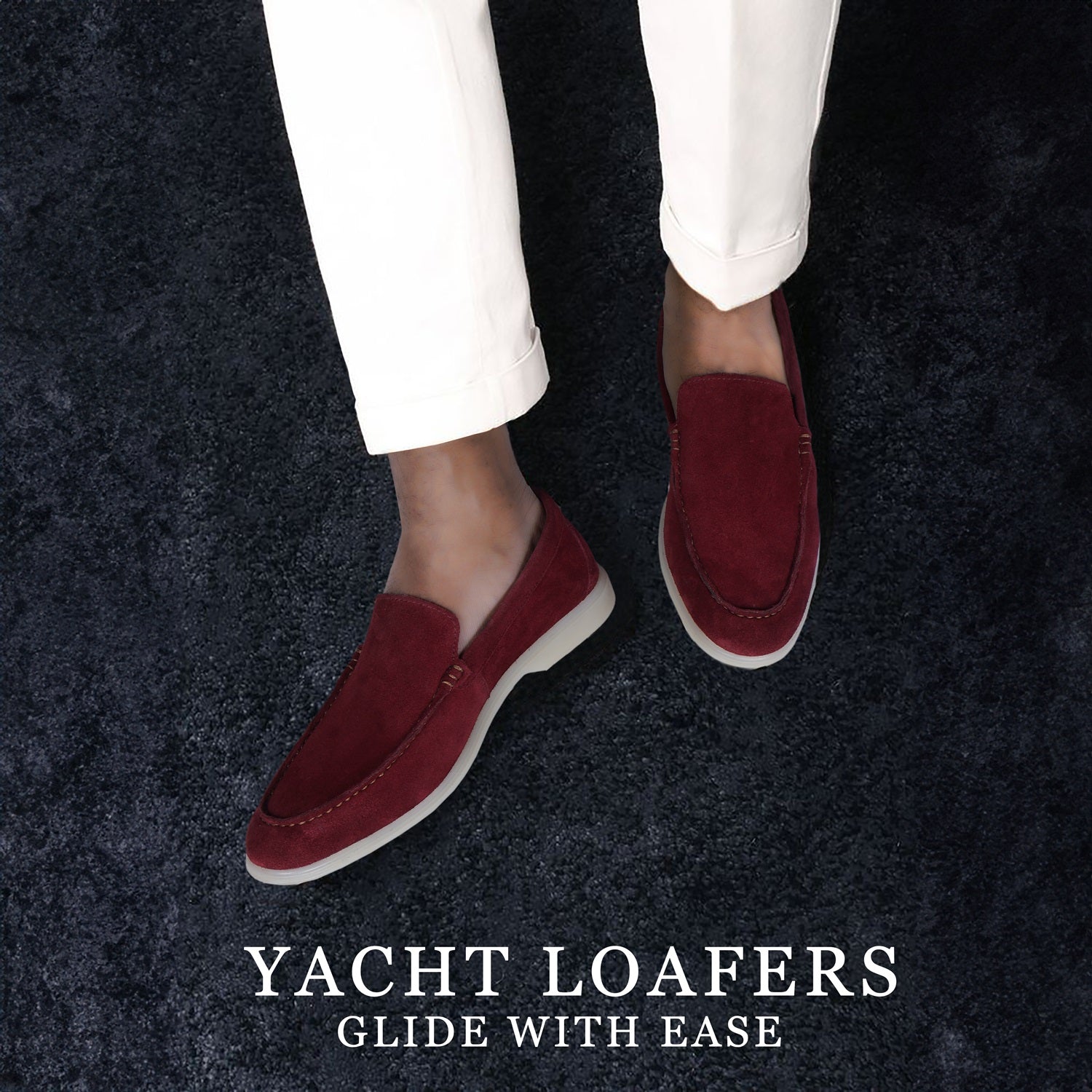 Experience luxury and exclusivity with Brune & Bareskin's hand crafted Suede Yacht Shoes in Wine Leather. These men's loafers are perfect for summer, featuring a vibrant wine color and slip-on design for maximum comfort. The suede leather offers a better grip, making them the perfect choice for any yacht adventure. Elevate your summer casual collection with these one-of-a-kind yacht shoes.