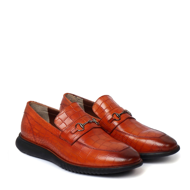 For the office or your day-to-day look, this Wine loafer offers a stylish upgrade to your wardrobe. This classic men's shoe is made from luxurious deep cut croco-textured leather and features an eye-catching golden horse-bit buckle detailing on vamp. This loafer is an elegant choice for any occasion. The light-weight rubberized heel sole ensures superior comfort and ease of movement. So why not experience the luxury for yourself?