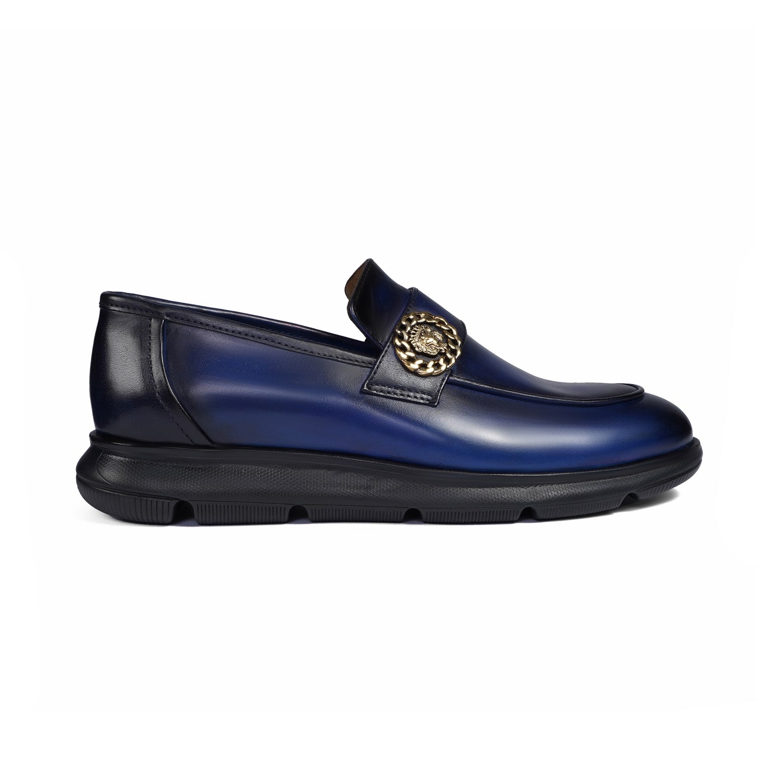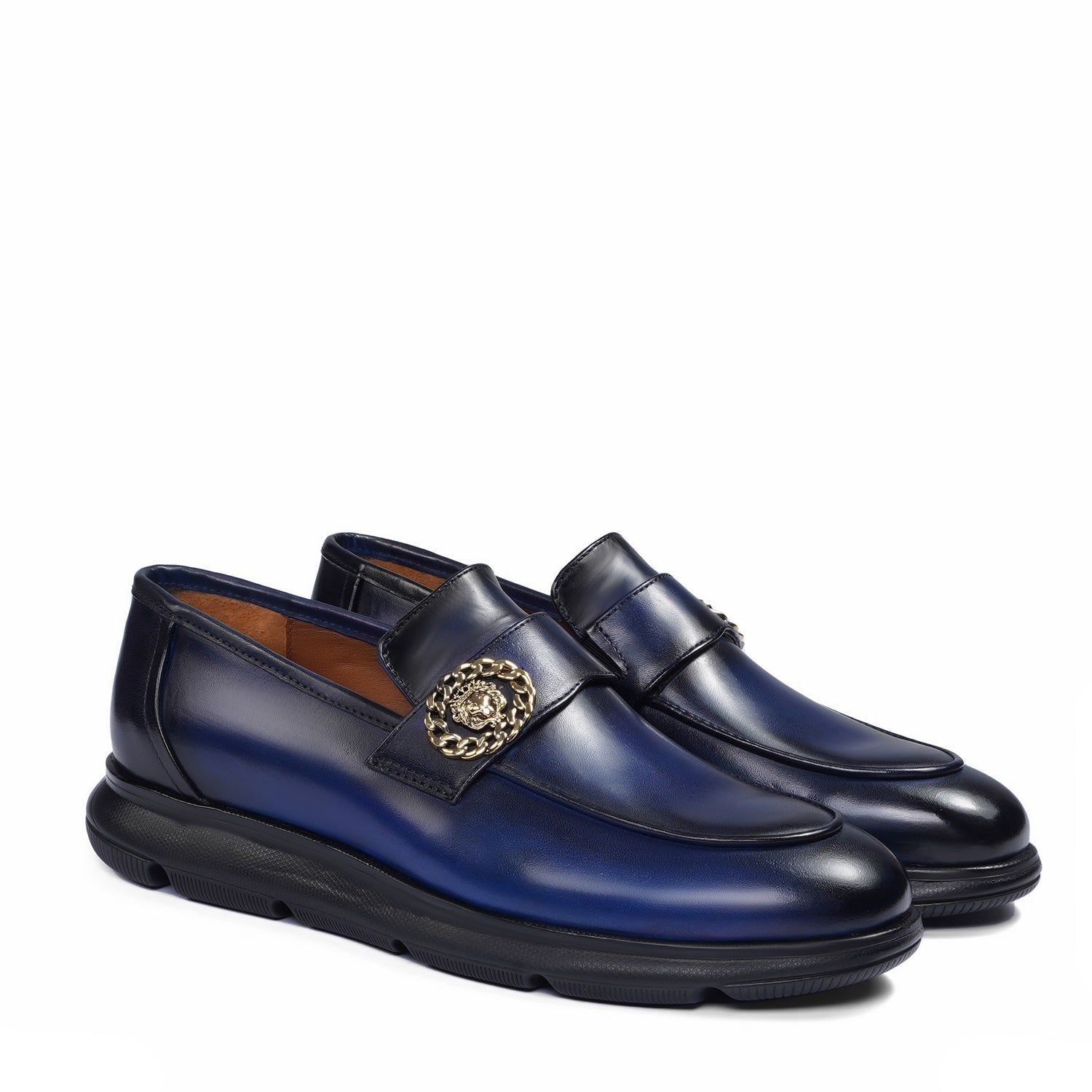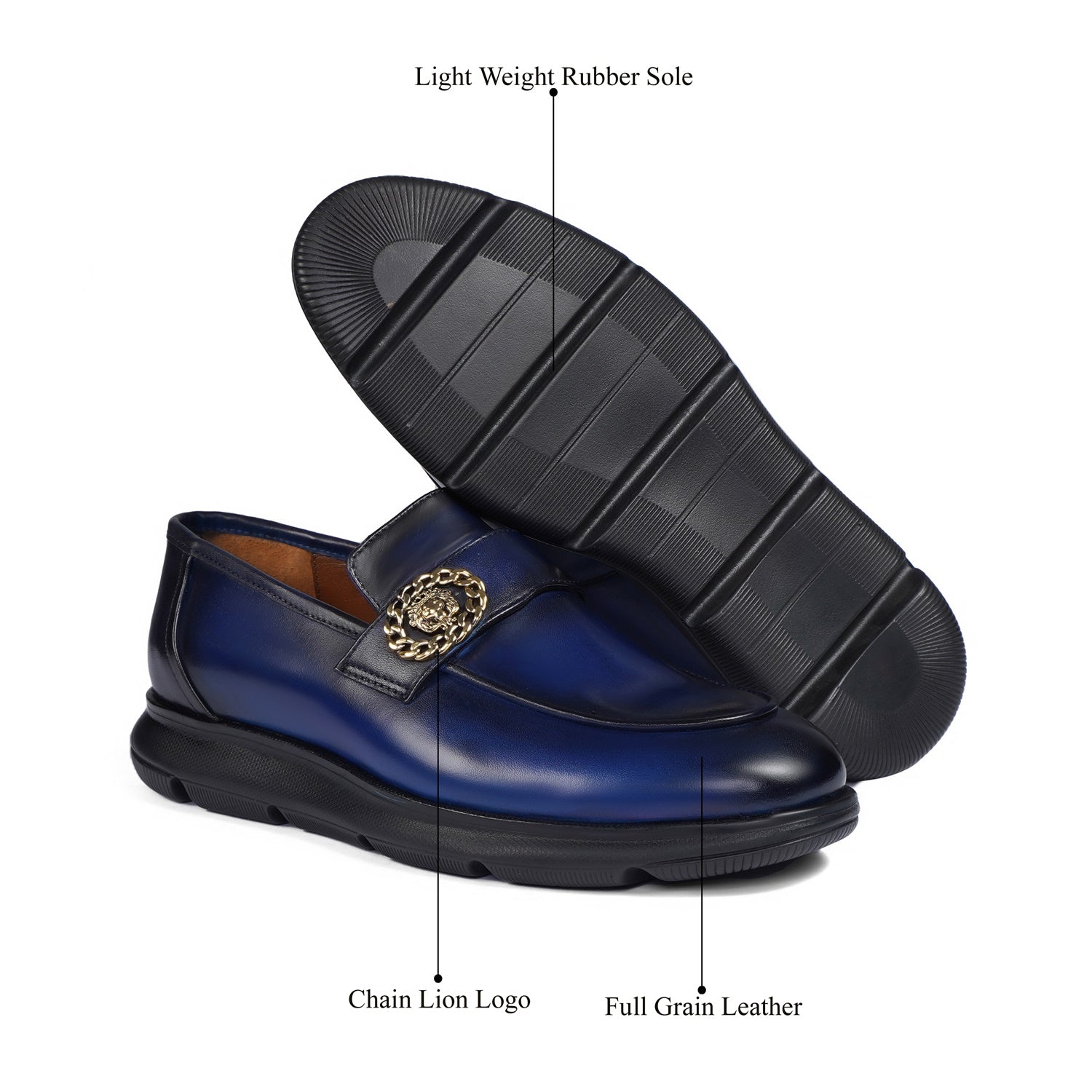 Supple leather upper in vibrant blue, paired with a durable lightweight rubber sole for superior traction and all-day flexibility. Cushioned insole provides cloud-like arch support and shock absorption, ideal for urban strides or casual lounging. Golden metallic lion chain emblem adds a striking, customizable patina-ready accent that evolves with wear.