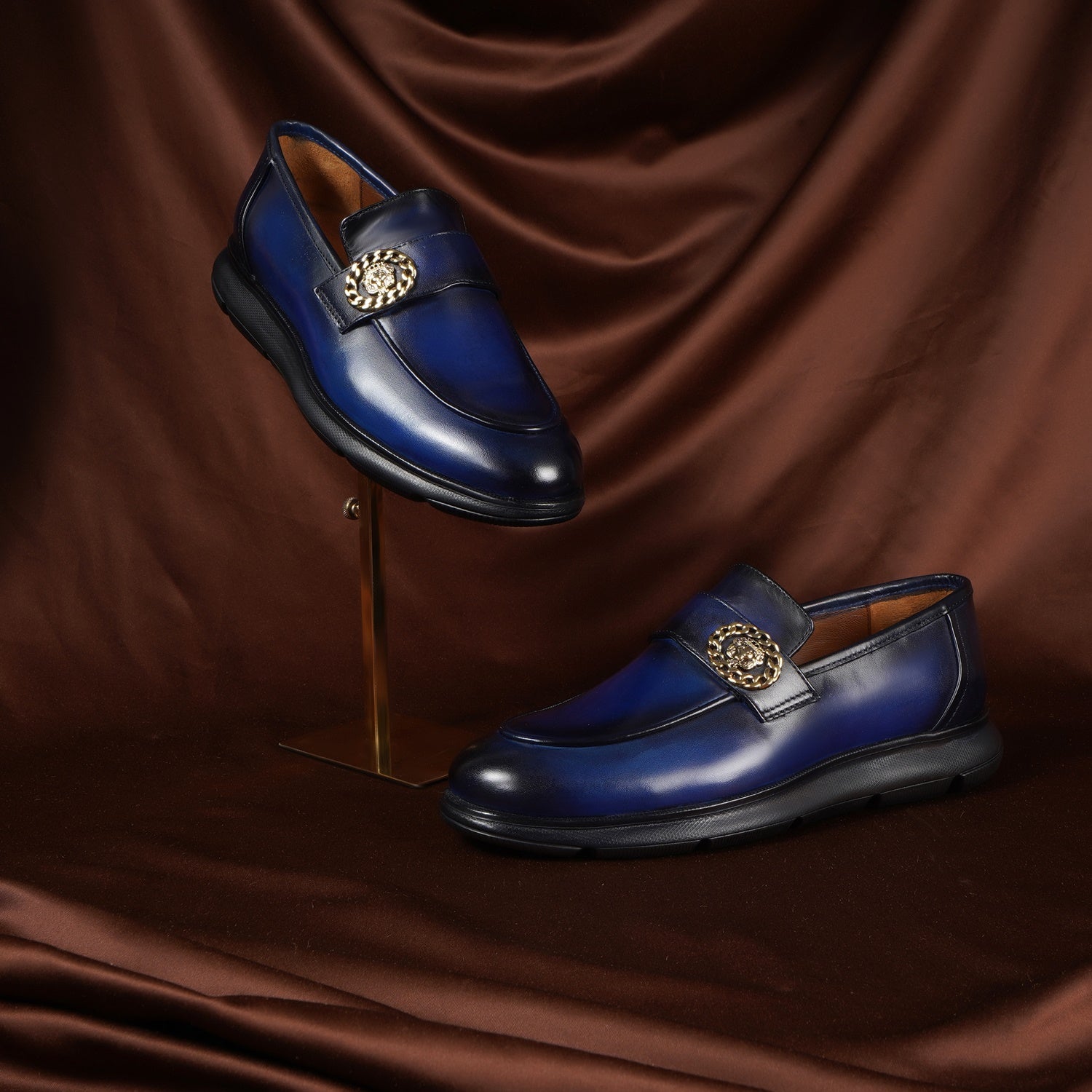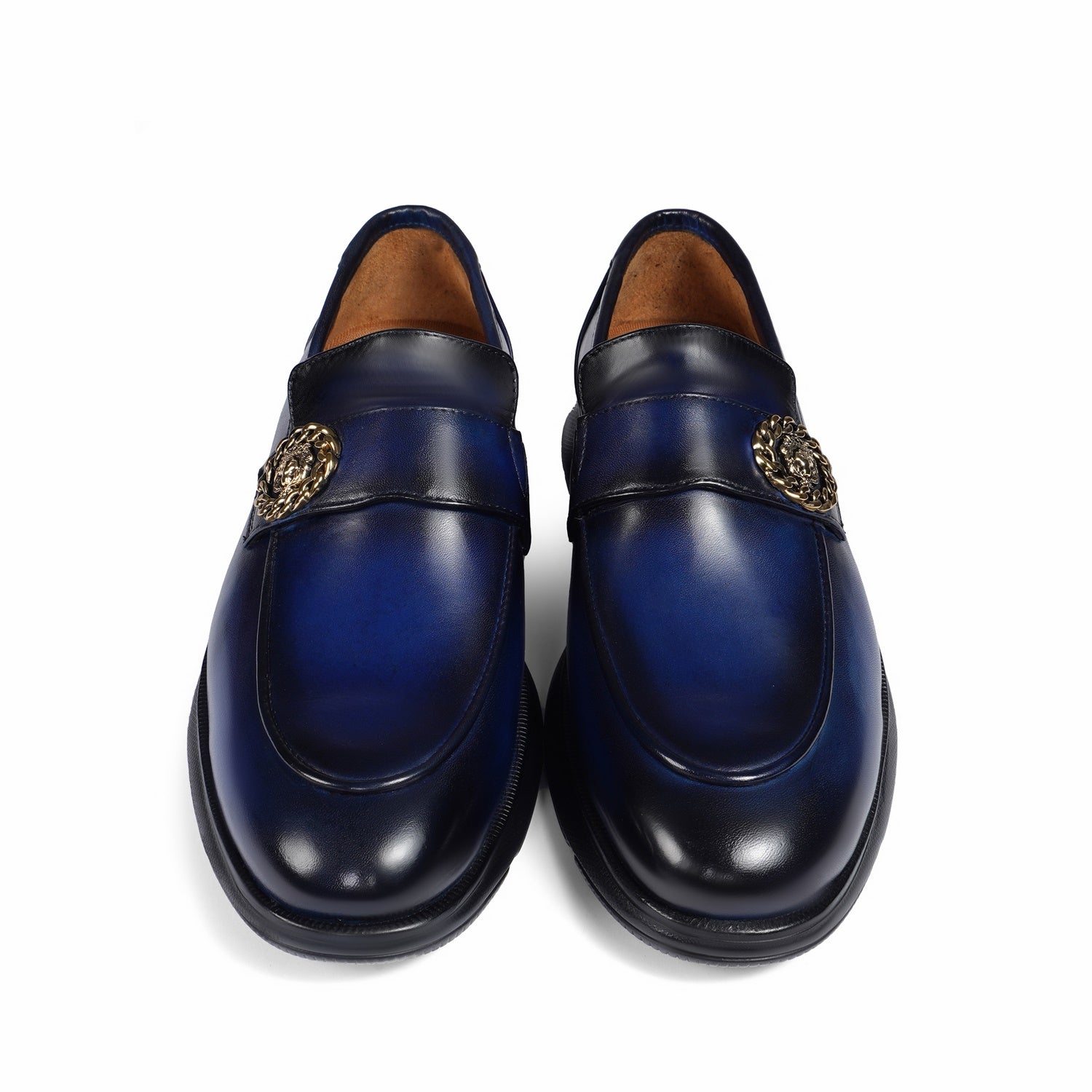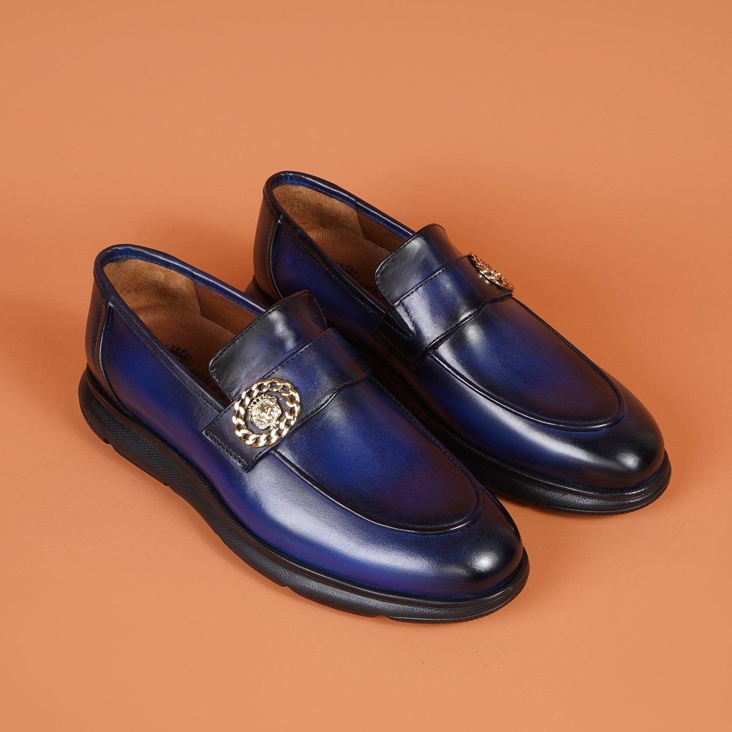 Supple leather upper in vibrant blue, paired with a durable lightweight rubber sole for superior traction and all-day flexibility. Cushioned insole provides cloud-like arch support and shock absorption, ideal for urban strides or casual lounging. Golden metallic lion chain emblem adds a striking, customizable patina-ready accent that evolves with wear.