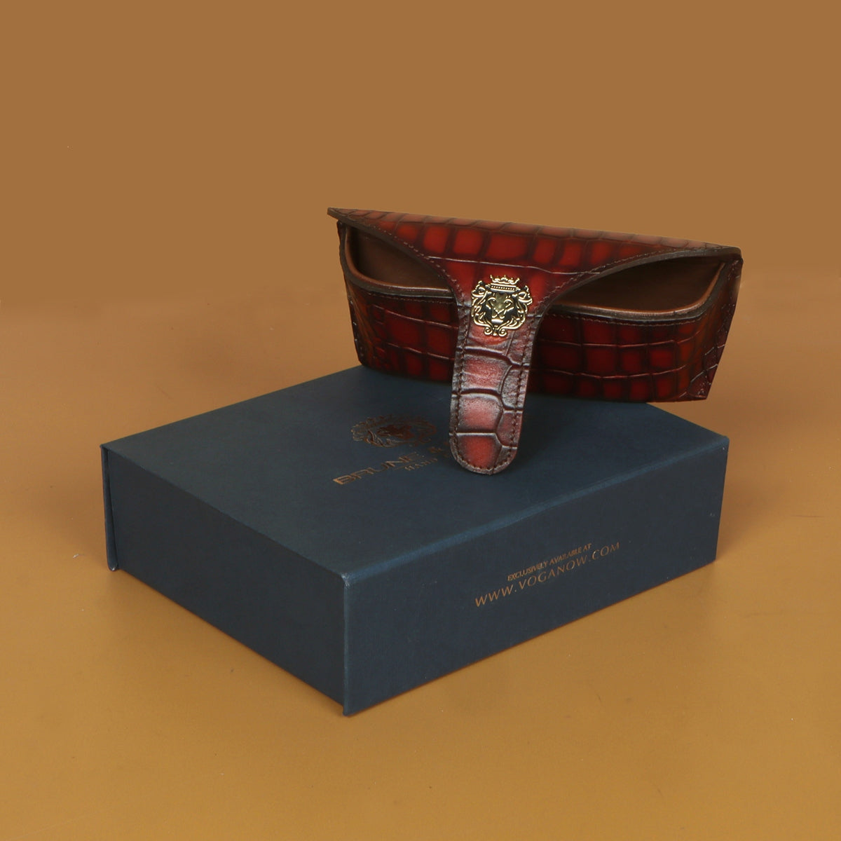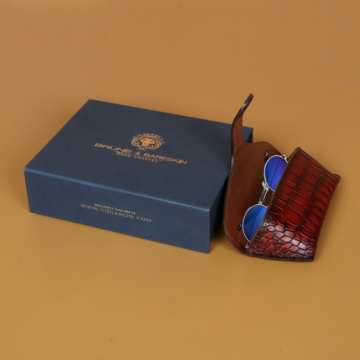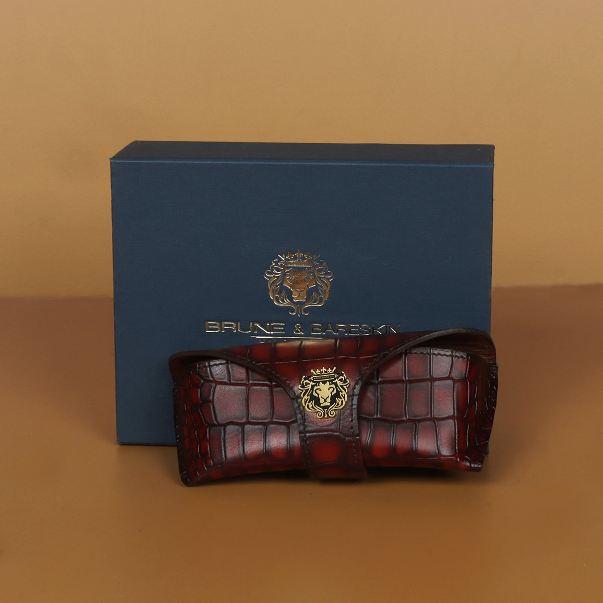 Carry your Eye wears with this stylish deep cut croco textured Leather Cover. Brune & Bareskin presents this special Smokey finish cognac leather eye-wear cover to protect and keep your Sunglasses. It is a must-have accessory in your bag. This deep cut Smokey finish leather air-pod cover is quite very handy for travelers as well. The stylish look makes it an eye catching accessory. You can get it made in any color shade you want along with the name initials with our Bespoke Service.