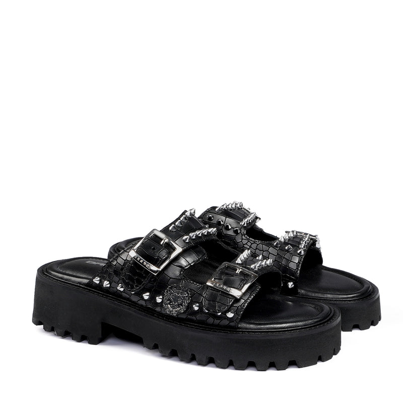 Lug Sole Adjustable Buckle Leather Slipper in Snake Skin Textured