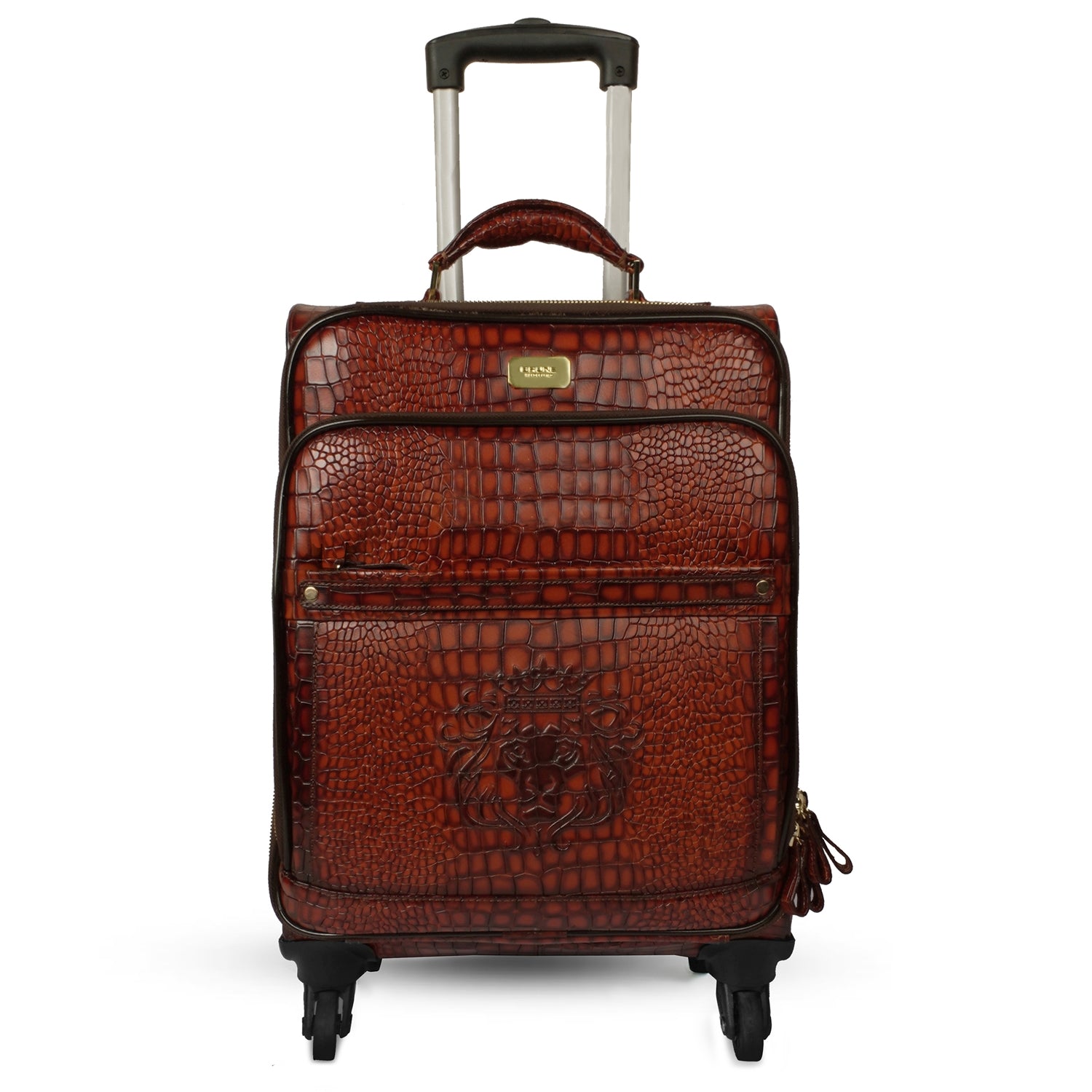 Luggage Strolley Leather Tan Croco Textured with Diamond Stitched Quad Wheel Cabin Bag