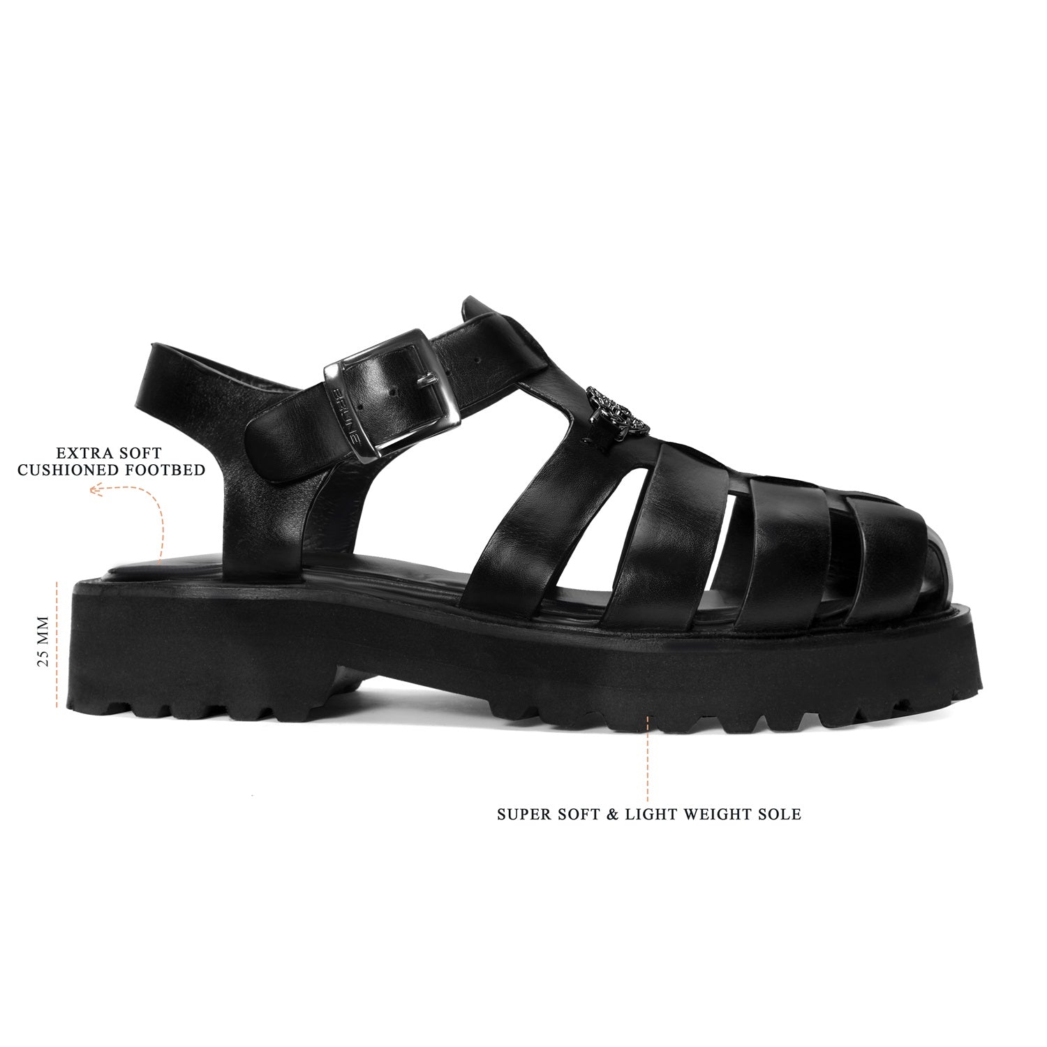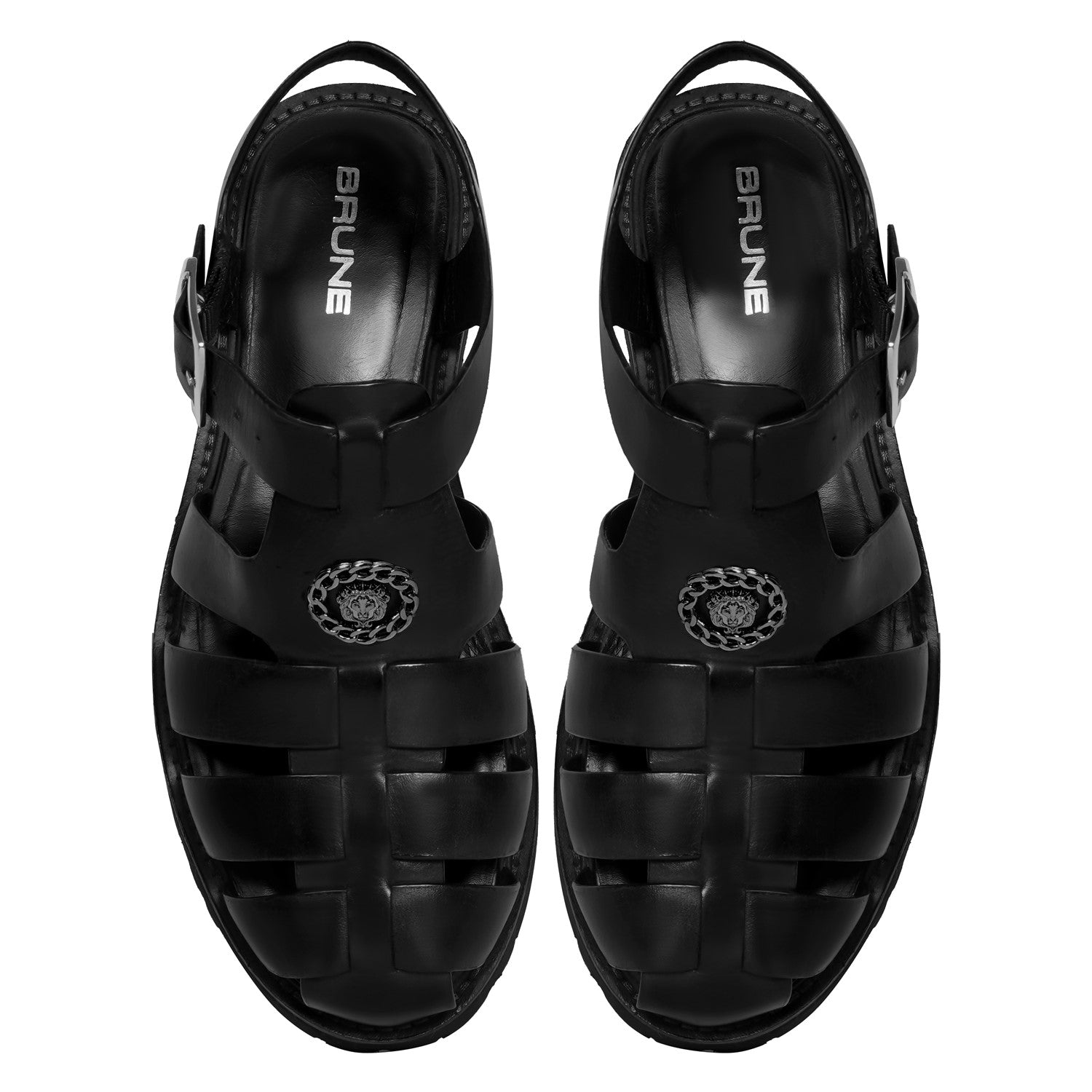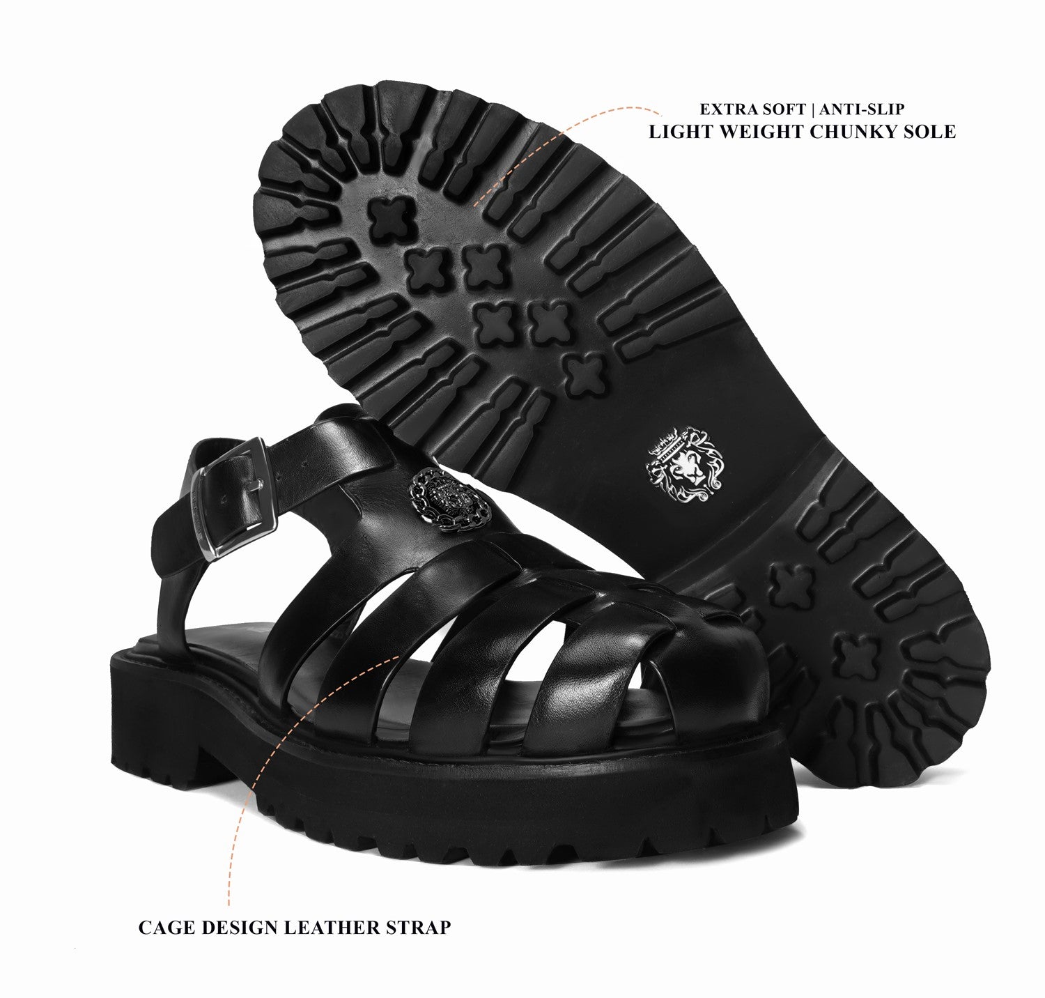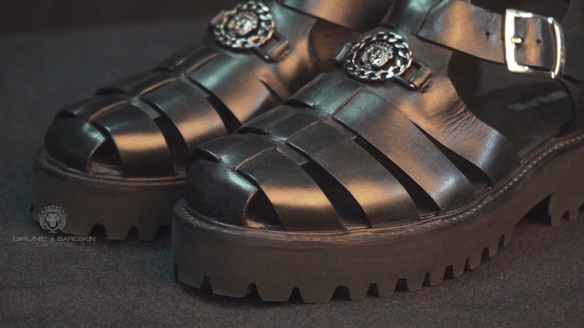 Step out in style with the luxurious black cage sandal by Brune & Bareskin. Handcrafted with premium quality leather, this summer collection sandal features a stylish and refined look with a gun metal chain embellishment lion logo buckle detailing. The adjustable buckle strap and comfortable inner sole make for a perfect fit, while the lightweight chunky sole and rubberized anti-skid outer sole provide both style and practicality. Upgrade your summer footwear with Brune & Bareskin.