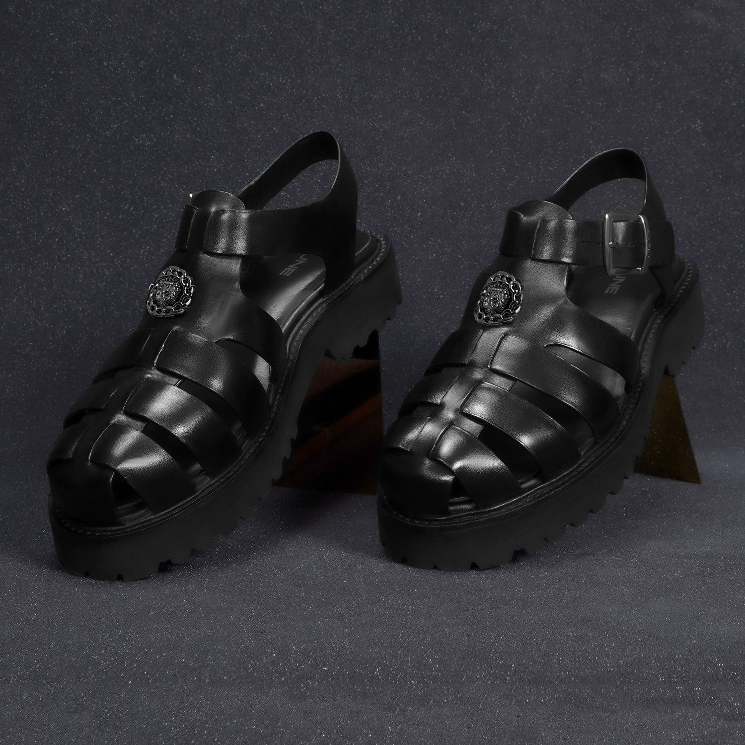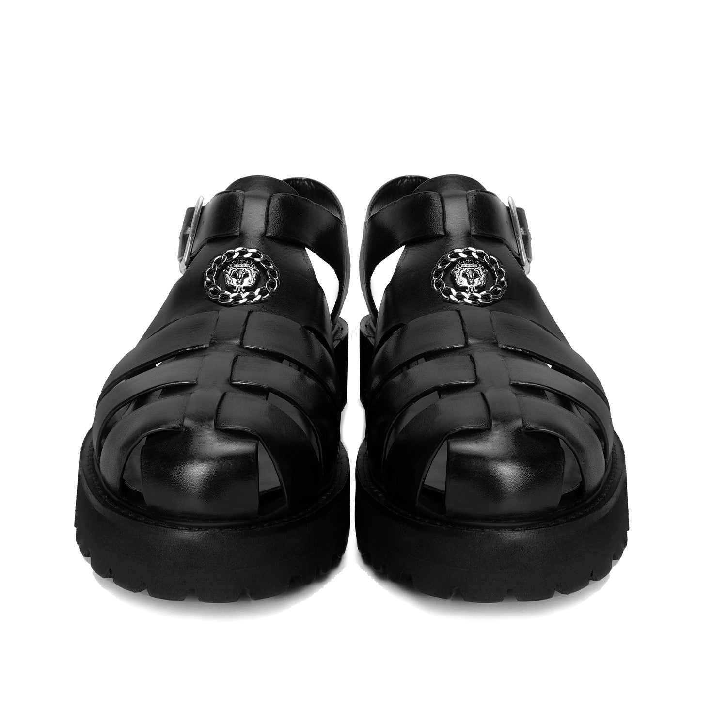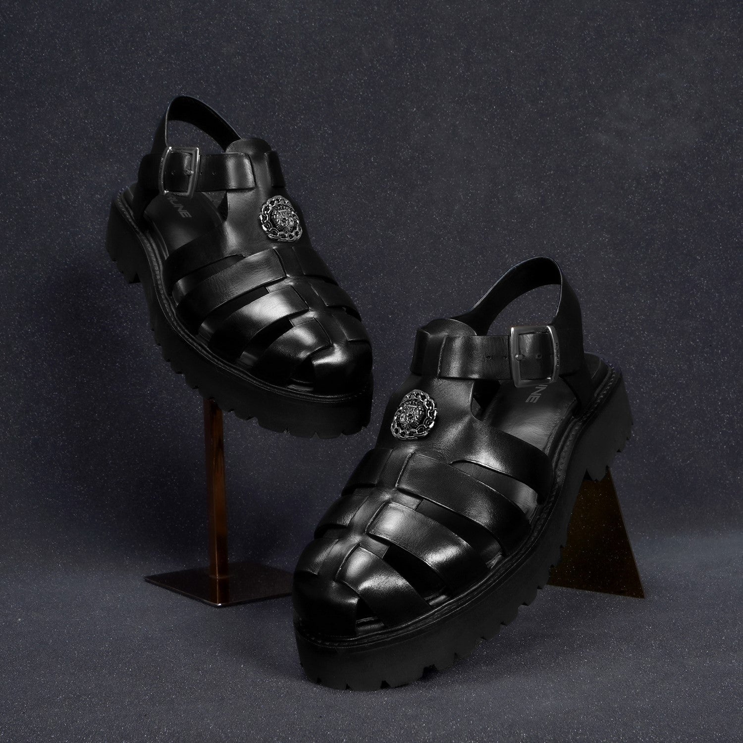 Step out in style with the luxurious black cage sandal by Brune & Bareskin. Handcrafted with premium quality leather, this summer collection sandal features a stylish and refined look with a gun metal chain embellishment lion logo buckle detailing. The adjustable buckle strap and comfortable inner sole make for a perfect fit, while the lightweight chunky sole and rubberized anti-skid outer sole provide both style and practicality. Upgrade your summer footwear with Brune & Bareskin.
