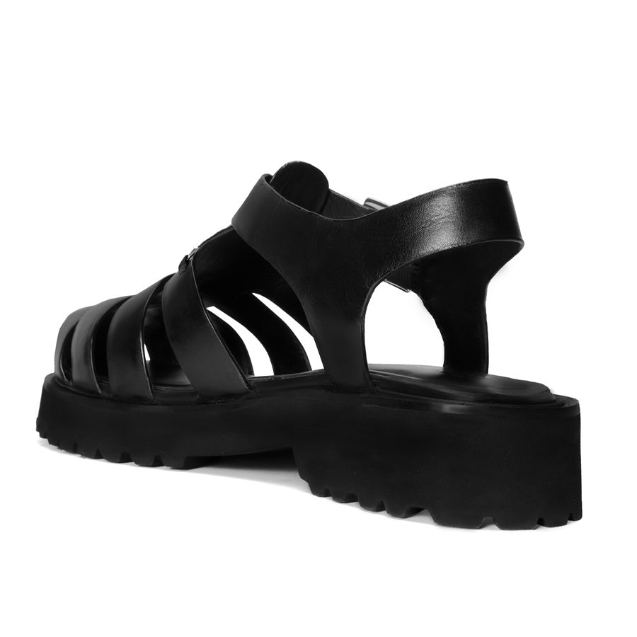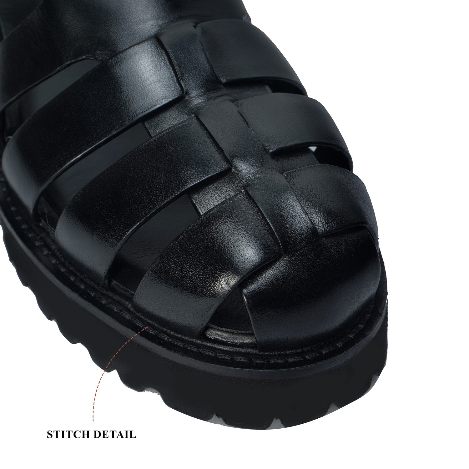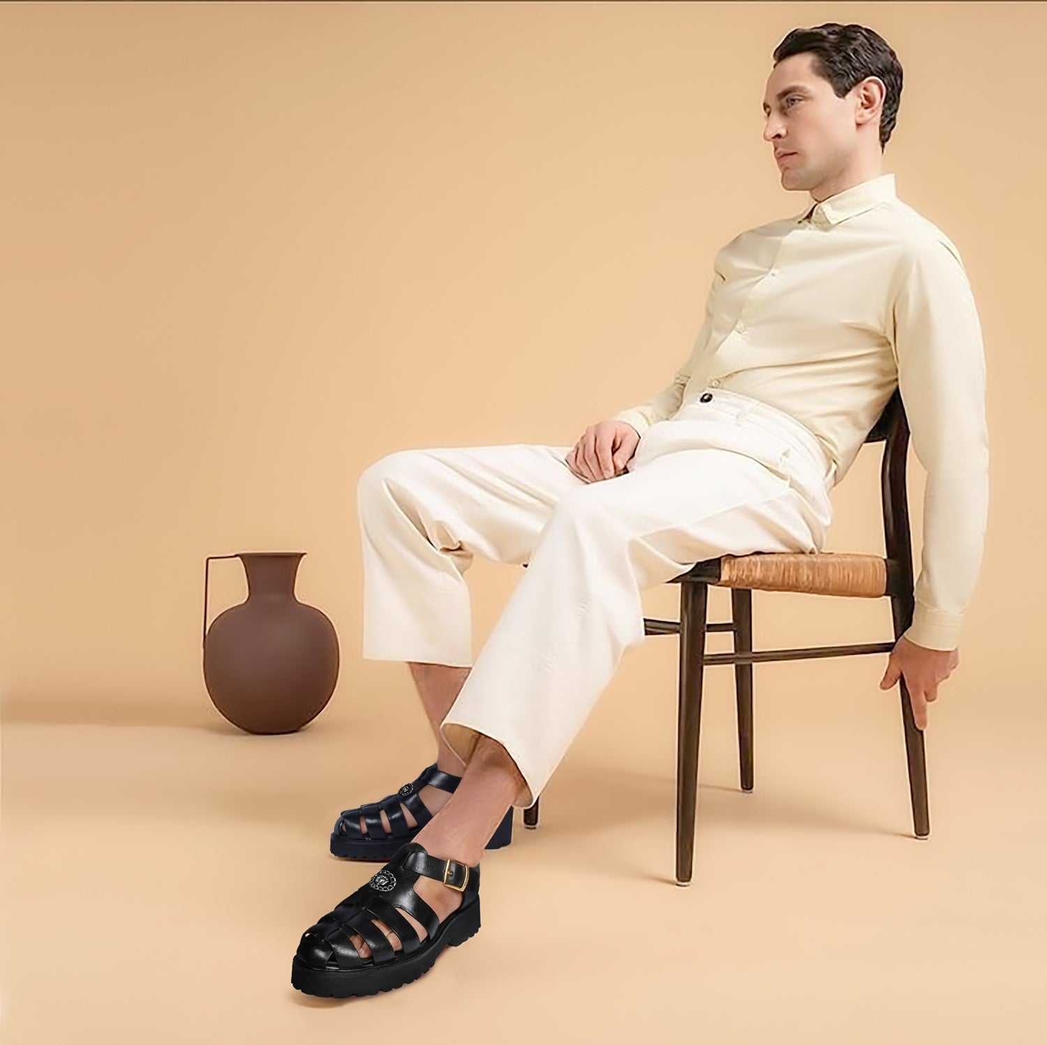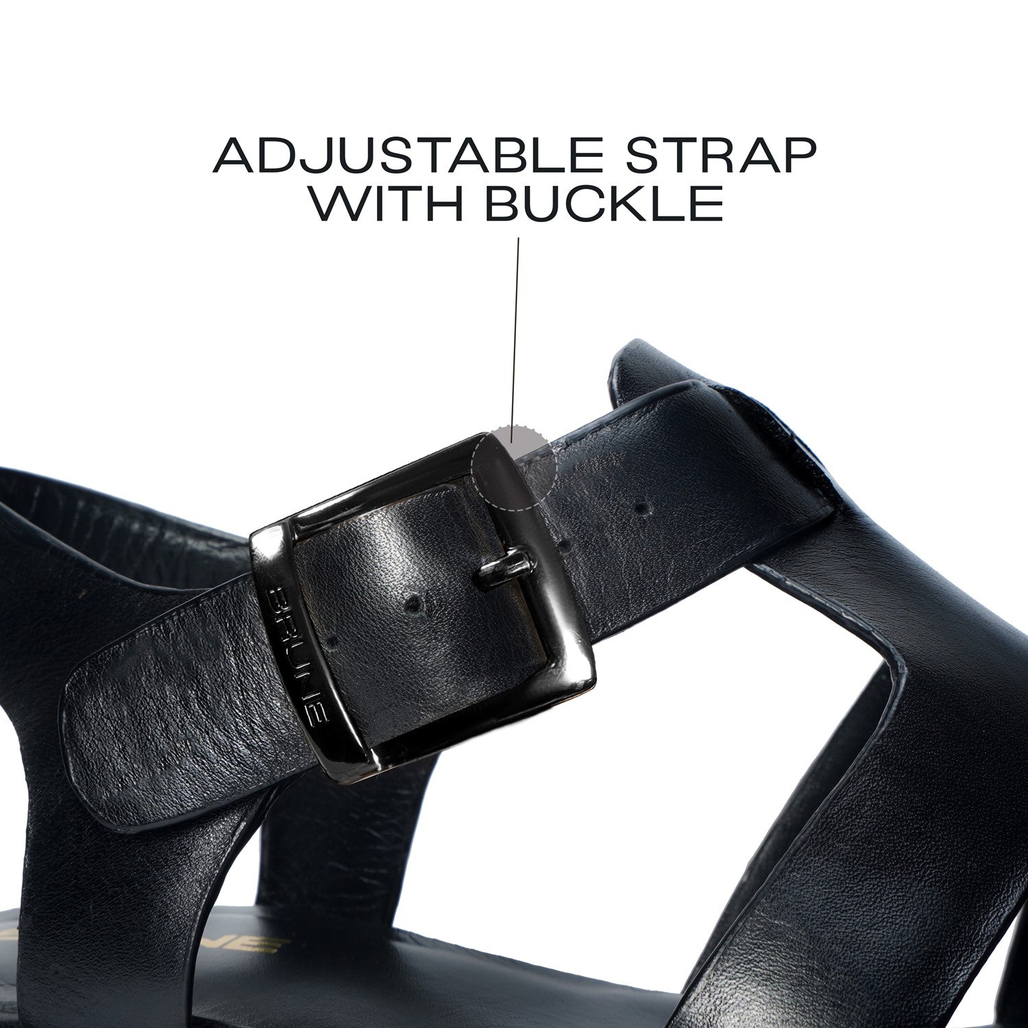 Step out in style with the luxurious black cage sandal by Brune & Bareskin. Handcrafted with premium quality leather, this summer collection sandal features a stylish and refined look with a gun metal chain embellishment lion logo buckle detailing. The adjustable buckle strap and comfortable inner sole make for a perfect fit, while the lightweight chunky sole and rubberized anti-skid outer sole provide both style and practicality. Upgrade your summer footwear with Brune & Bareskin.