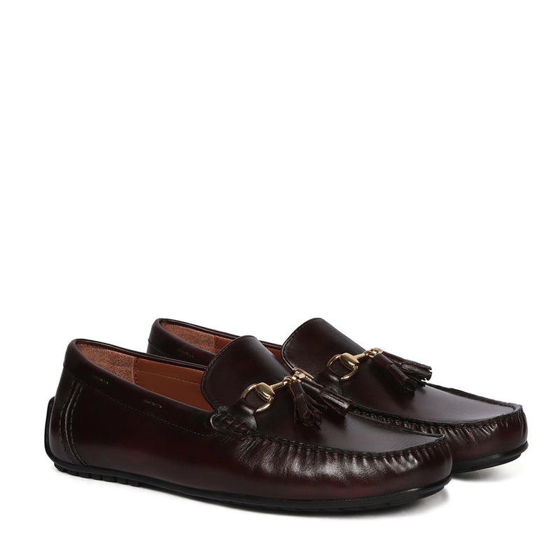 Black color never old or outdated to wear. Black Genuine leather products look very classy when matched with a dark to light color accent. This chic look black leather horse-bit buckle and tassel is a must have for fashion forward folks. The 100% Genuine Leather made ensures the top notch style and quality. Tassels on genuine leather Shoes look very elegant. The black genuine Leather shoe looks lavishing with golden metal horse-bit buckle on it. And when they are made of exemplary fitting and finish as that of the brand Brune & Bareskin, you can be sure that the shoes are nothing short of excellence. It has memory foam insole which remembers and molds according to the foot shape. The Rubberized outer sole provides better grip in different conditions. It is a perfect accessory to wear with formal-to-casual attires at any party or office. This is the shoe you would love to wear again and again.