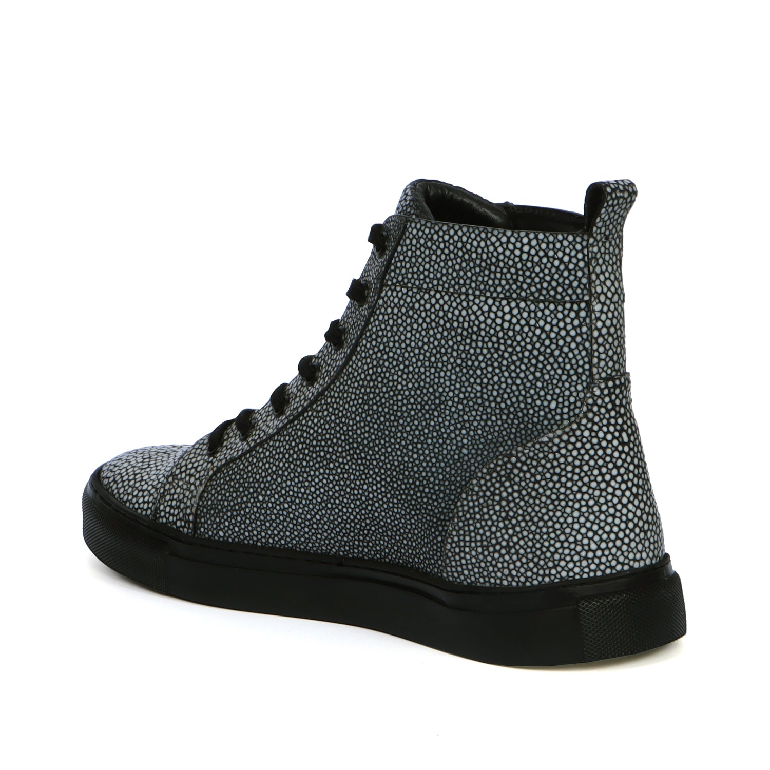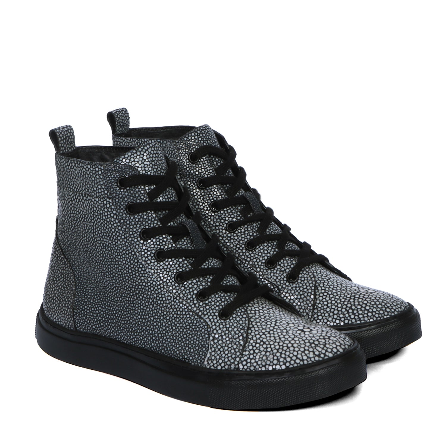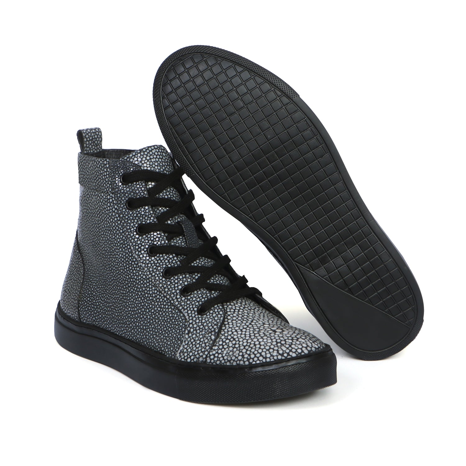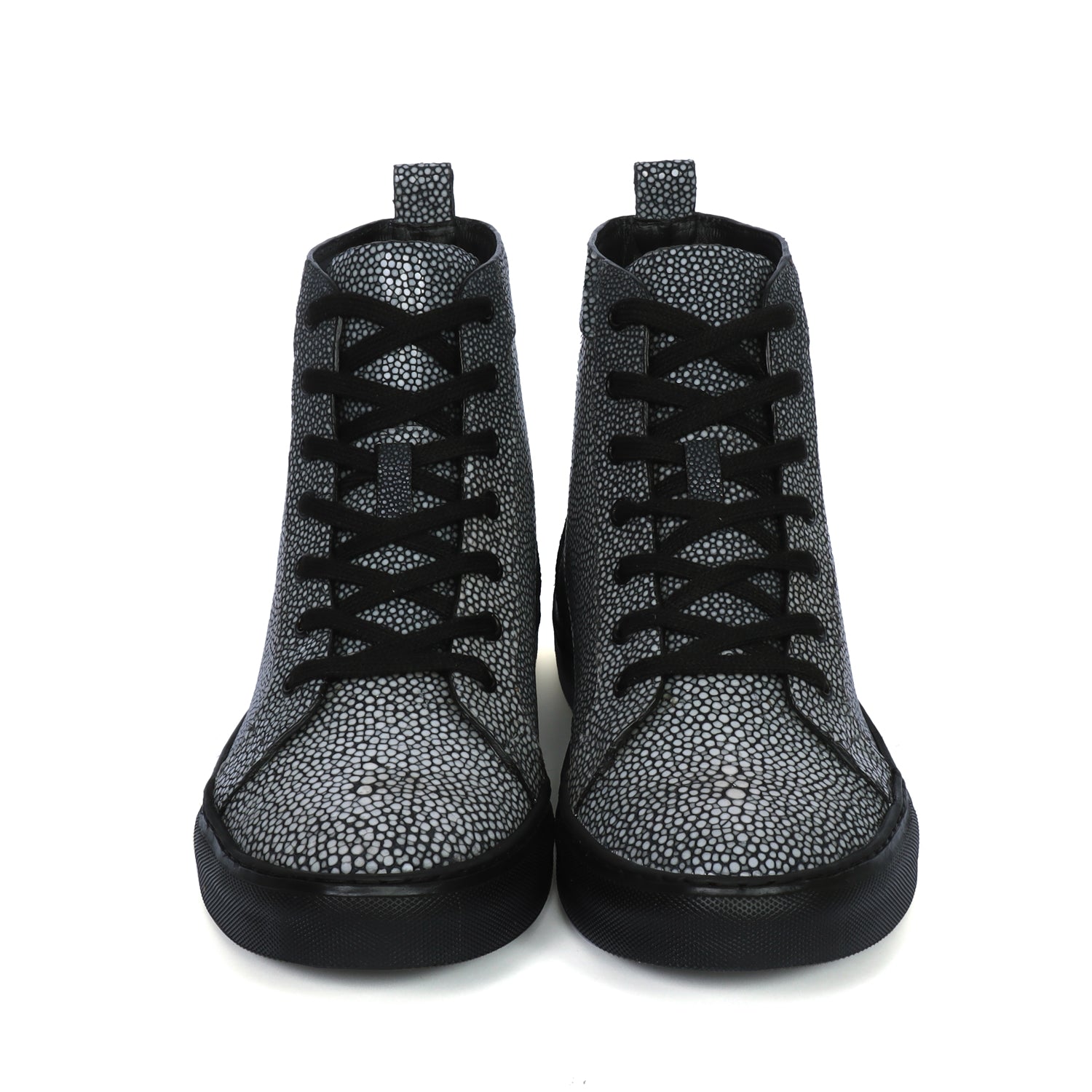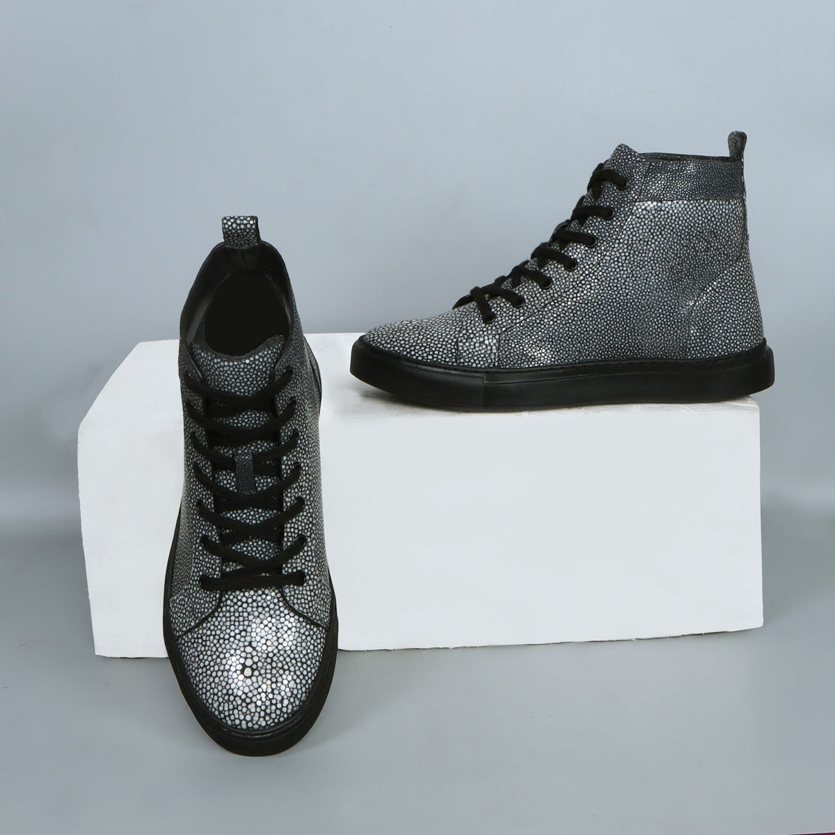 Looking for the perfect shoe to enhance your sophisticated style? Our Luxurious Stingray High Ankle Lace-Up Fish Leather Sneakers are the ideal addition to your wardrobe. Crafted from premium materials, including the highly coveted Stingray leather and flat rubberized sole. Featuring a Diamond Shaped Calcium Deposit in the front middle, these luxury shoes offer comfortable, all-day wear and stylish appeal. This sneakers are perfect for those who appreciate style and comfort. Embrace a timeless look with these luxurious shoes.