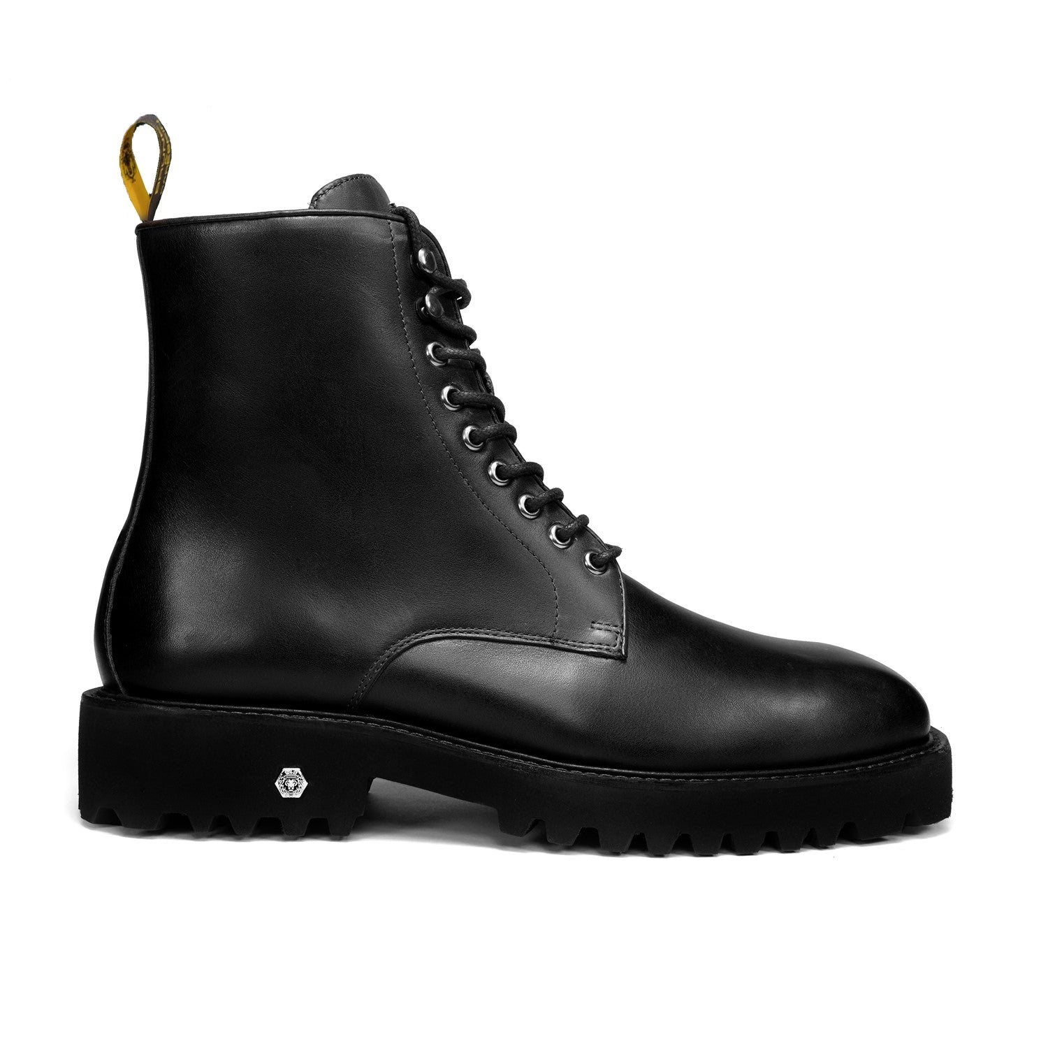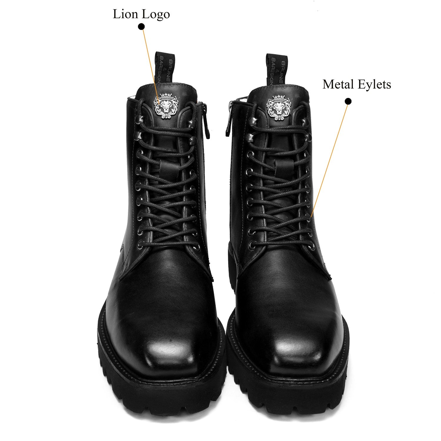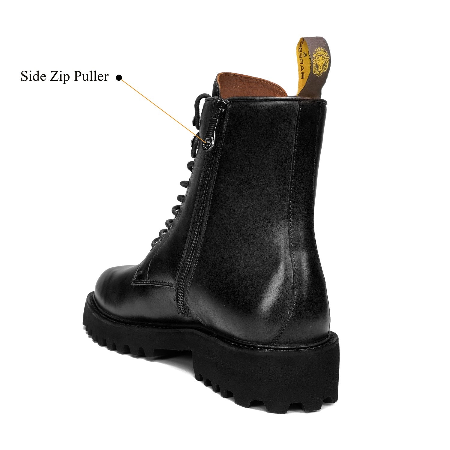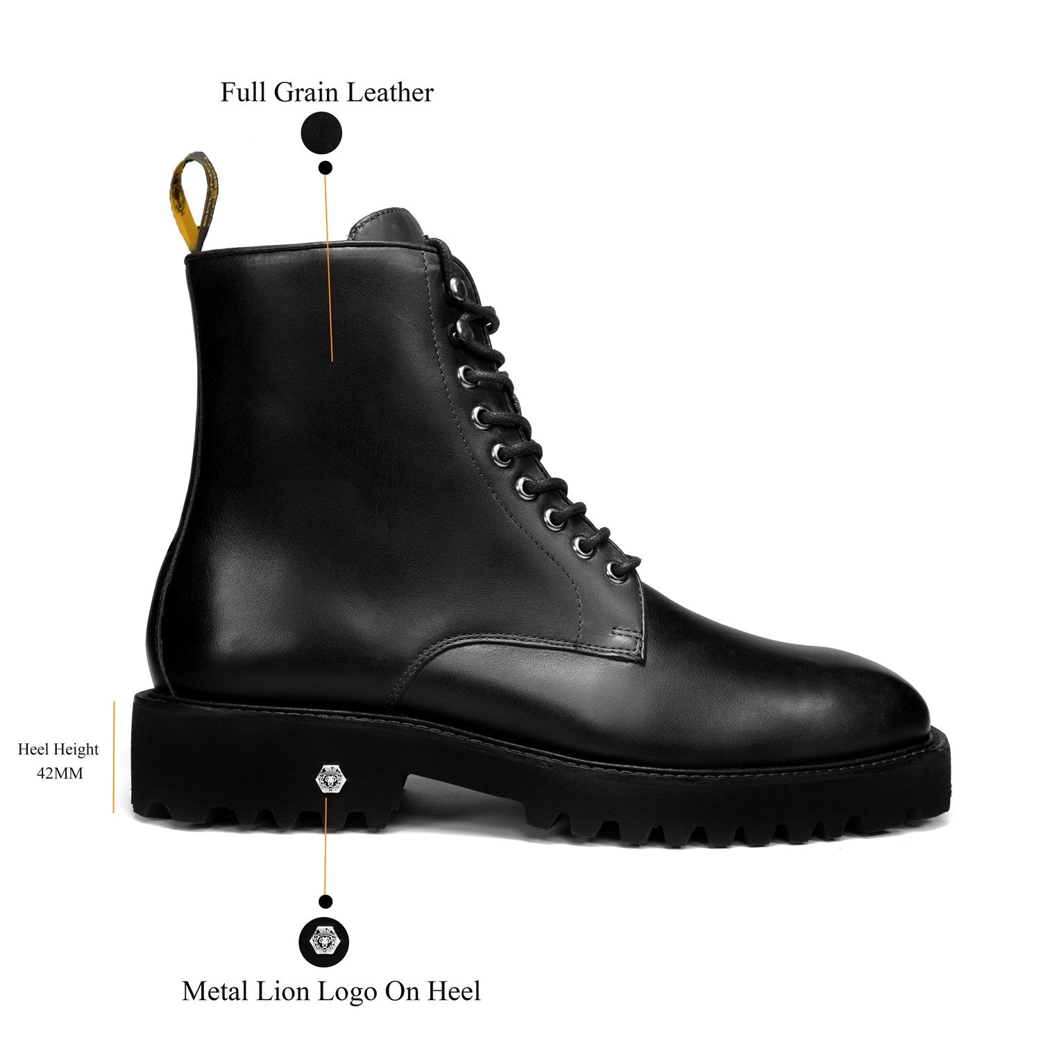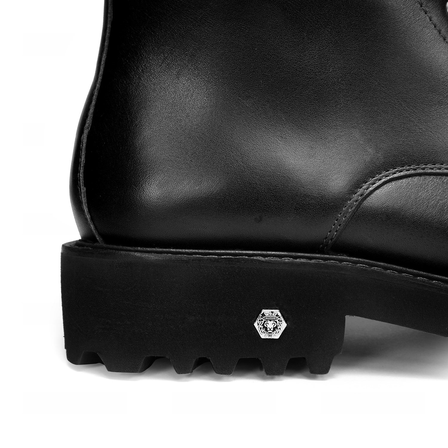 Designed for both rugged performance and sophisticated style, the boots feature metal eyelets and structured laces that provide a secure fit and a bold look. The side zipper ensures easy wearability without compromising the classic lace-up aesthetic. Built with a lightweight chunky sole, these boots provide superior grip and all-day comfort, making them ideal for urban streets or long hours on foot. The signature lion logo detailing on the heel and tongue stands as a mark of heritage, power, and craftsmanship. With a heel height of 42MM, these boots add subtle elevation while maintaining stability.