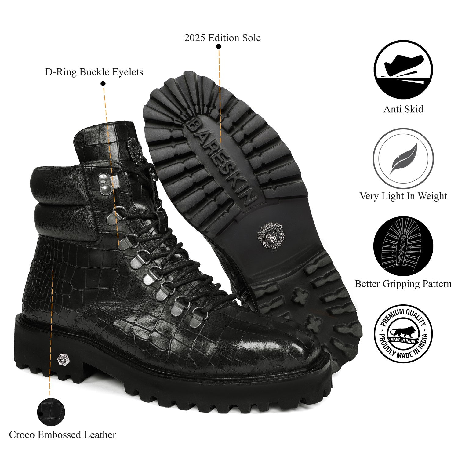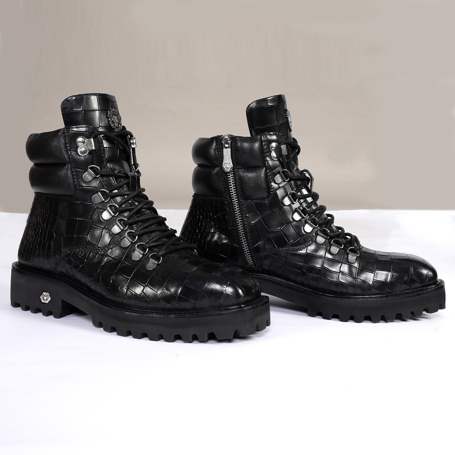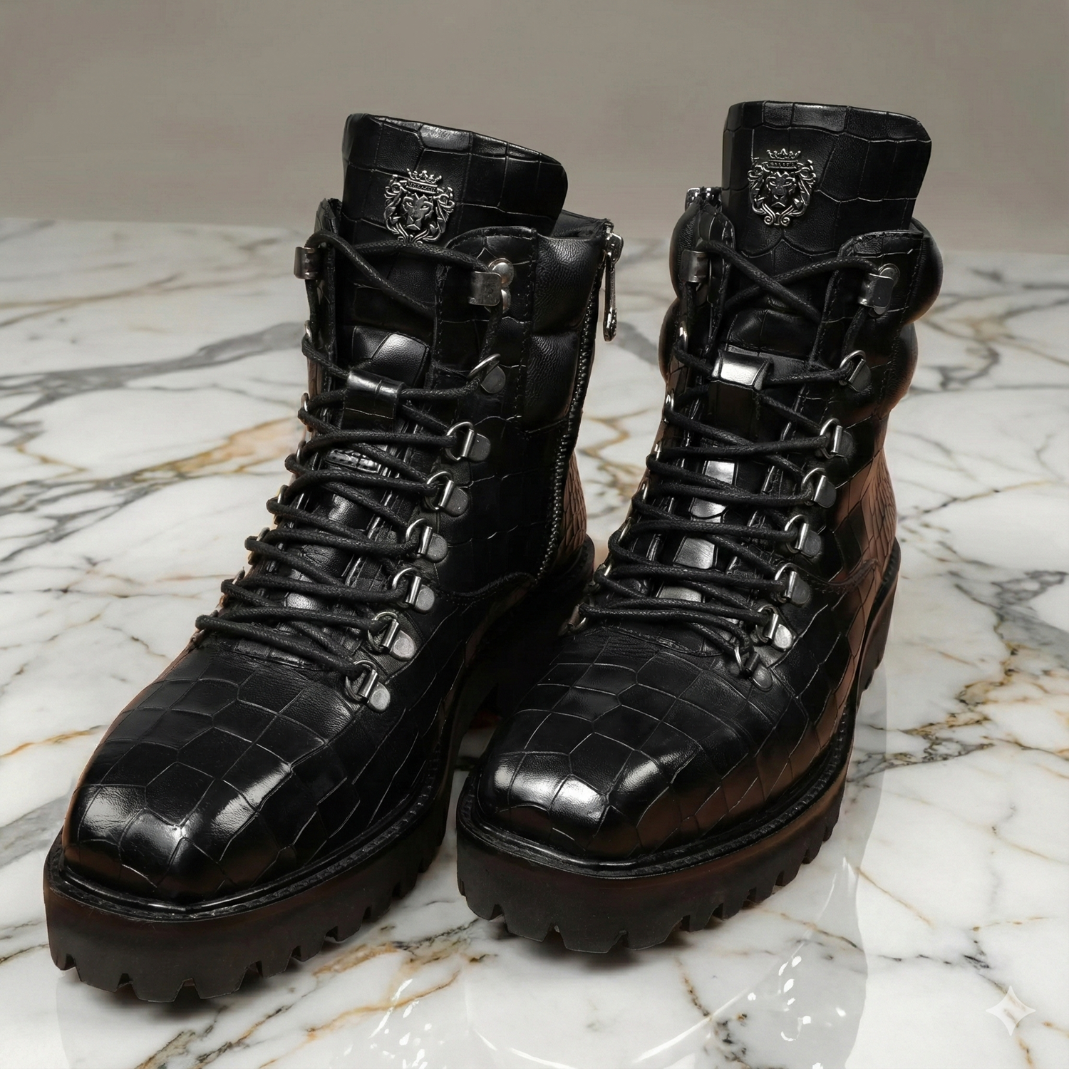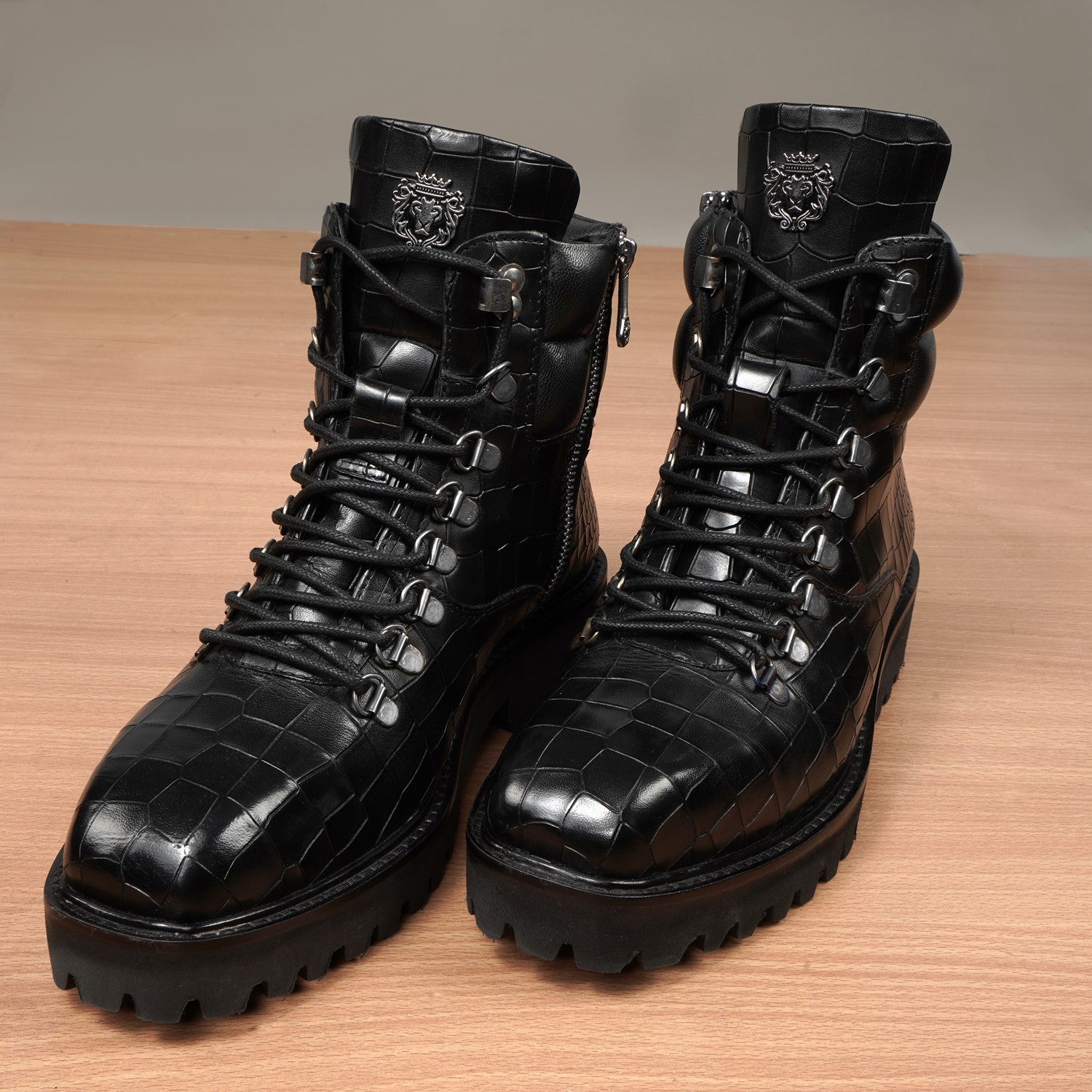 Luxury Black High-Top Croco Embossed Leather Chunky Boots