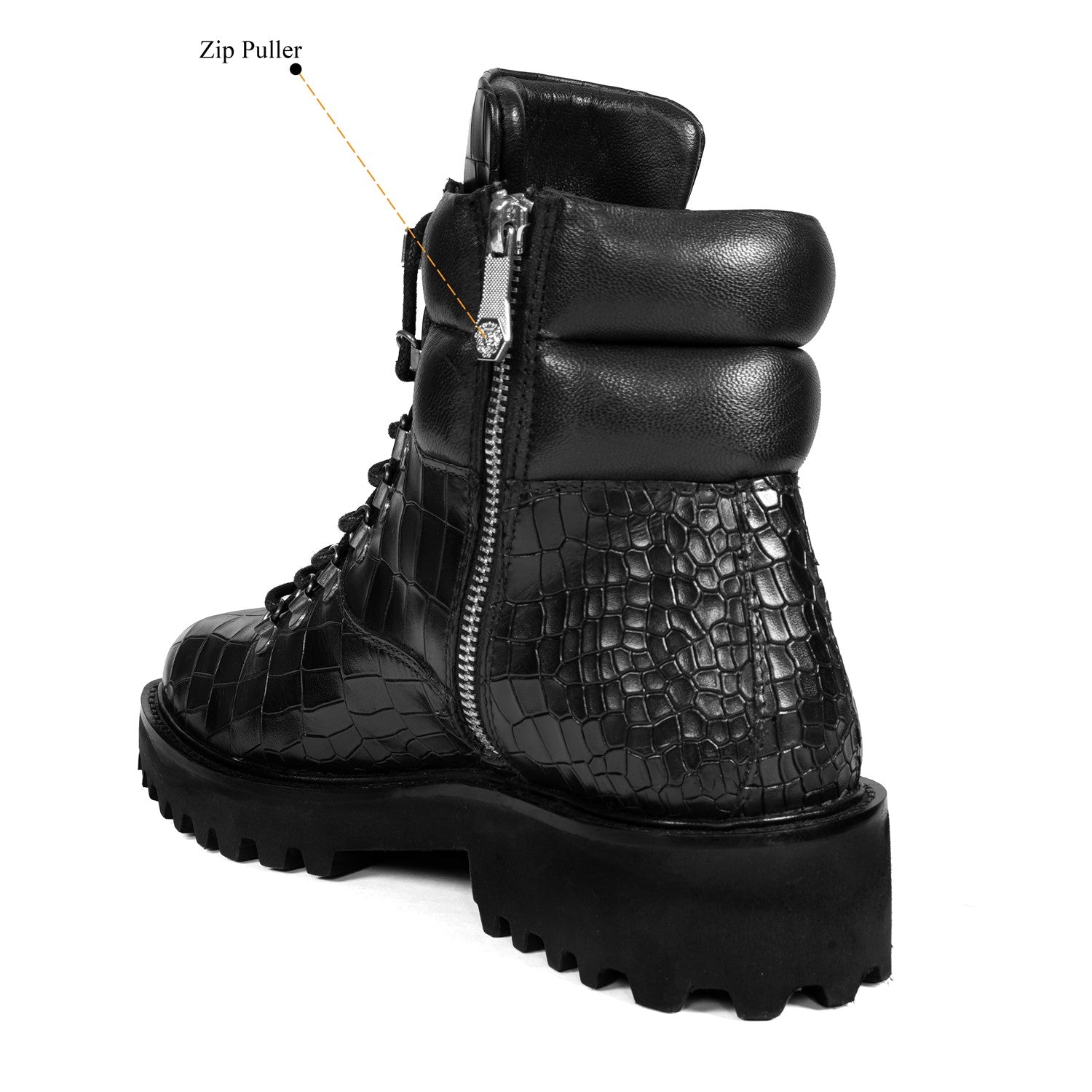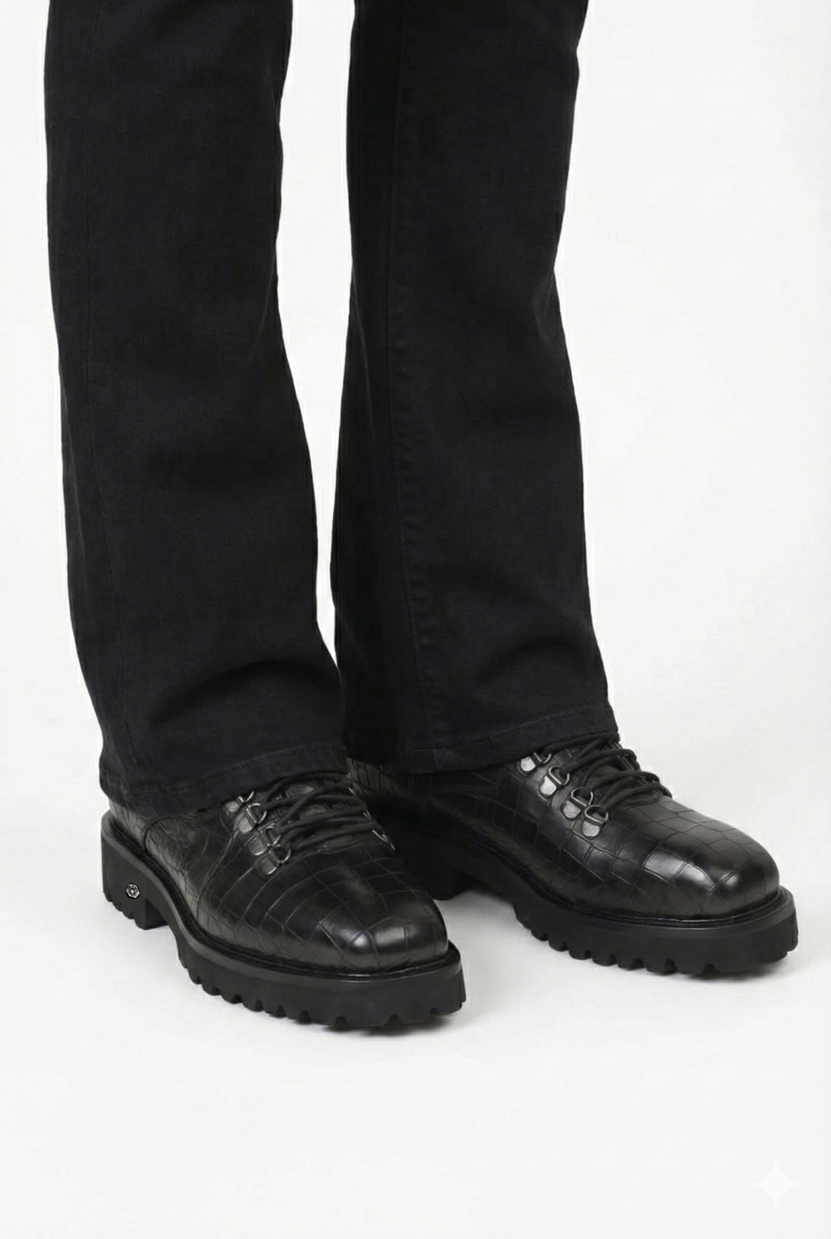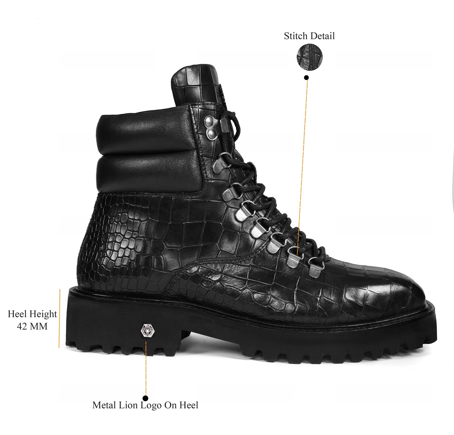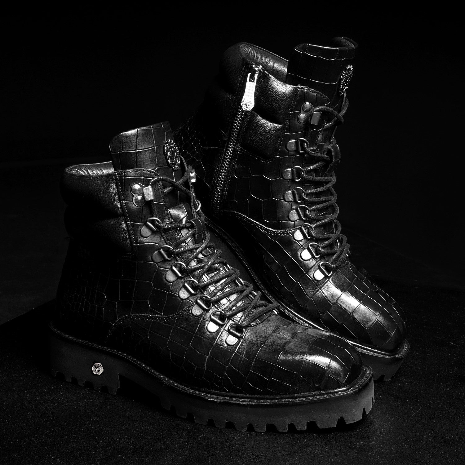 Luxury Black High-Top Croco Embossed Leather Chunky Boots