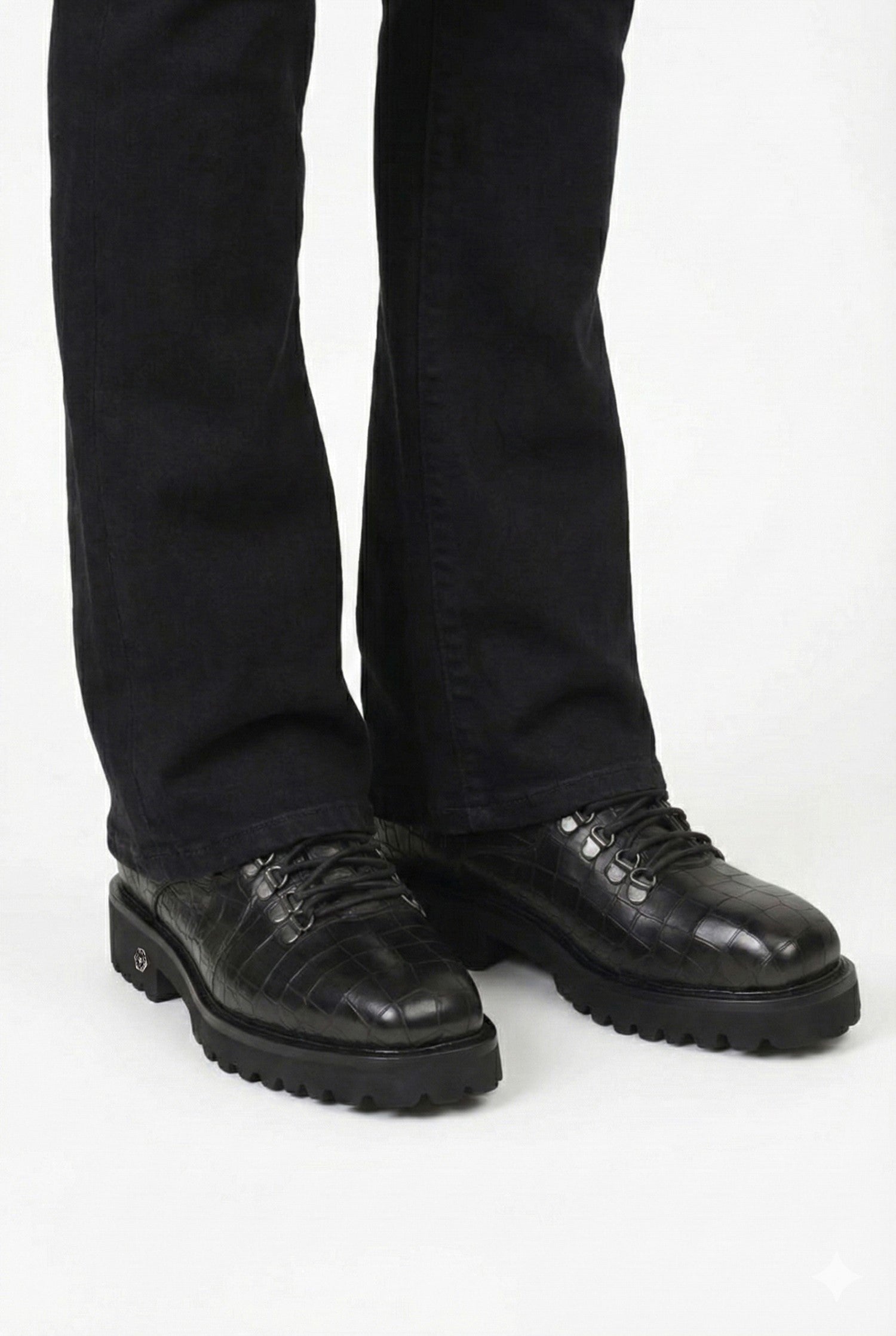 These premium black chunky boots by Brune & Bareskin are crafted from full-grain croco embossed leather, offering a luxurious feel with exceptional durability.