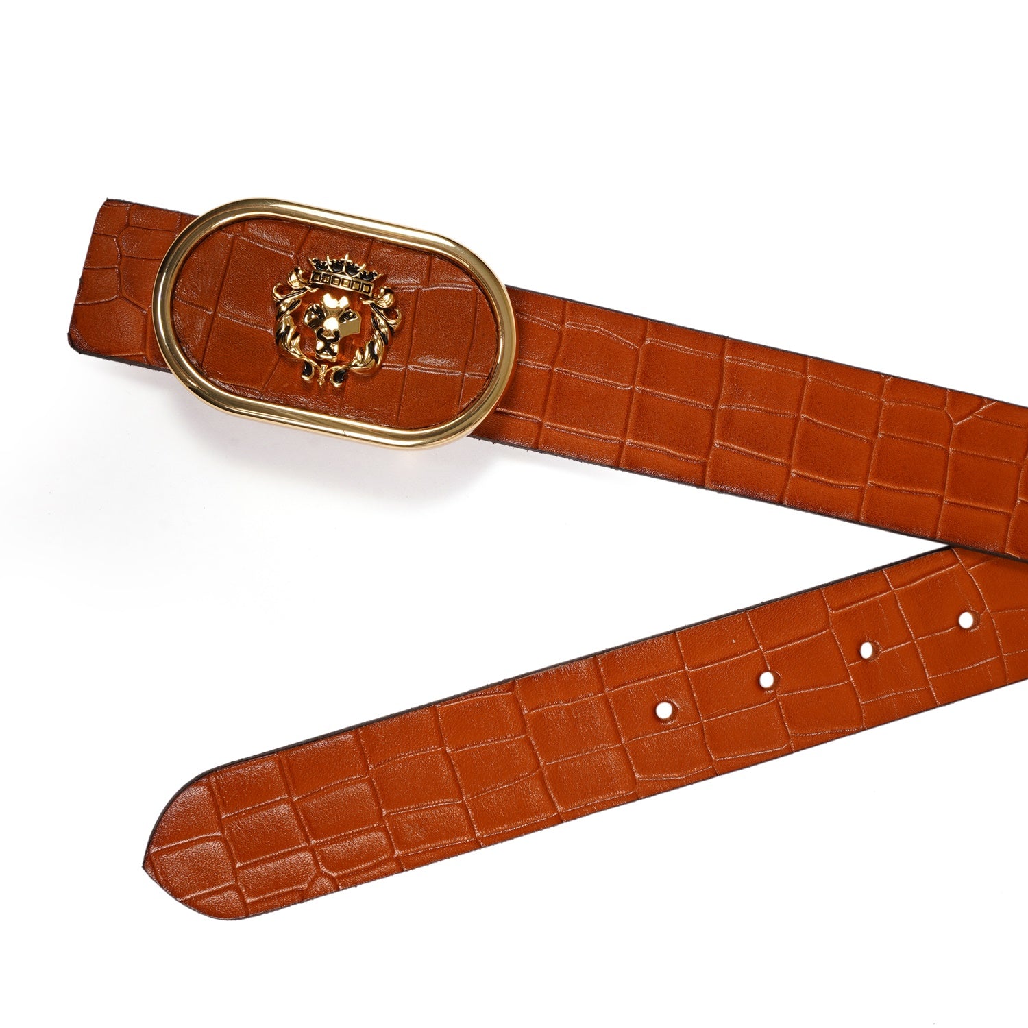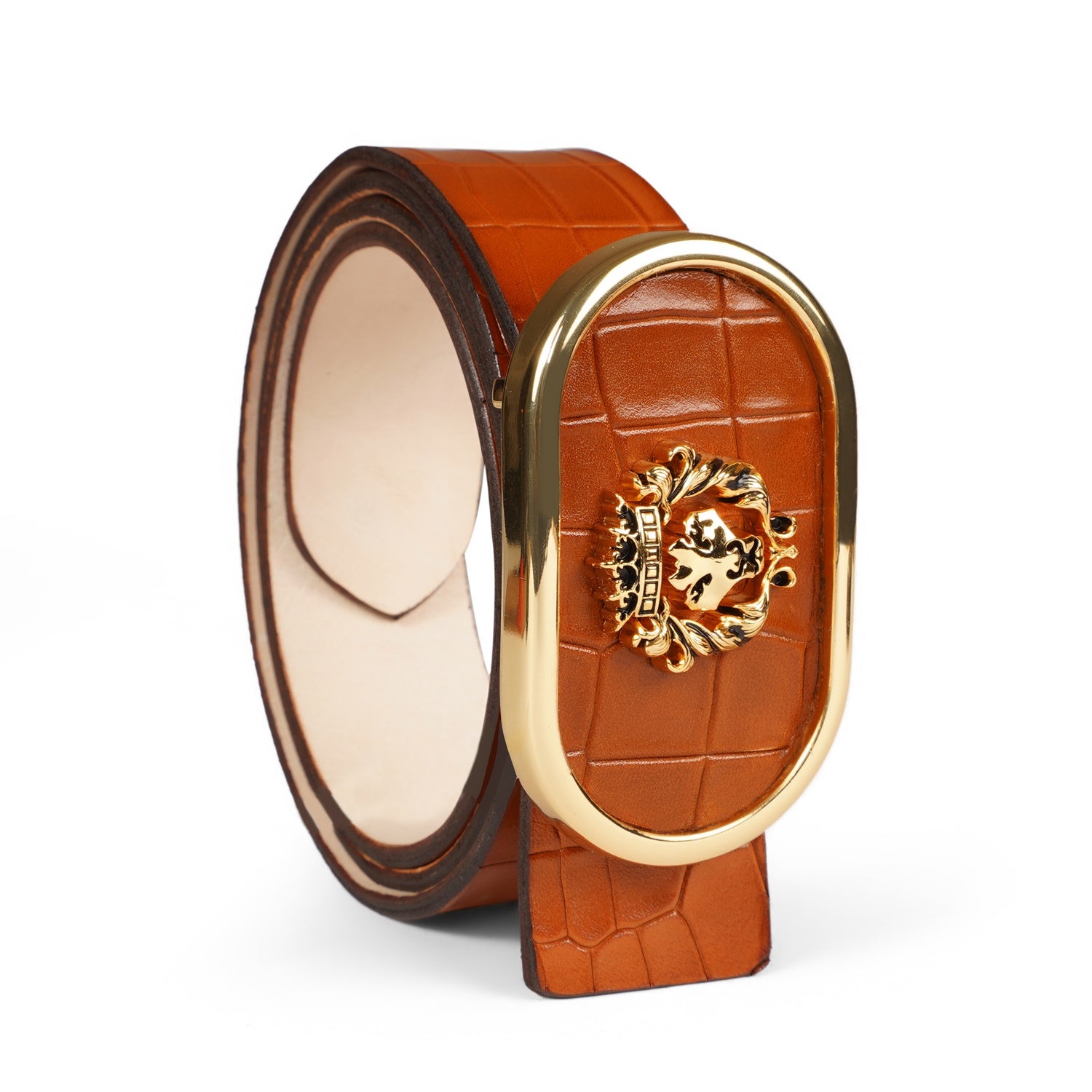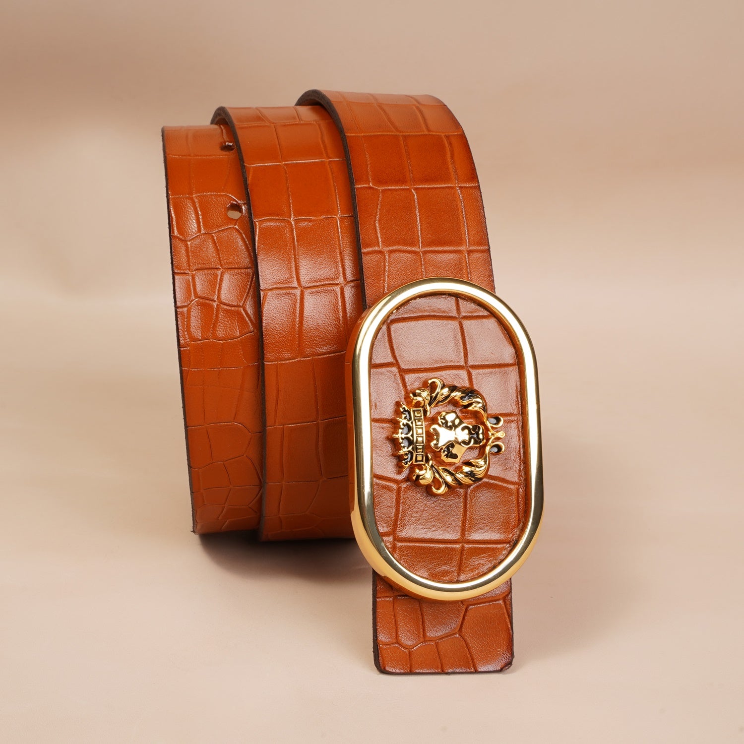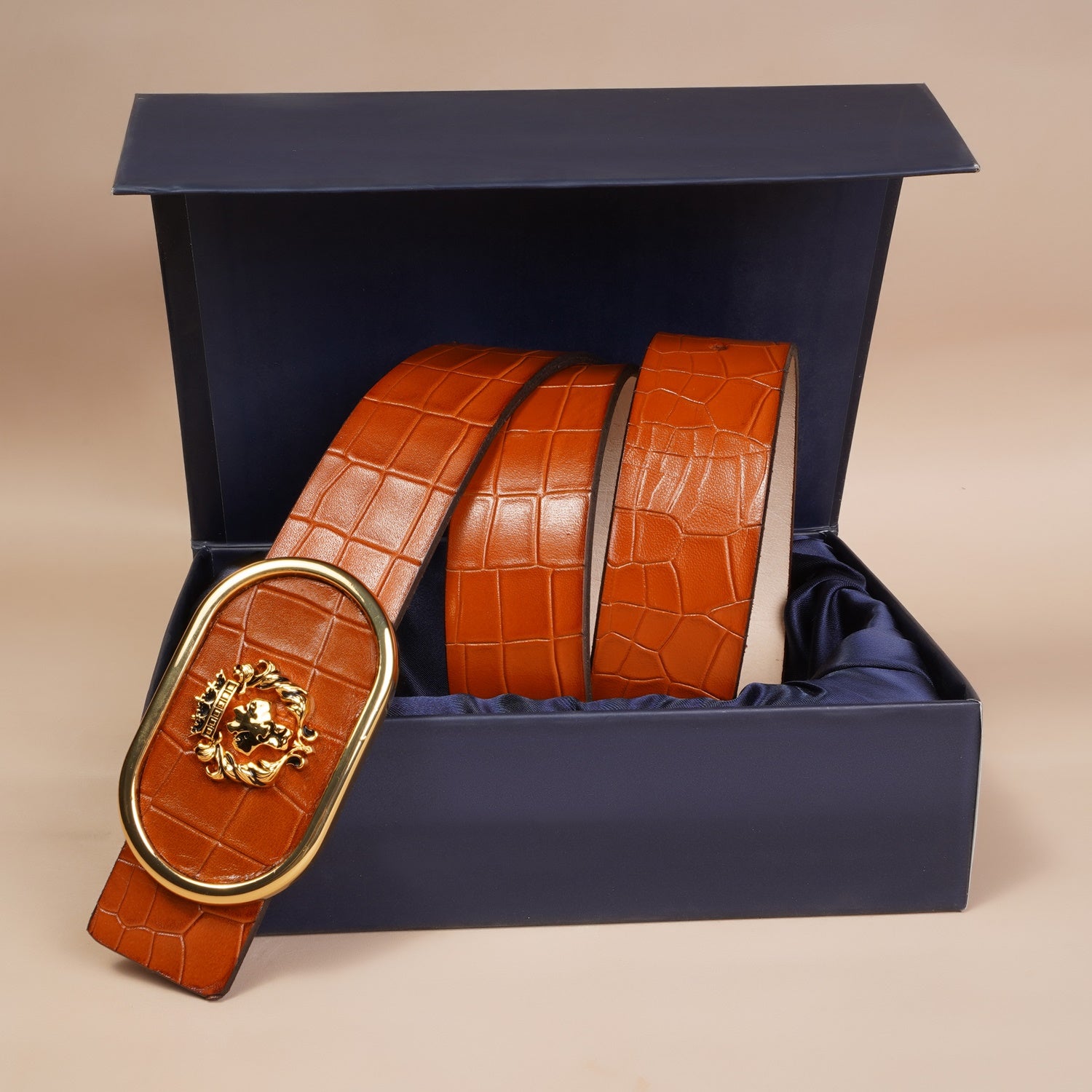 Luxury Tan Croco Textured Leather Formal Golden Buckle Belt