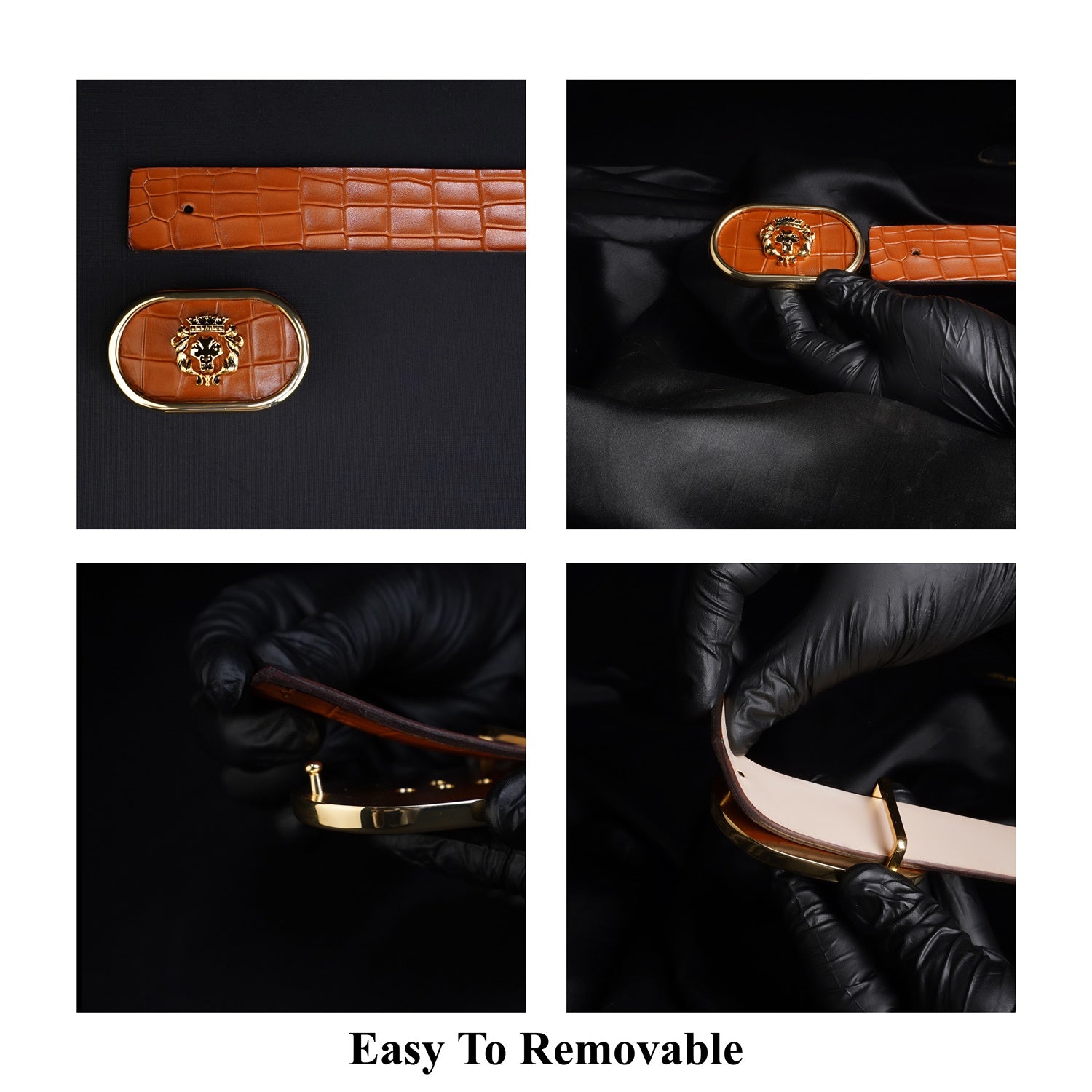 At the heart of this belt is its exquisite golden finished oval buckle, featuring a Brune & Bareskin lion emblem that symbolizes power, strength, and prestige. The liquid-finish gold-tone frame adds a touch of opulence, making it a standout piece for both formal and casual occasions. Designed for versatility, removable buckle with adjustable strap ensures a comfortable and perfect fit, making it a staple accessory for those who seek luxury in every detail.