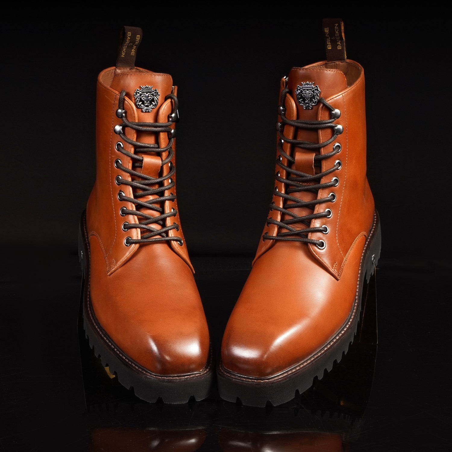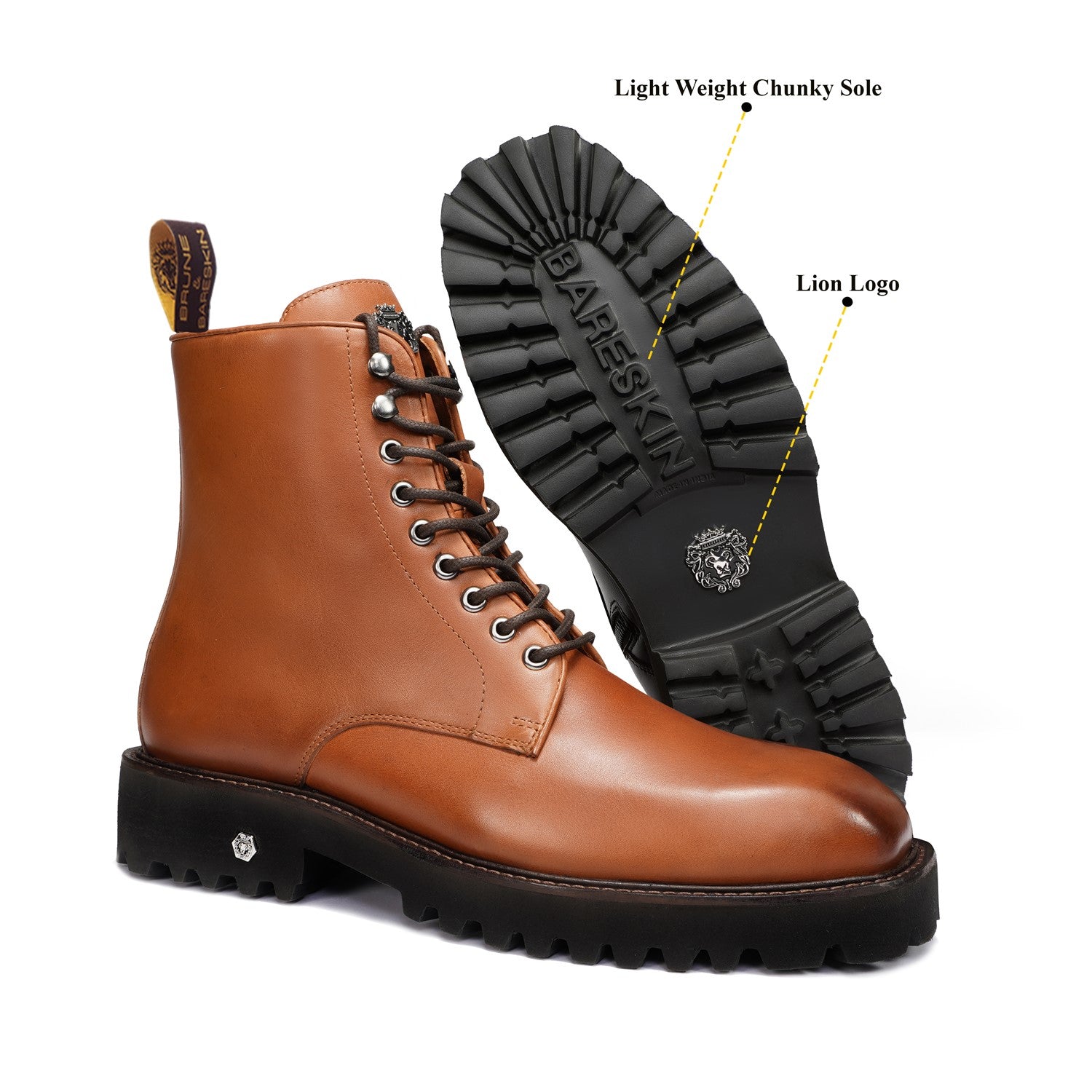 These premium tan chunky boots by Brune & Bareskin are crafted from full-grain leather, offering a luxurious feel with exceptional durability.