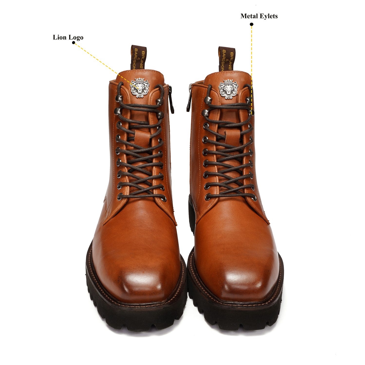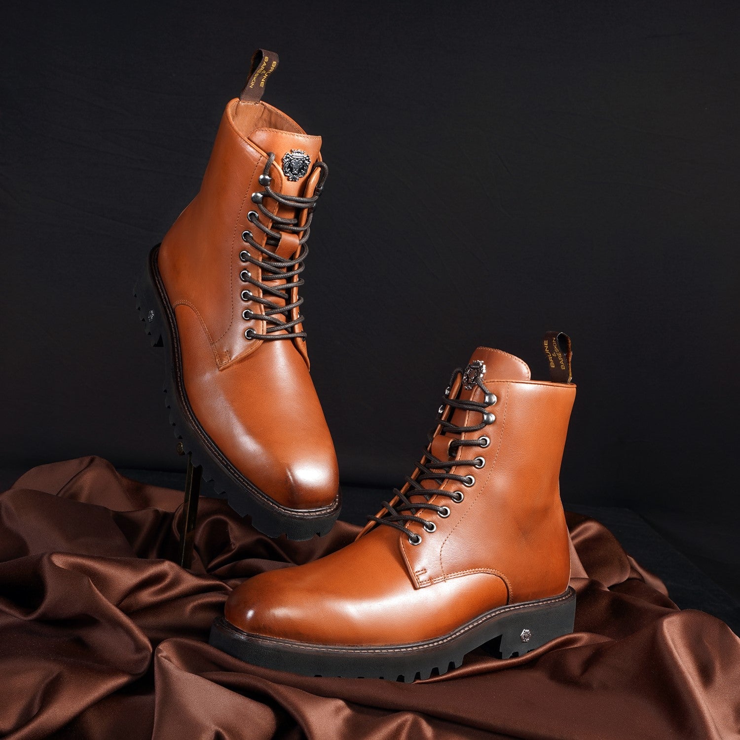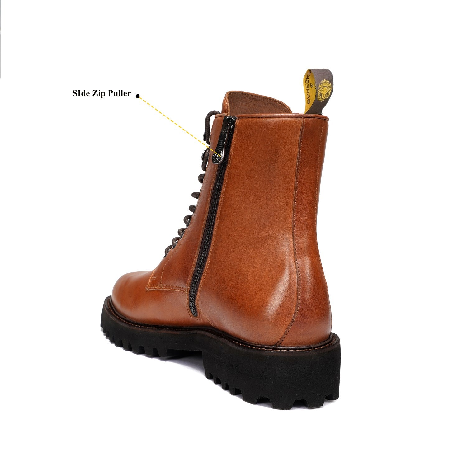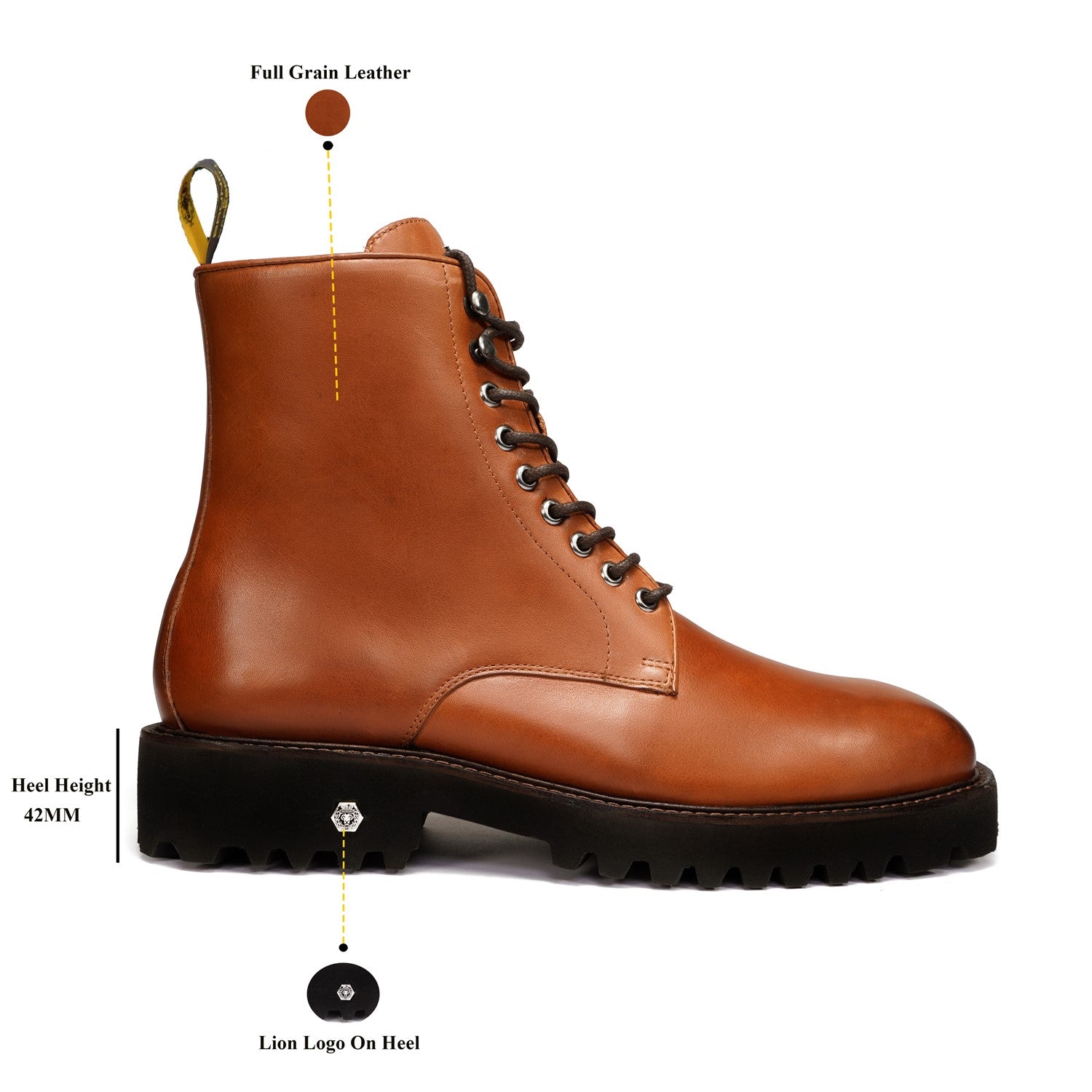 Designed for both rugged performance and sophisticated style, the boots feature metal eyelets and structured laces that provide a secure fit and a bold look. The side zipper ensures easy wearability without compromising the classic lace-up aesthetic. Built with a lightweight chunky sole, these boots provide superior grip and all-day comfort, making them ideal for urban streets or long hours on foot. The signature lion logo detailing on the heel and tongue stands as a mark of heritage, power, and craftsmanship. With a heel height of 42MM, these boots add subtle elevation while maintaining stability.