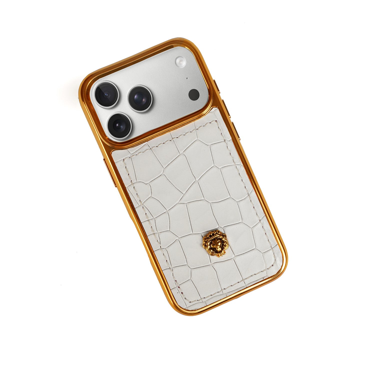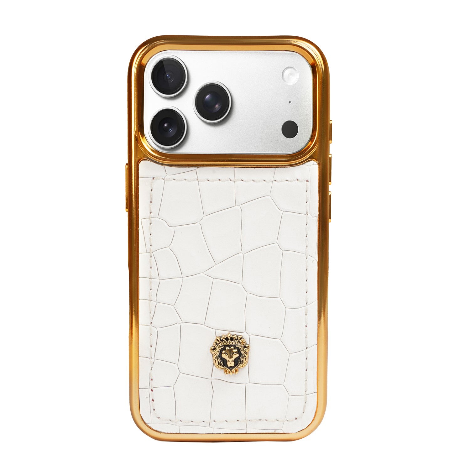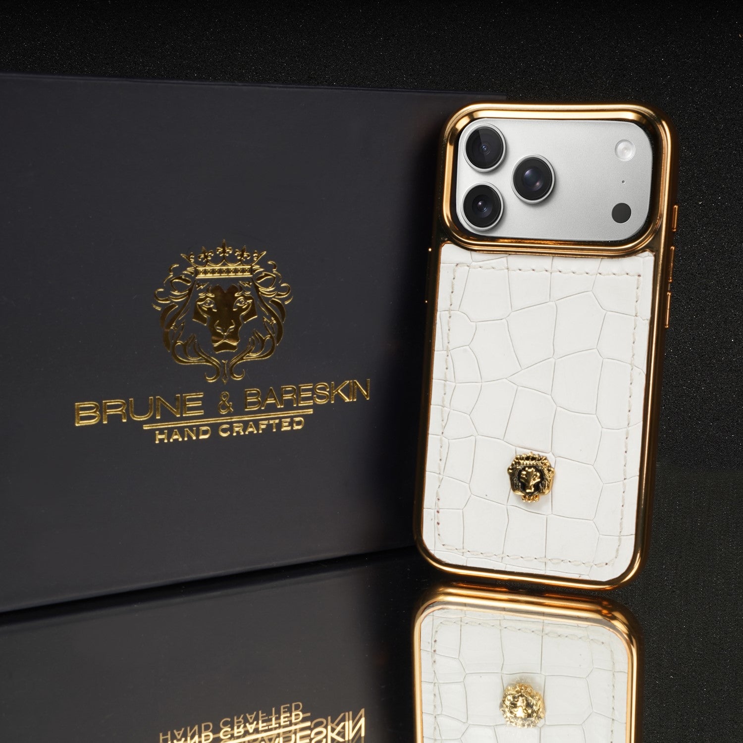 Experience the essence of true luxury with this handcrafted iPhone 17 Pro series case. Wrapped in premium white croco-textured leather, it exudes sophistication and timeless elegance. The sleek golden finish frame adds a touch of opulence, while the iconic Brune & Bareskin lion logo crowns the design with regal charm. Meticulously crafted to perfection, this case is more than just protection—it is a bold style statement that reflects class, power, and individuality.
