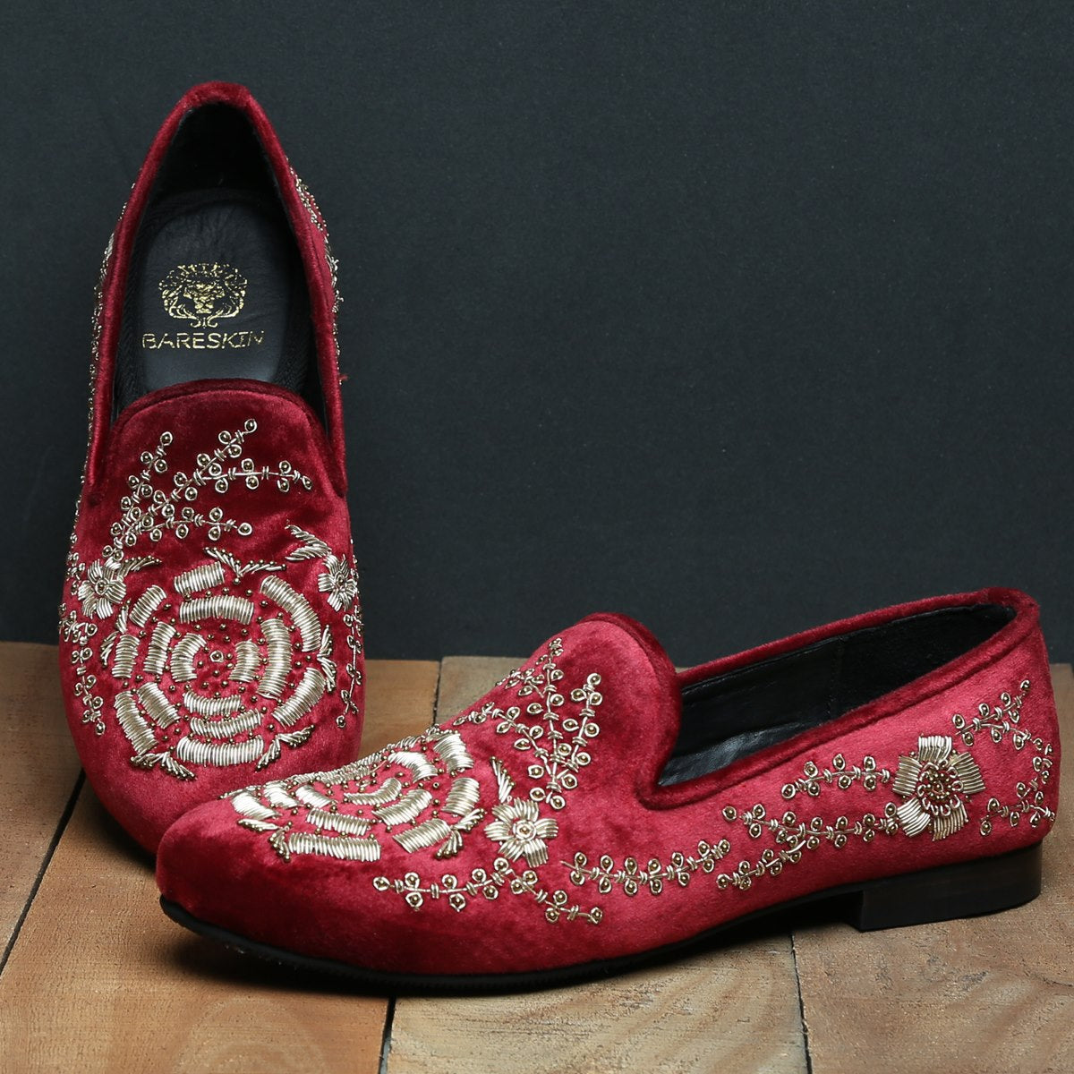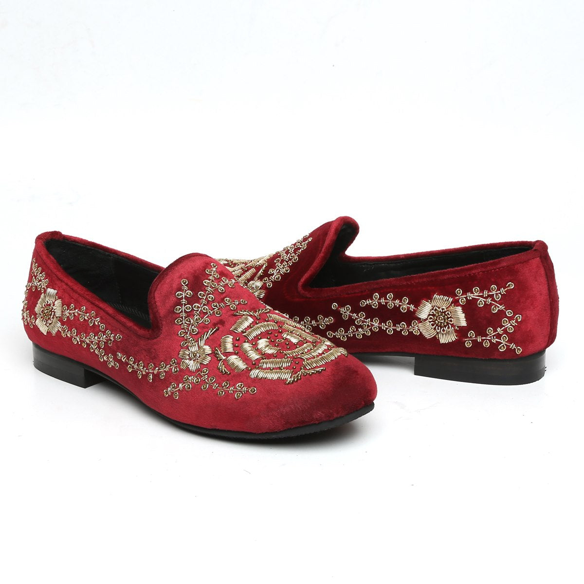 Golden Zardosi-Embroidered Slip-On Shoes in Maroon Italian Velvet