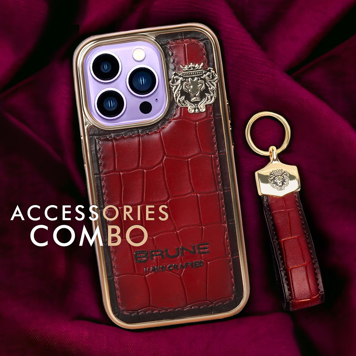 Complete your look with this chic, matching combo pack of a wine deep-cut croco textured leather mobile cover and key-Chain! Accented with a golden finish rim, Brune & Bareskin provides a unique and fashionable way to carry your essentials with you. Be stylish and organized - get the set today. You can customize this further in your favorite color and also add the name initials. Our Bespoke service make it a perfect gifting combo for the gentlemen. What are you waiting for? You can click on CUSTOMIZE NOW Button (Just above the "ADD TO CART" button) & fill the form to submit your customization requirements. Or you can reach us by Call, Email, WhatsApp, and DM.