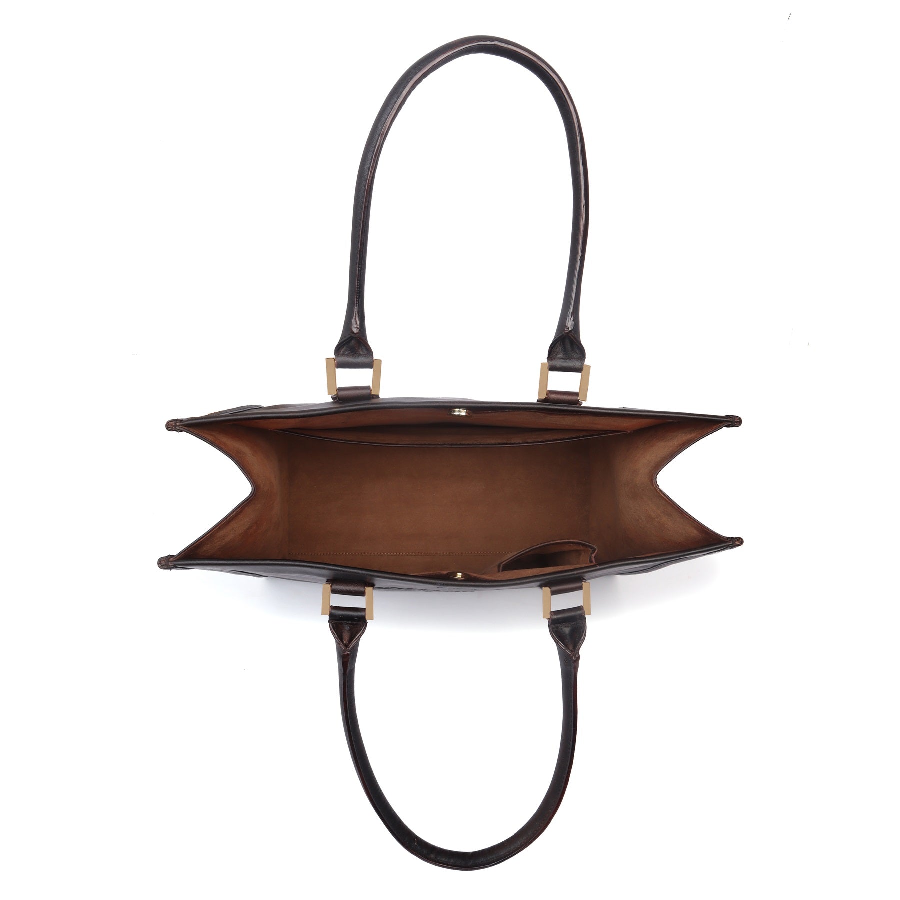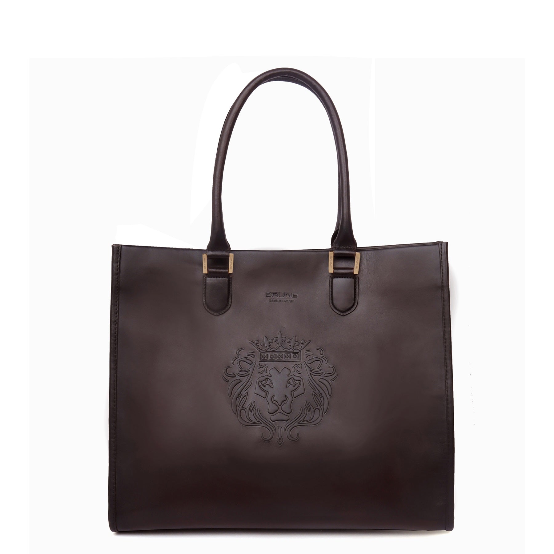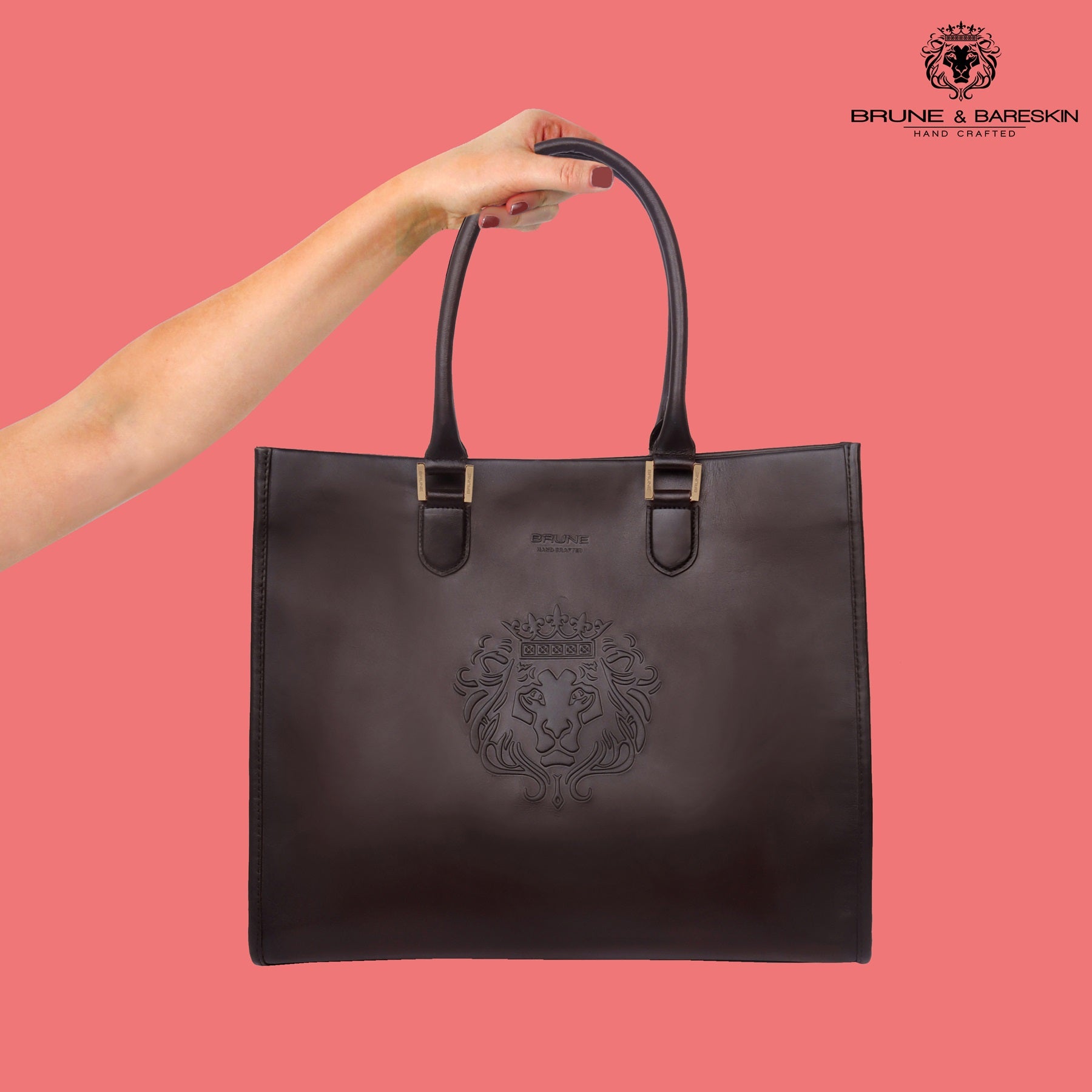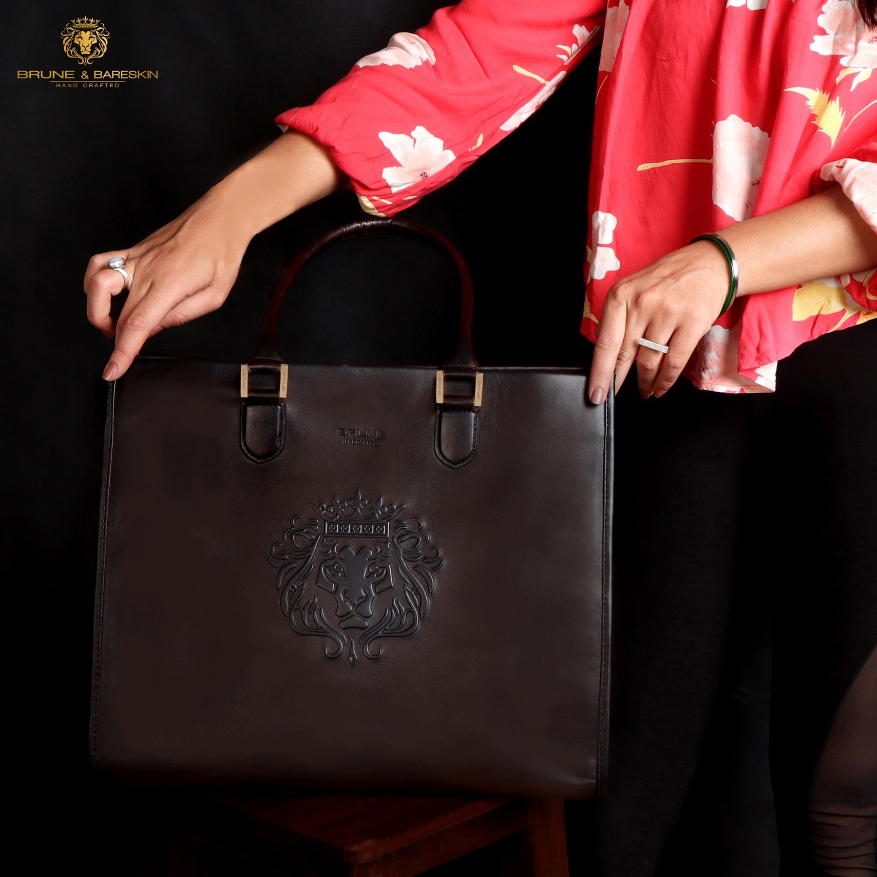 Medium Sized Dark Brown Genuine Leather Women bag is one of the most easiest to carry along with spacious space. This trendsetter Genuine leather bag with Embossed Lion Logo on the front looks astonishing. It is perfect for a shopping. The ample space with multiple pockets allows it to carry for travelling. The main button compartment provides the extra security to it. This hand bag can be personalized with your name initials in any color shade and in any size with our bespoke services. This is a must-have addition to your fashion collection.