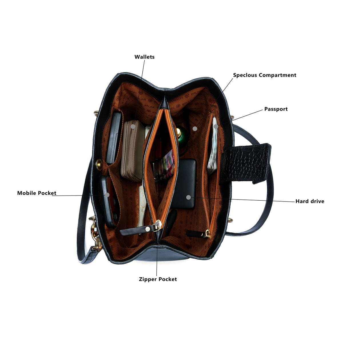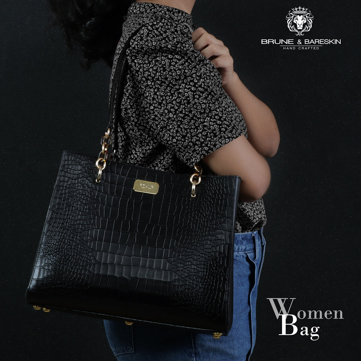 The black shade looks very classy in croco textured leather products. It is one of the most useful bags that a traveler needs. Medium sized black genuine leather women bag is one of the most easiest to carry along with spacious space. This trendsetter genuine leather bag with embossed lion logo on the front looks astonishing. The main button compartment provides the extra security to it and dual stylish leather handle and gold finish chain-Link. This trendsetter deep cut croco embossed leather bag with BRUNE golden metal logo on the front looks astonishing. Multiple easy-access pockets provide ample but convenient space to put traveling essentials. The different size pockets provide the advantage to put things accordingly.