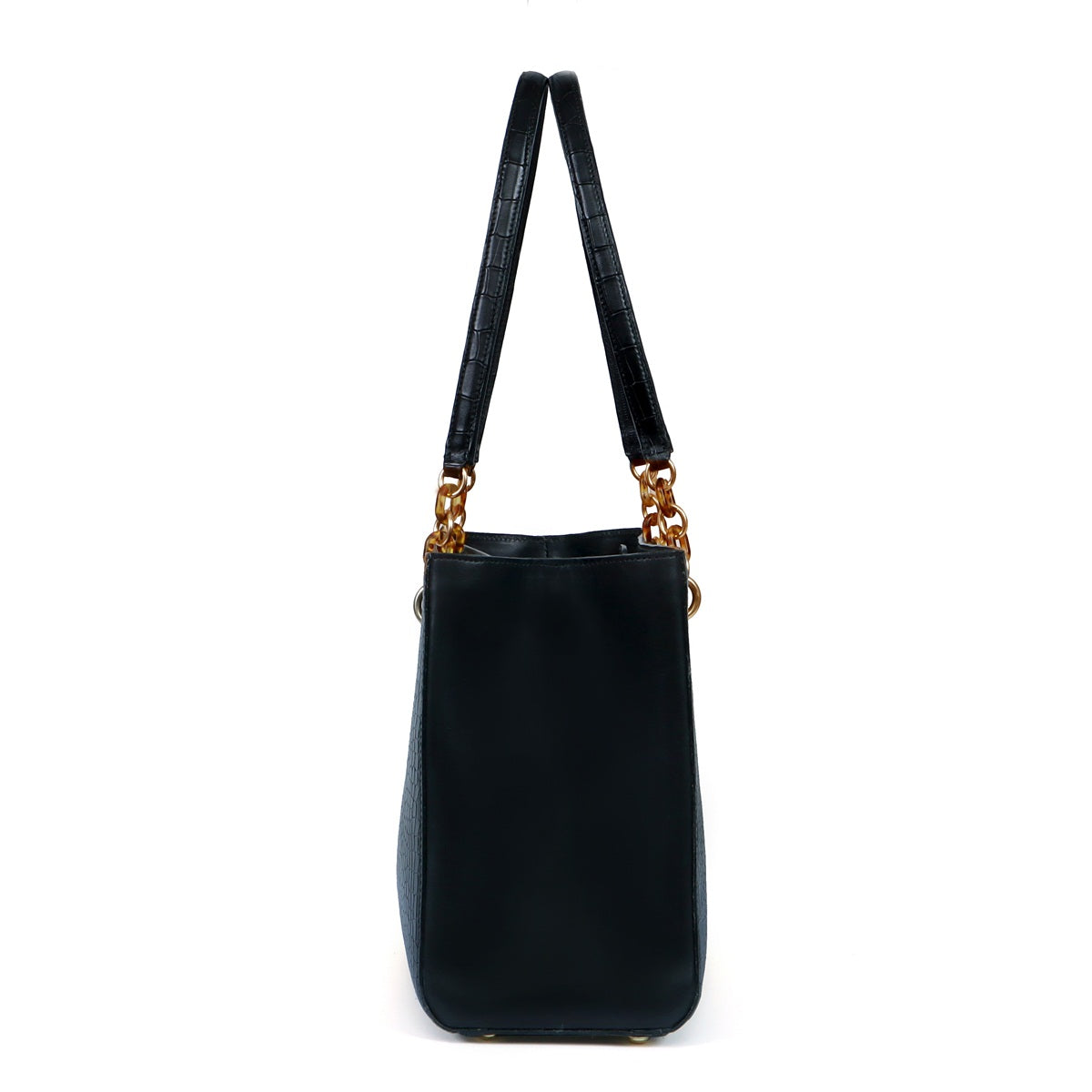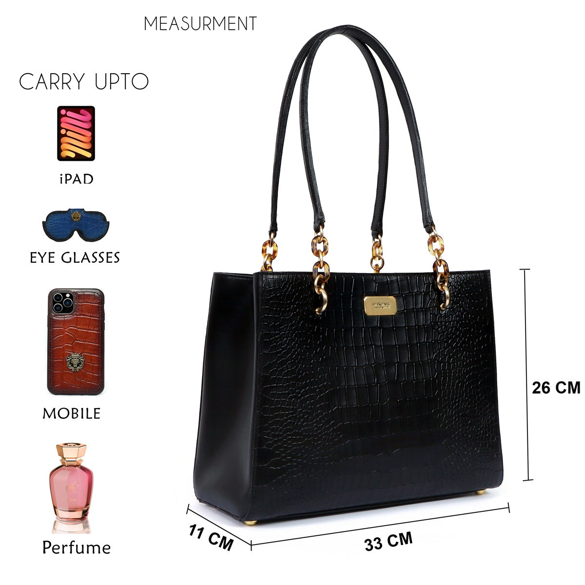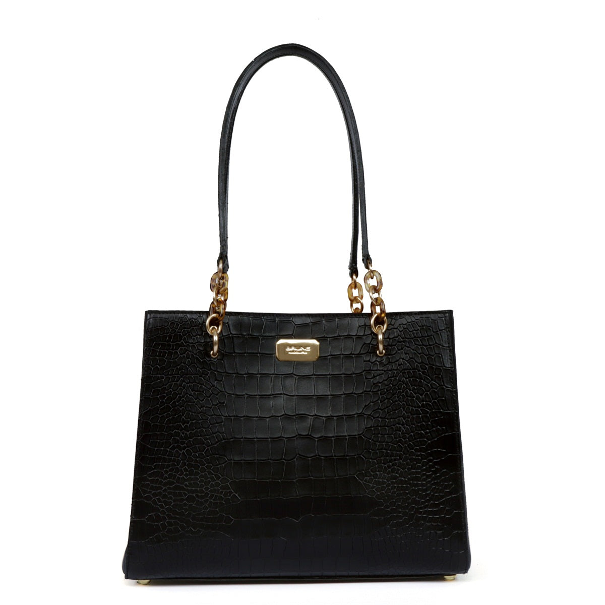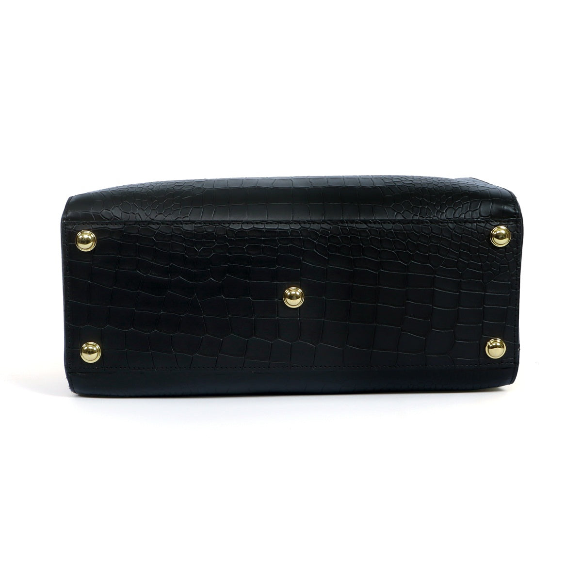 Medium Sized Hand Bag In Croco Deep Cut Textured Black Leather