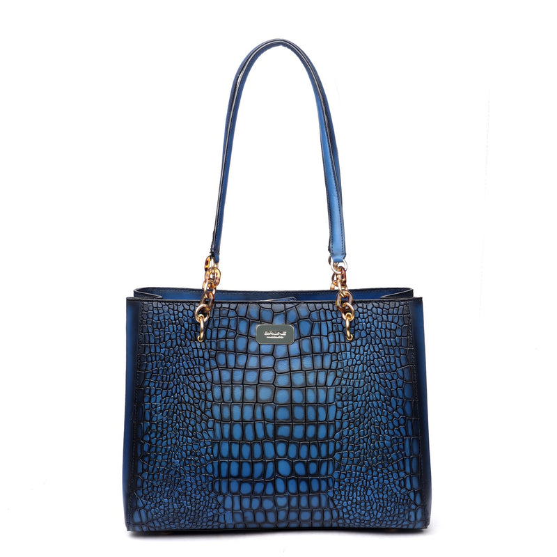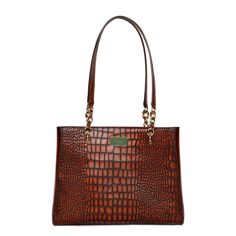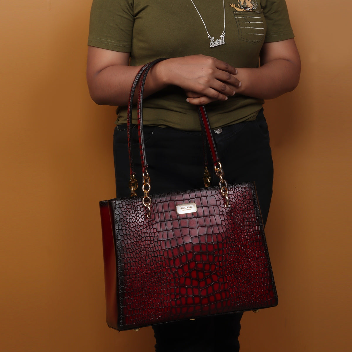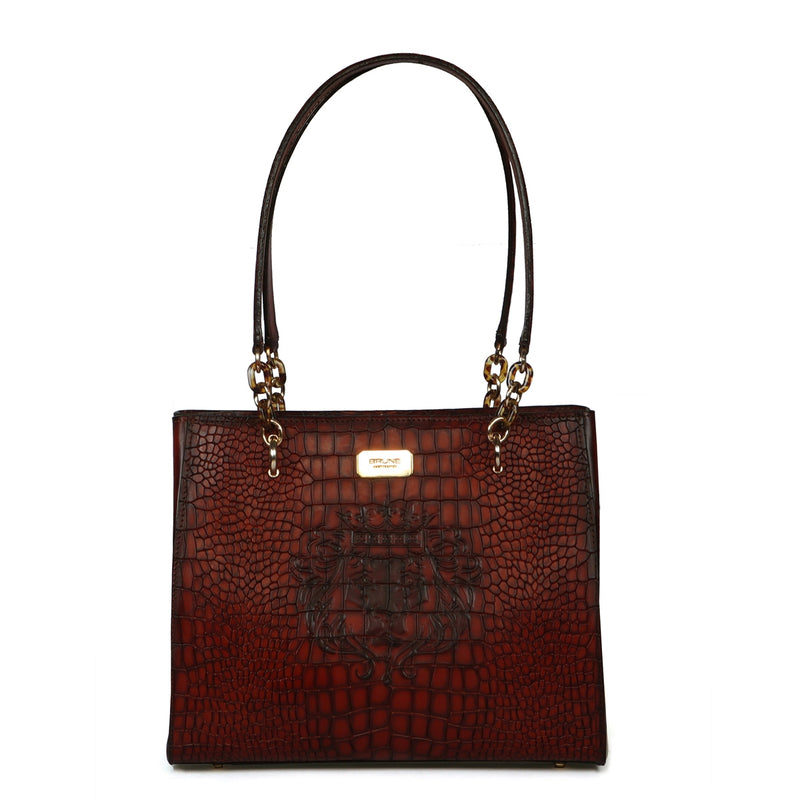 The smokey wine shade looks very classy in croco textured leather products. It is one of the most useful bags that a traveler needs. Medium sized wine genuine leather women bag is one of the most easiest to carry along with spacious space. This trendsetter genuine leather bag with embossed lion logo on the front looks astonishing. The main button compartment provides the extra security to it and dual stylish leather handle and gold finish chain-Link. This trendsetter deep cut croco embossed leather bag with BRUNE golden metal logo on the front looks astonishing. Multiple easy-access pockets provide ample but convenient space to put traveling essentials. The different size pockets provide the advantage to put things accordingly.