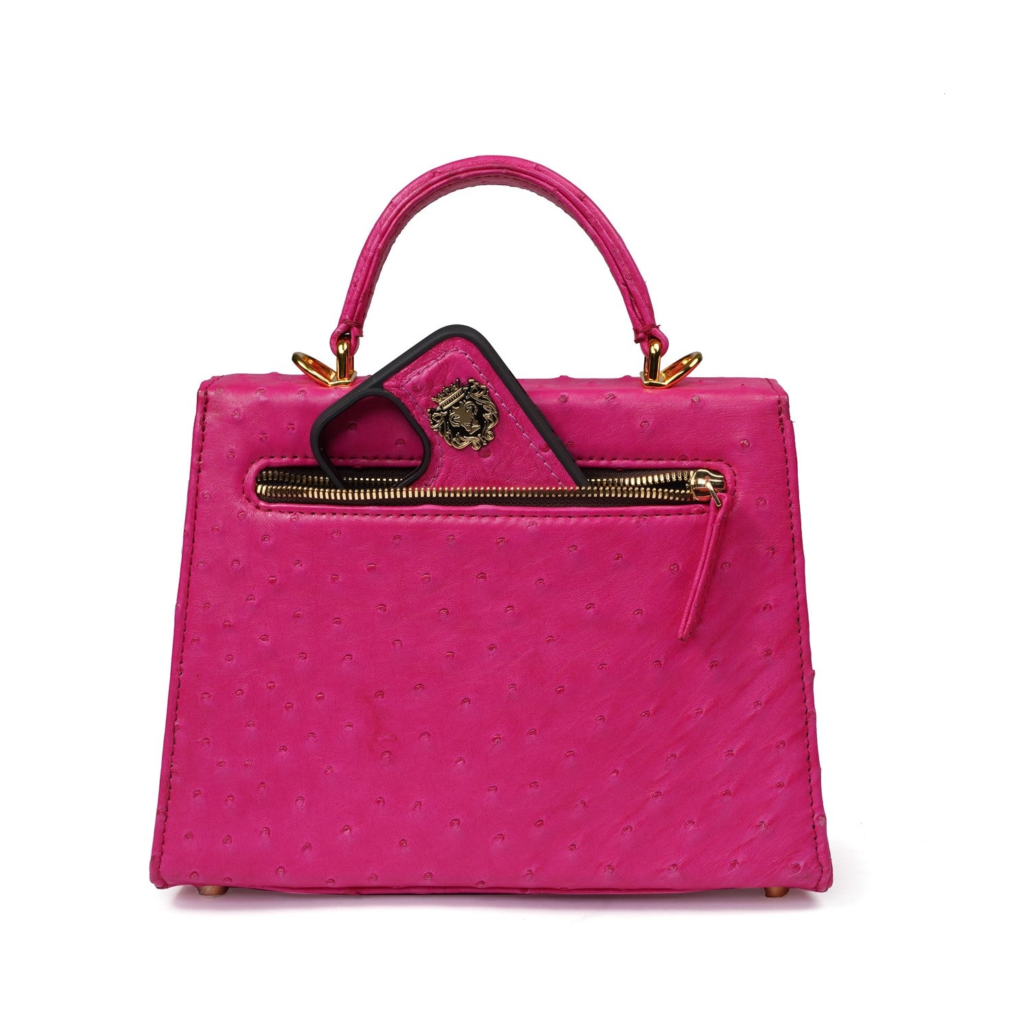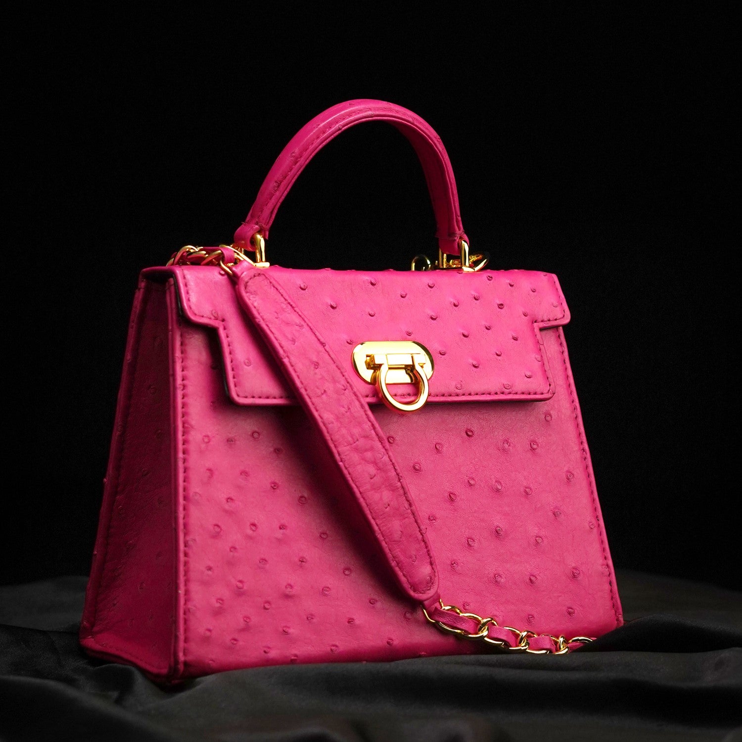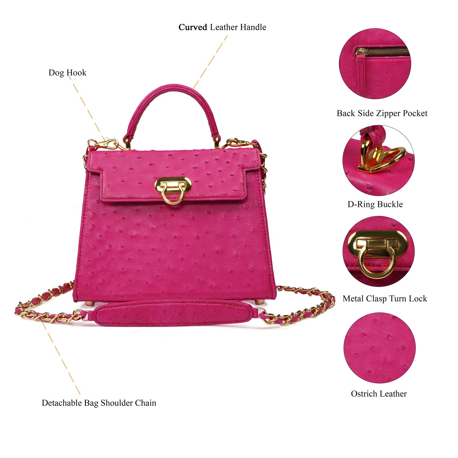 Crafted in genuine ostrich leather, this handbag features a curved leather handle for a comfortable hold and comes with a detachable leather-interwoven shoulder chain, allowing it to be carried as a handbag or crossbody with ease.